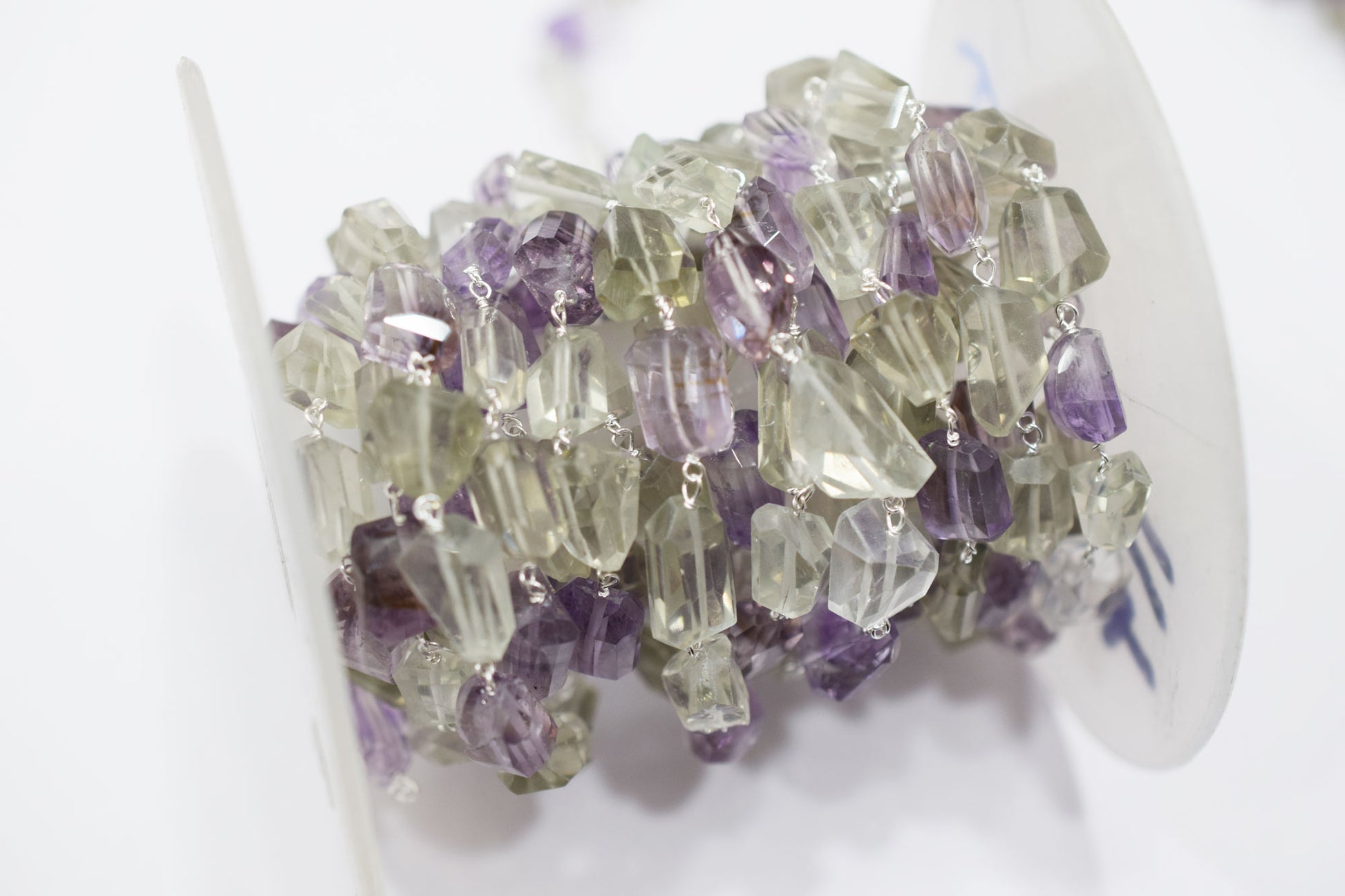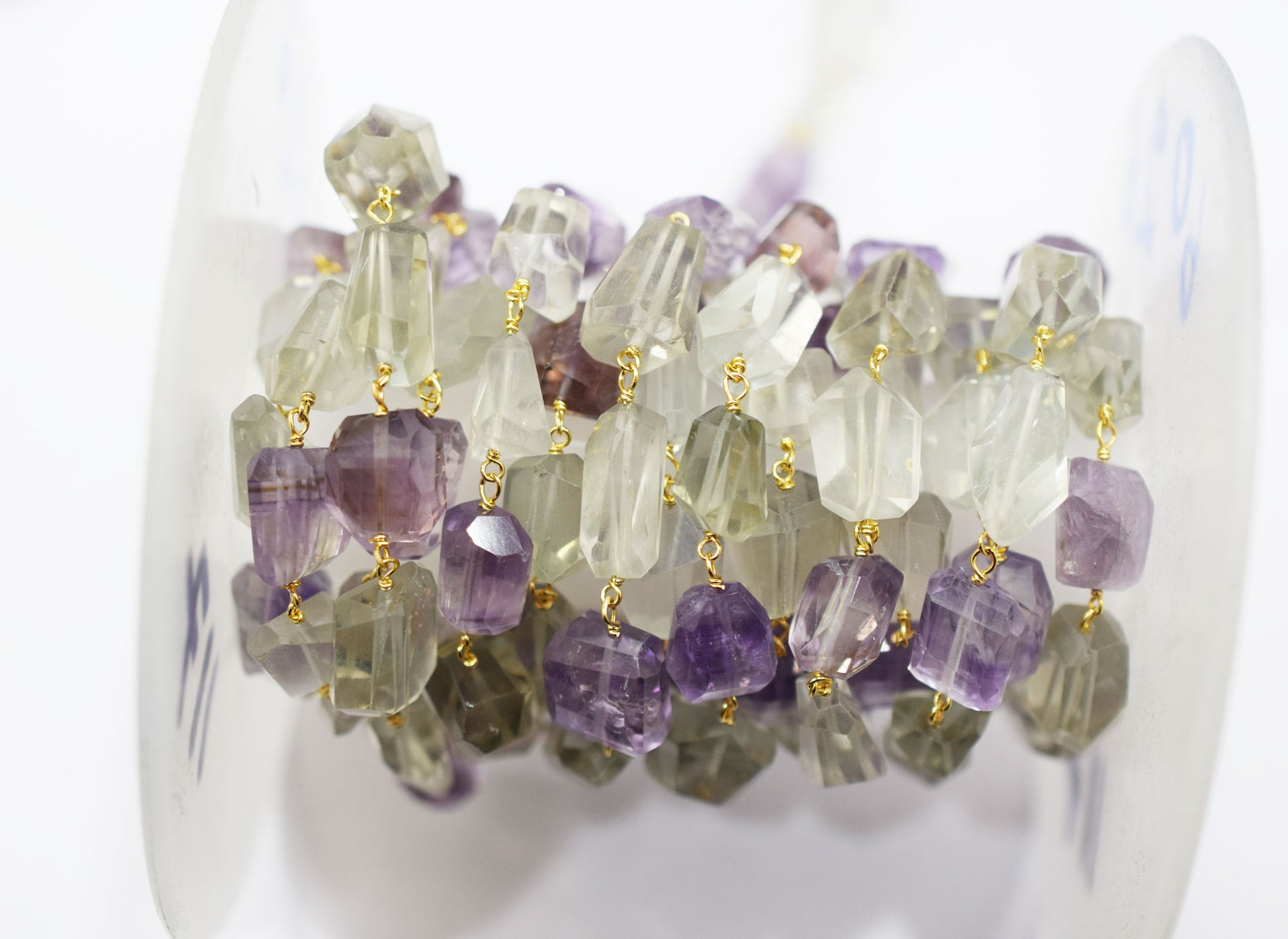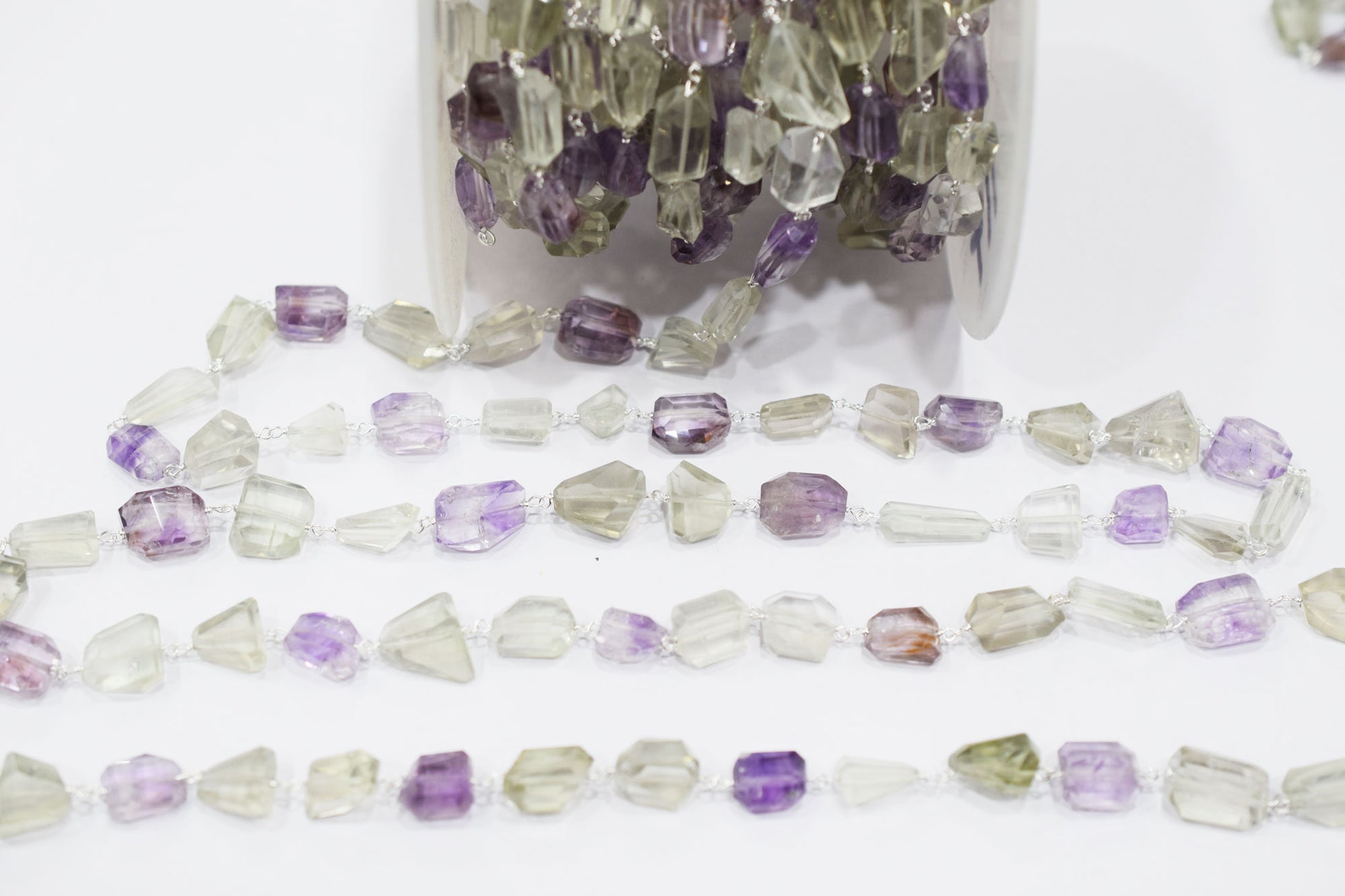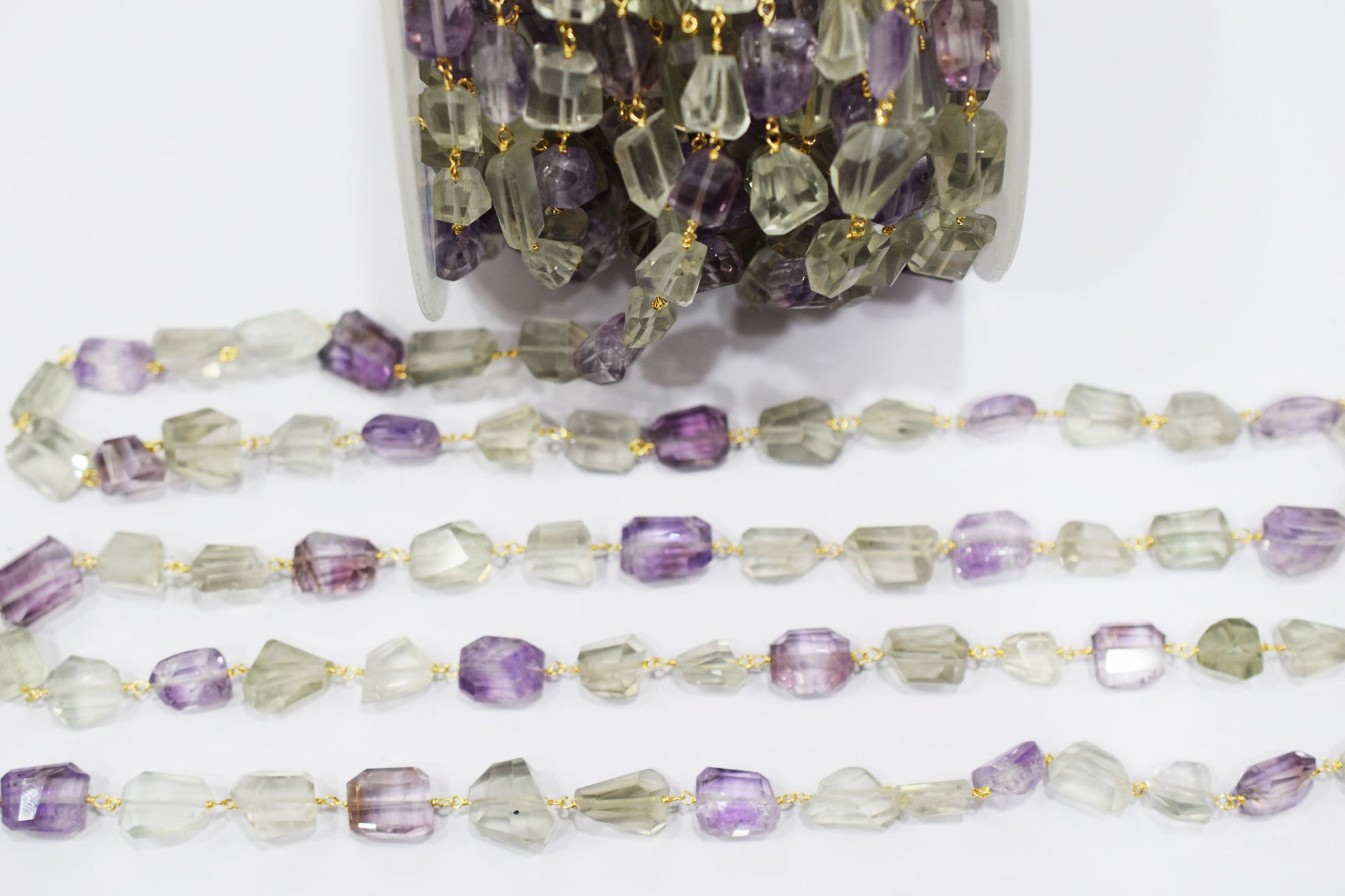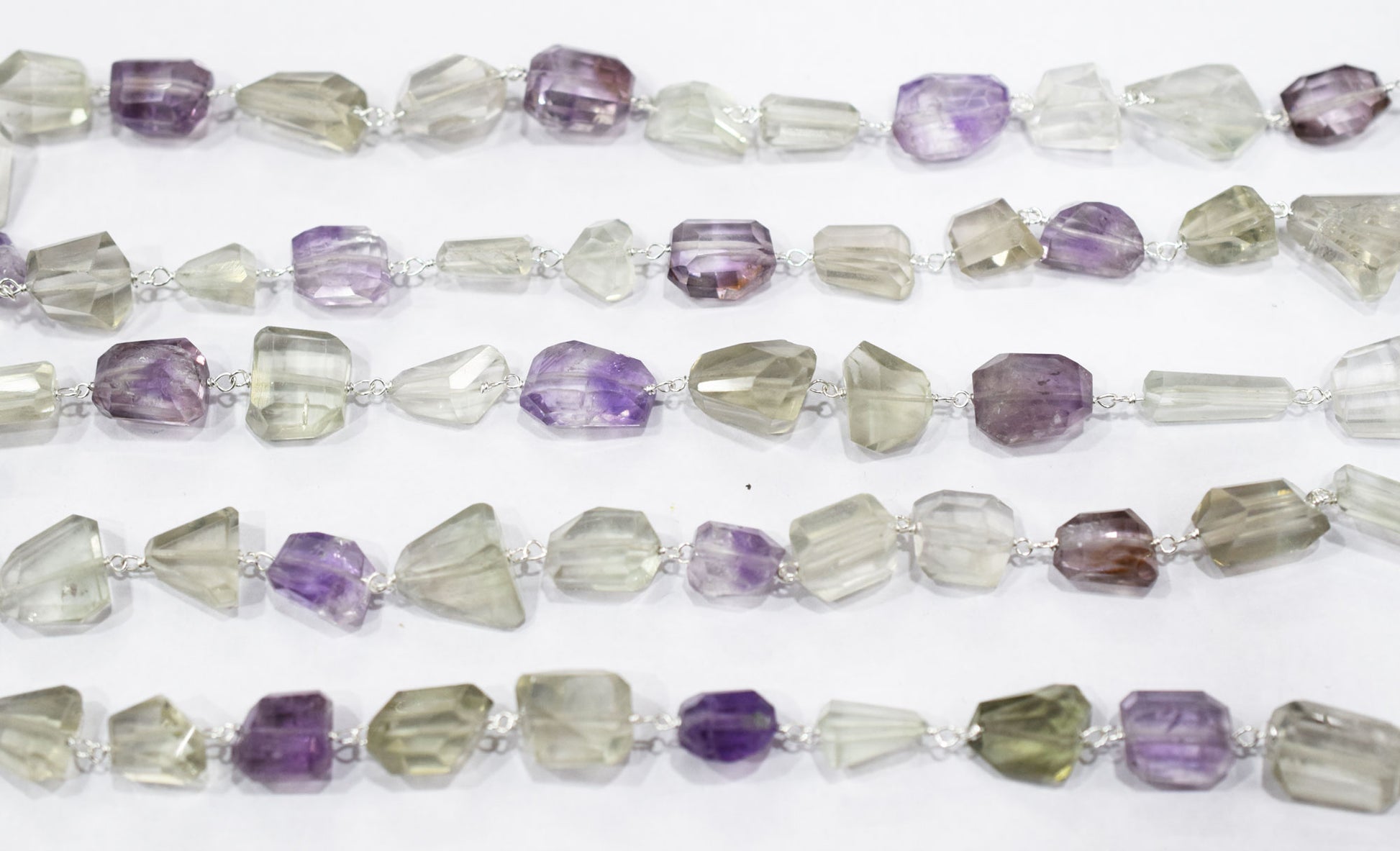 Pink Amethyst Faceted Laser Cut Nuggets Shape Rosary Beaded Chain , Green Amethyst Wire Wrapped Chain , 11 - 18 mm , RB-6574
