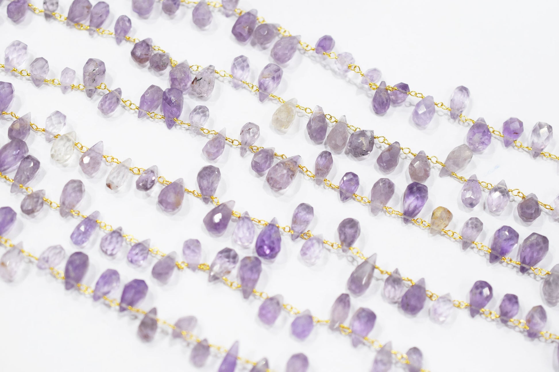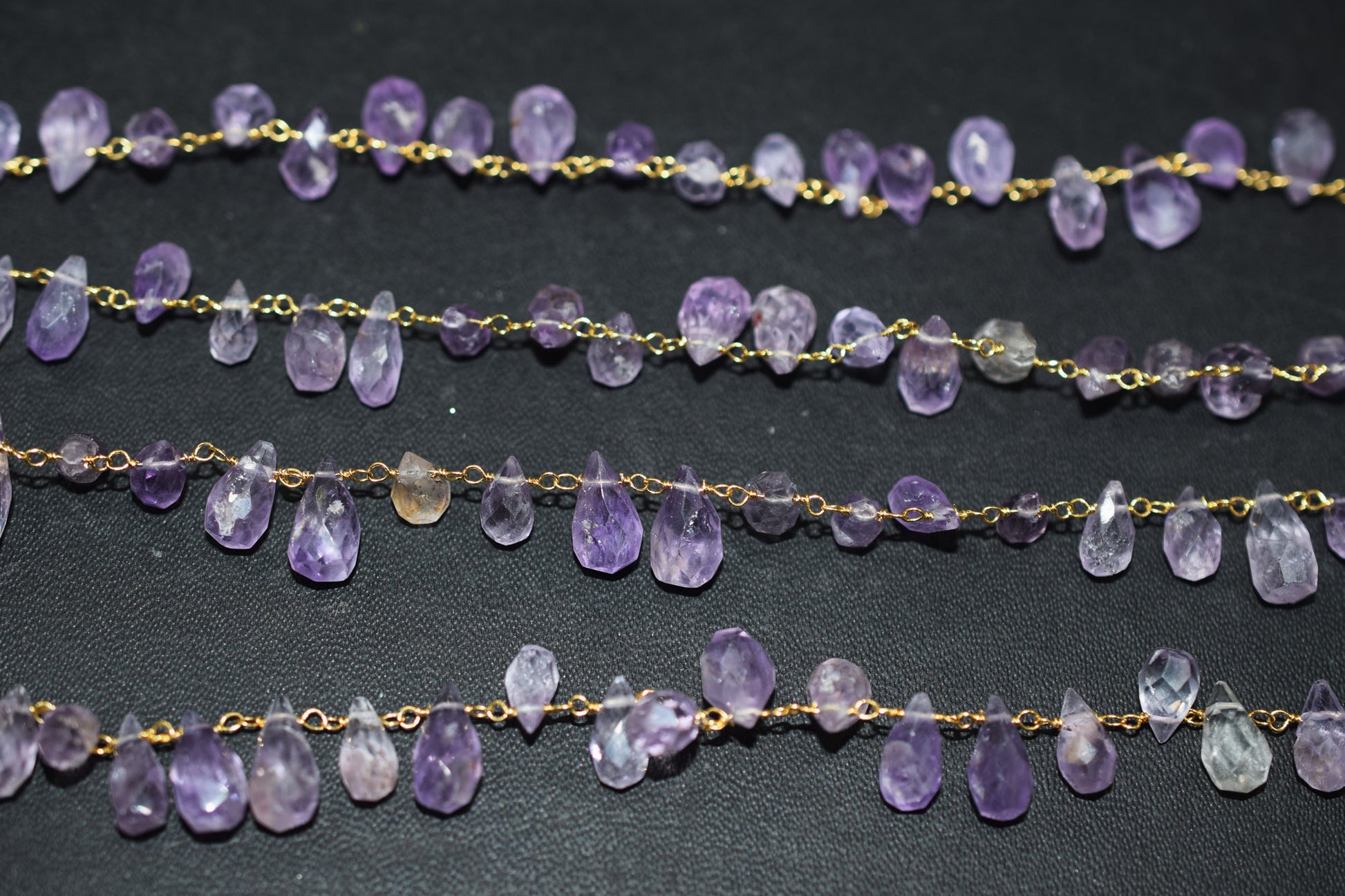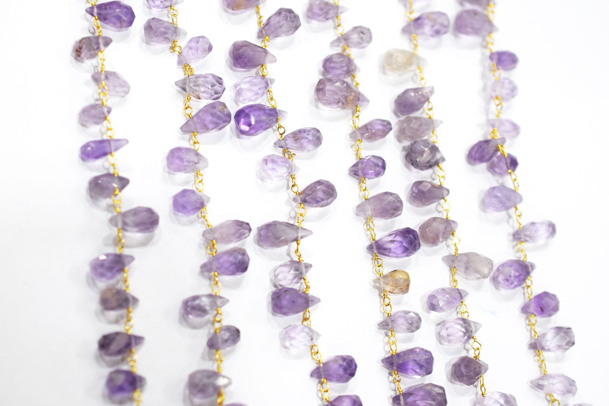 Pink Amethyst Hand Cut Drops Shape Rosary Beaded Chain , Pink Amethyst Faceted Wire Wrapped Chain , 8 mm , RB-6524
