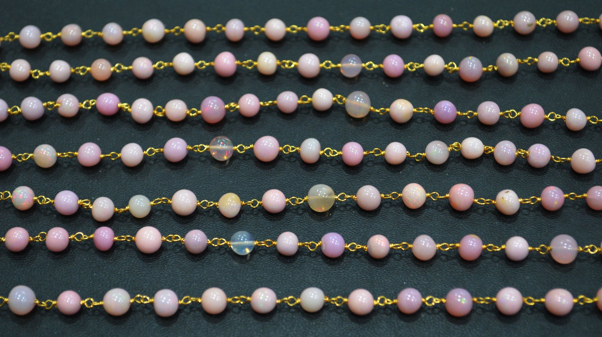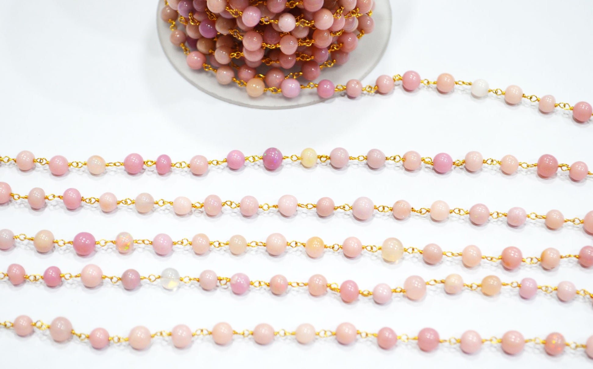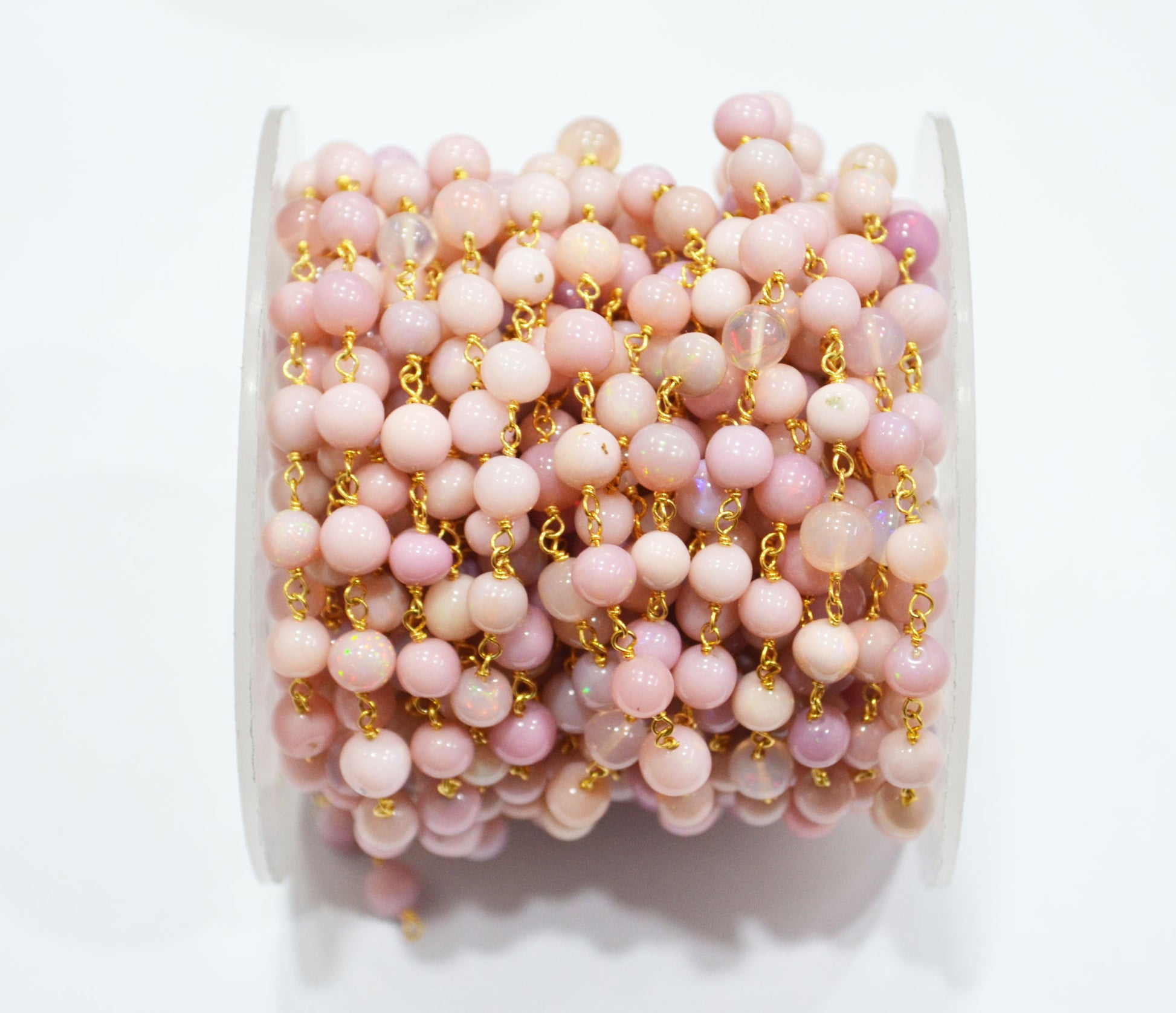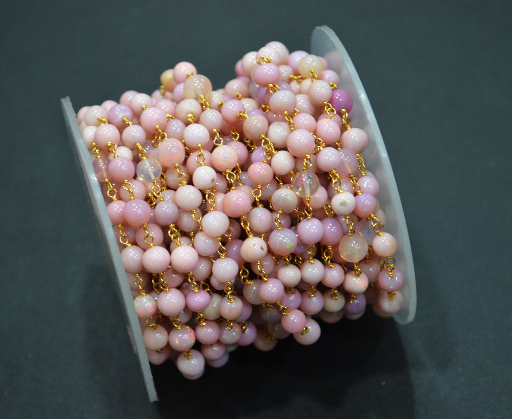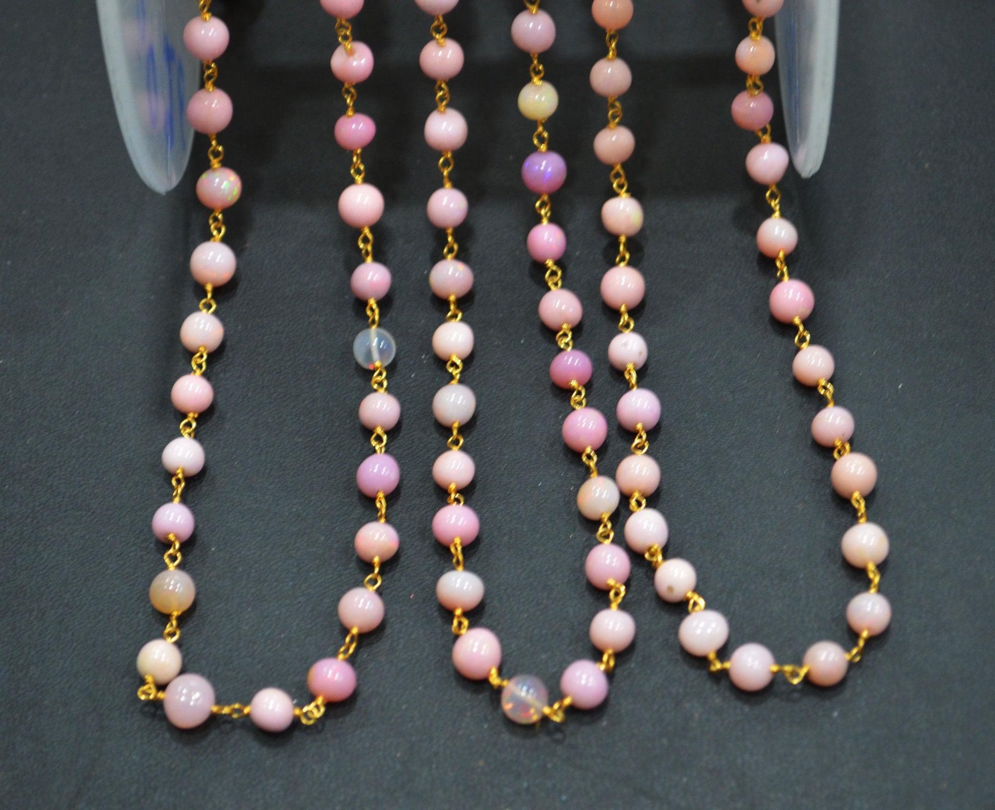Pink Ethiopian Opal Smooth Round Shape Rosary Beaded Chain , Pink Ethiopian Opal Wire Wrapped Chain , 5 - 6 mm , 6699