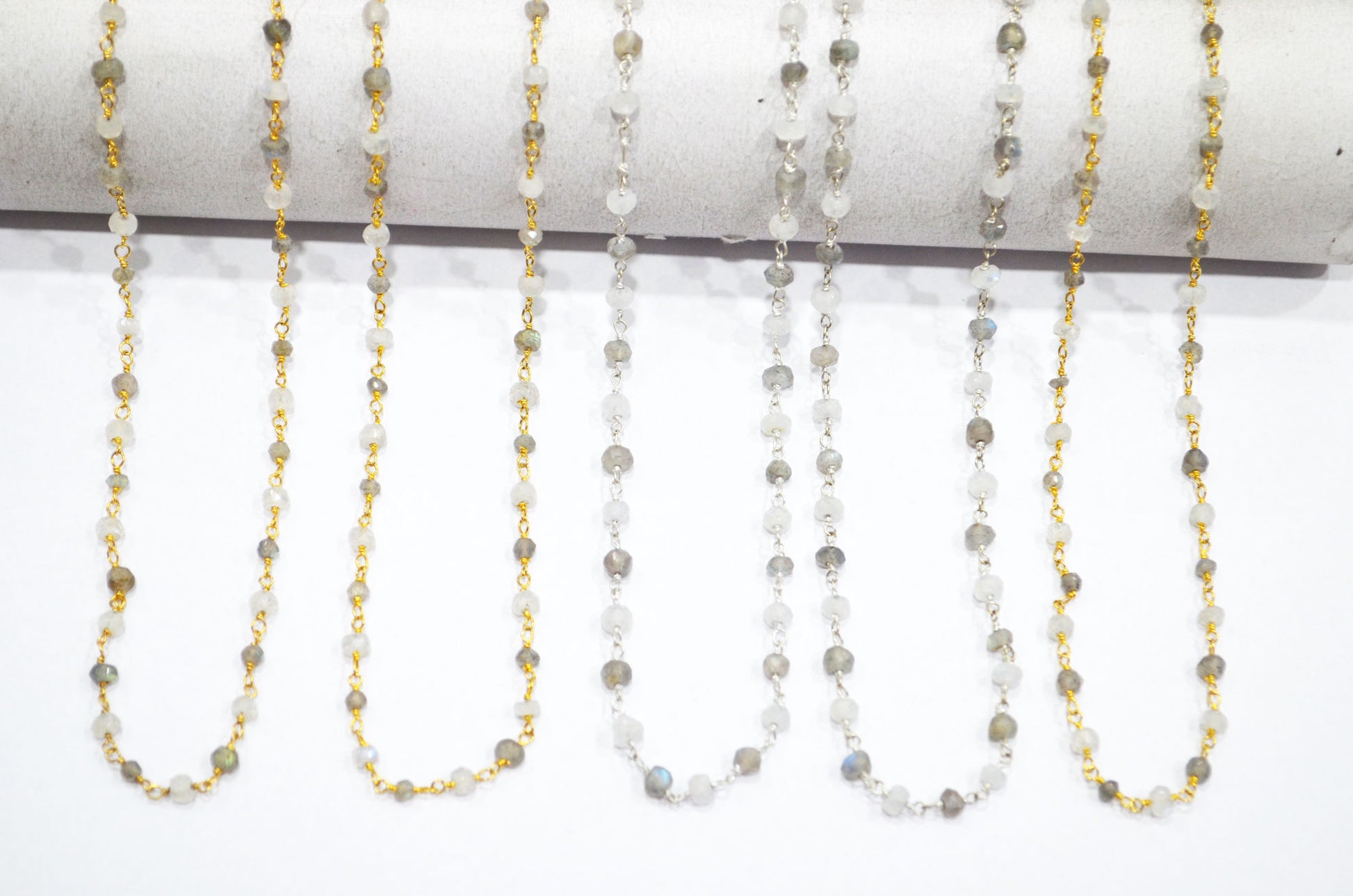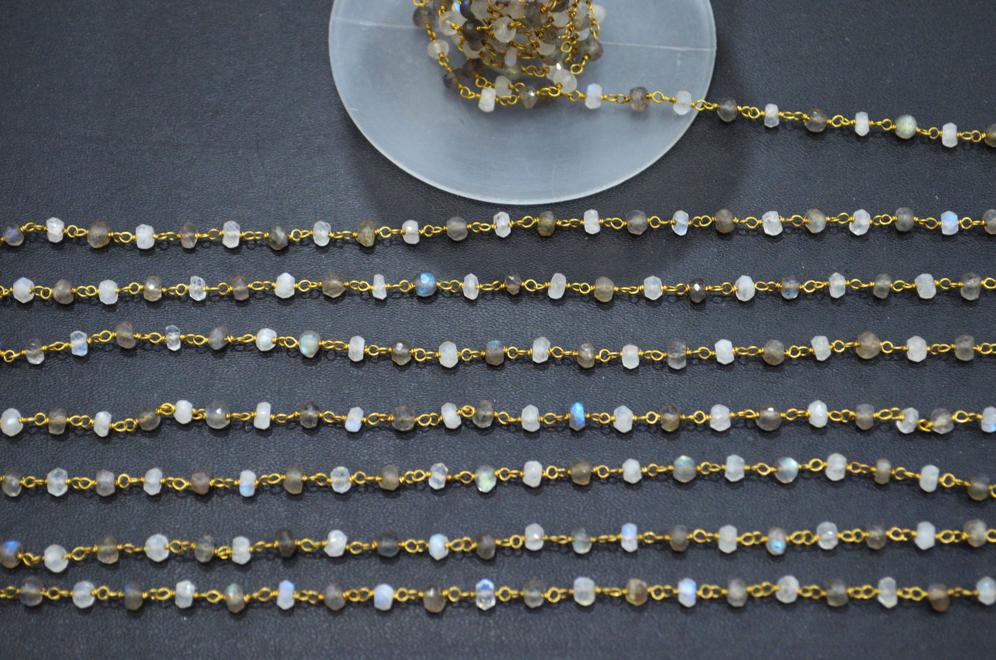 Rainbow Moonstone Faceted Rosary Beaded Chain , Labradorite Rondelle Shape Wire Wrapped Chain , 4.50 mm , RB-5771