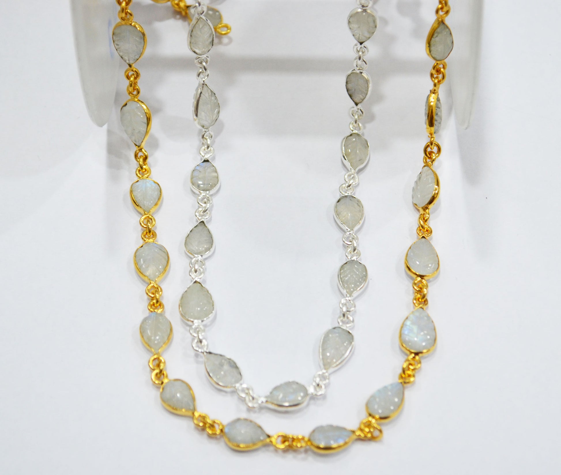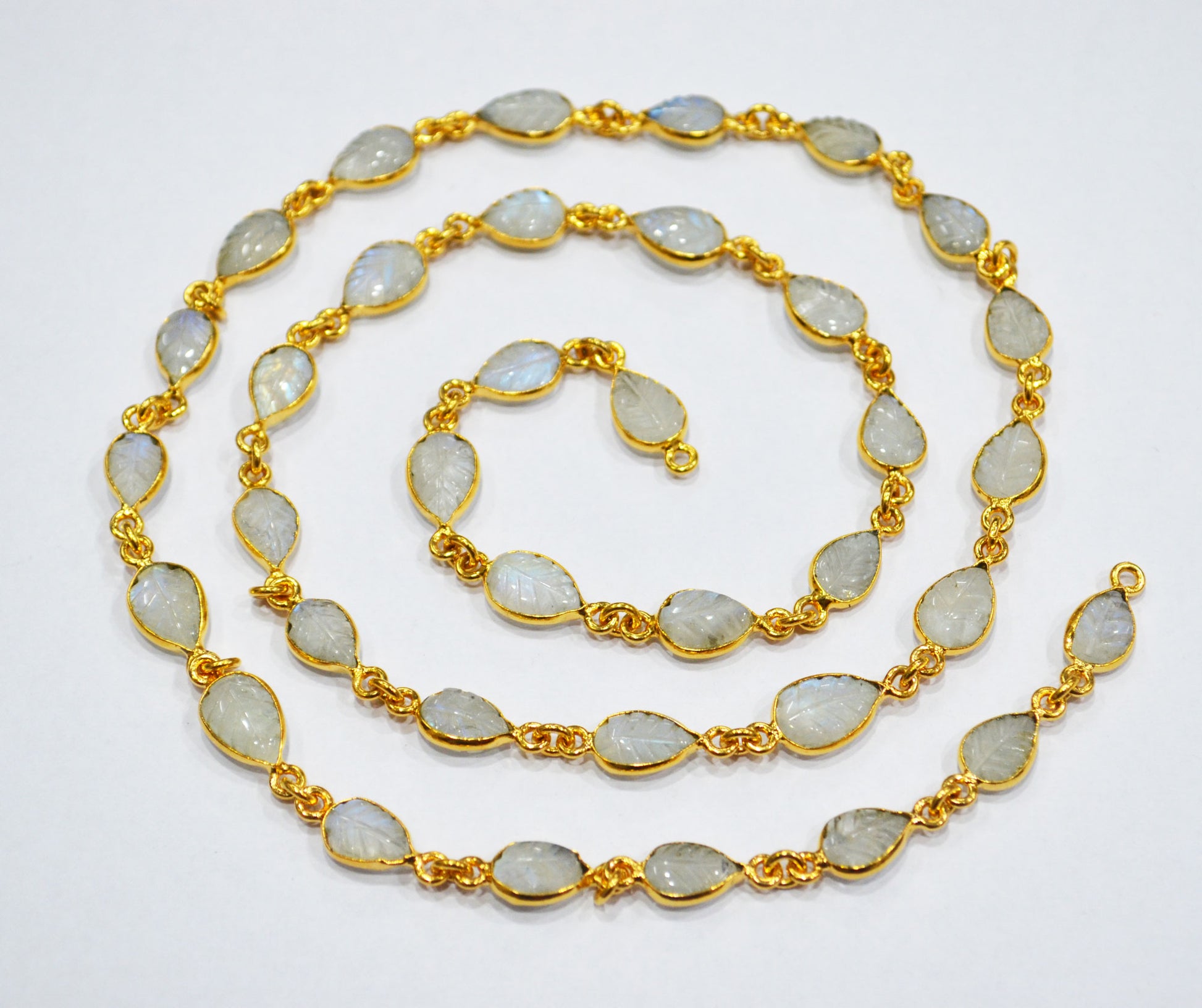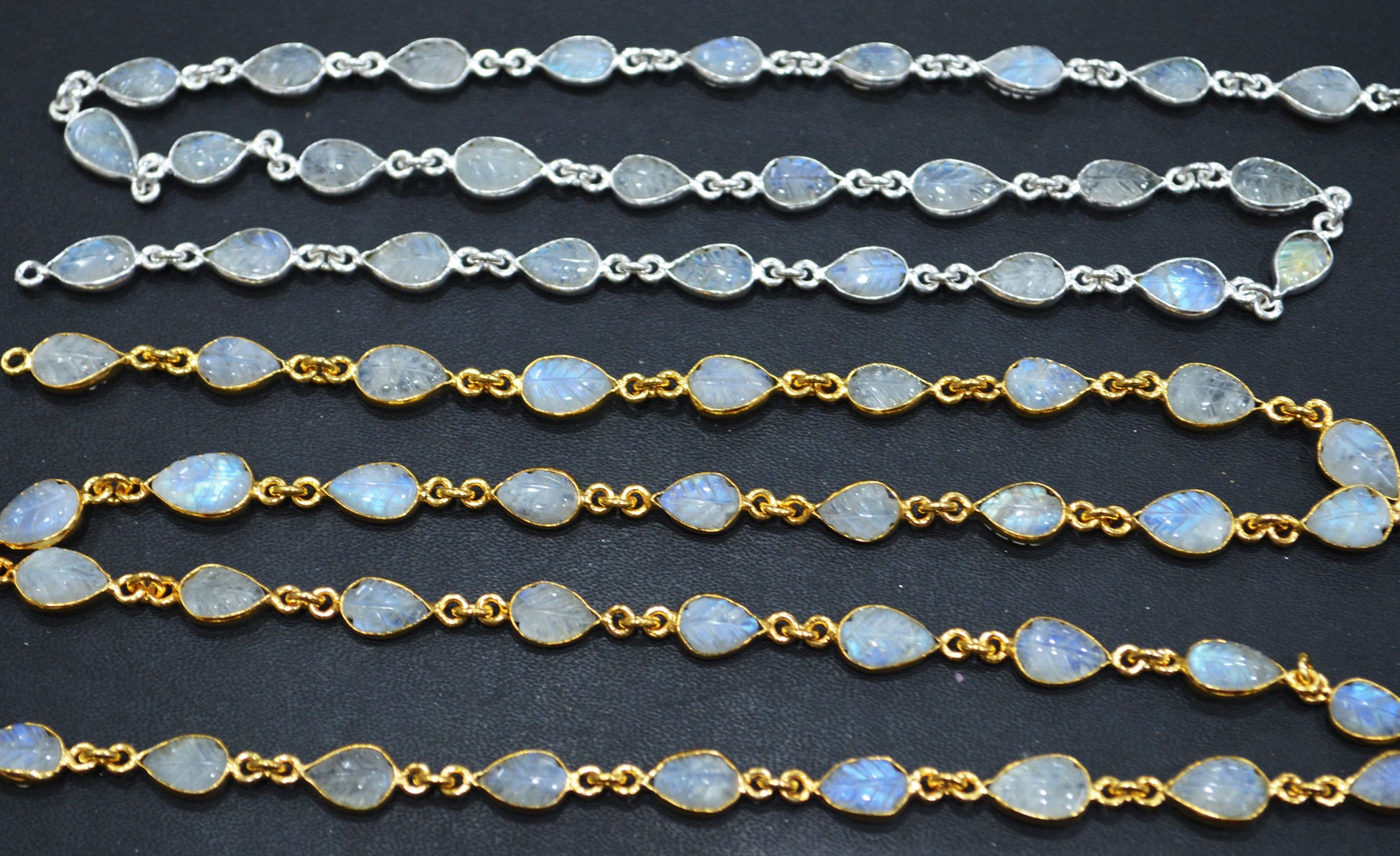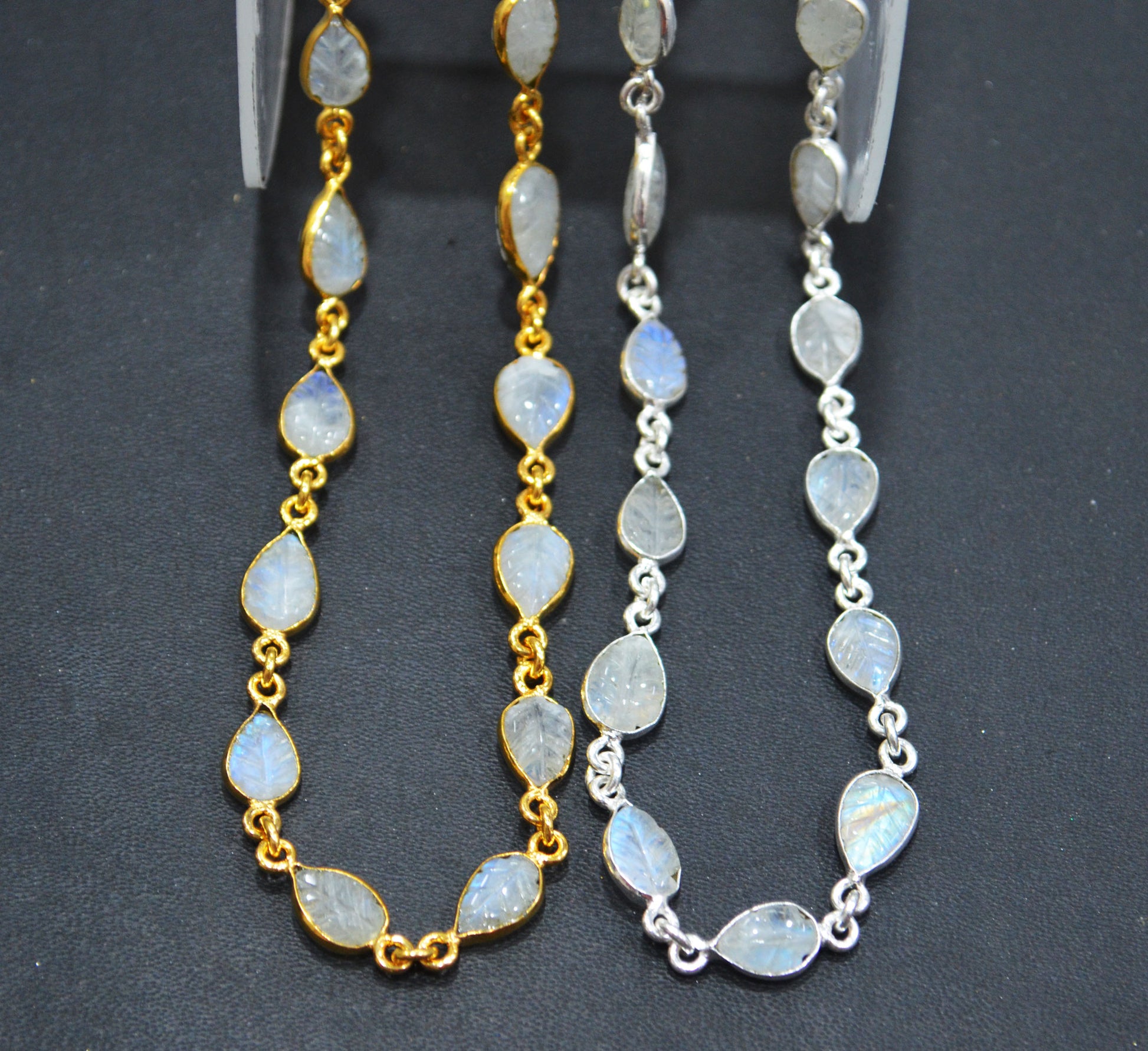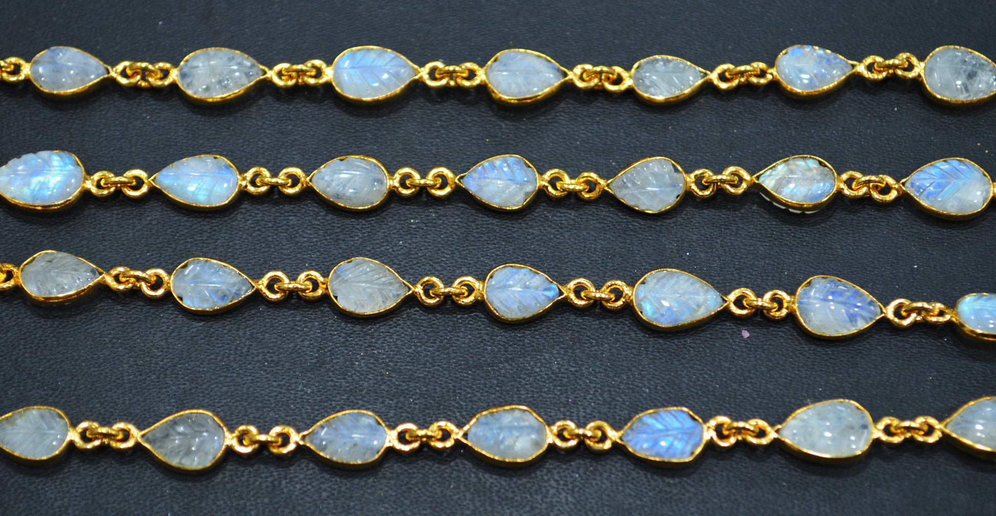 Rainbow Moonstone Hand Carved Leaf Shape Connector Chain , Rainbow Moonstone Bezel Link Chain , 7x9 mm , RB-6328