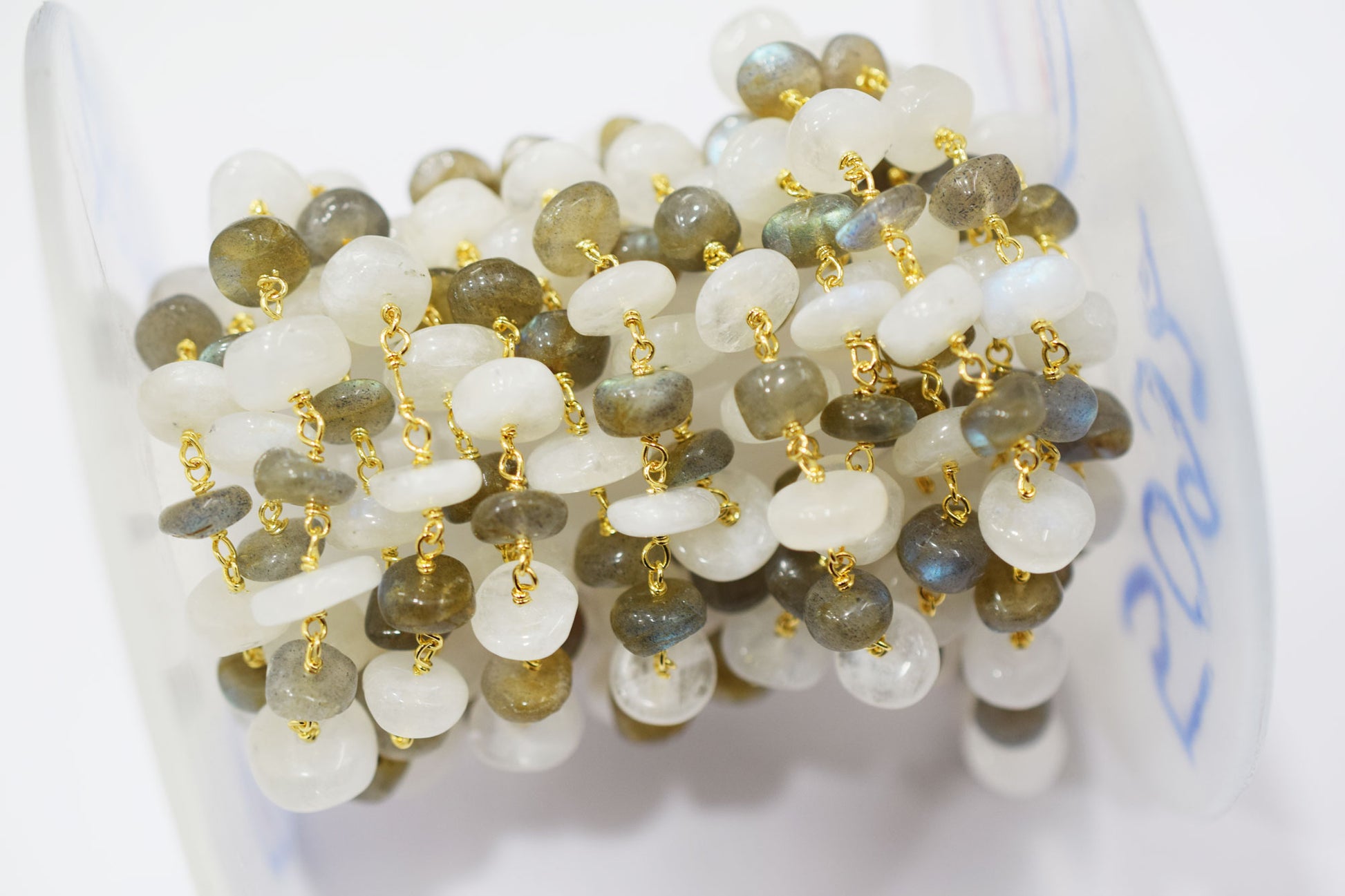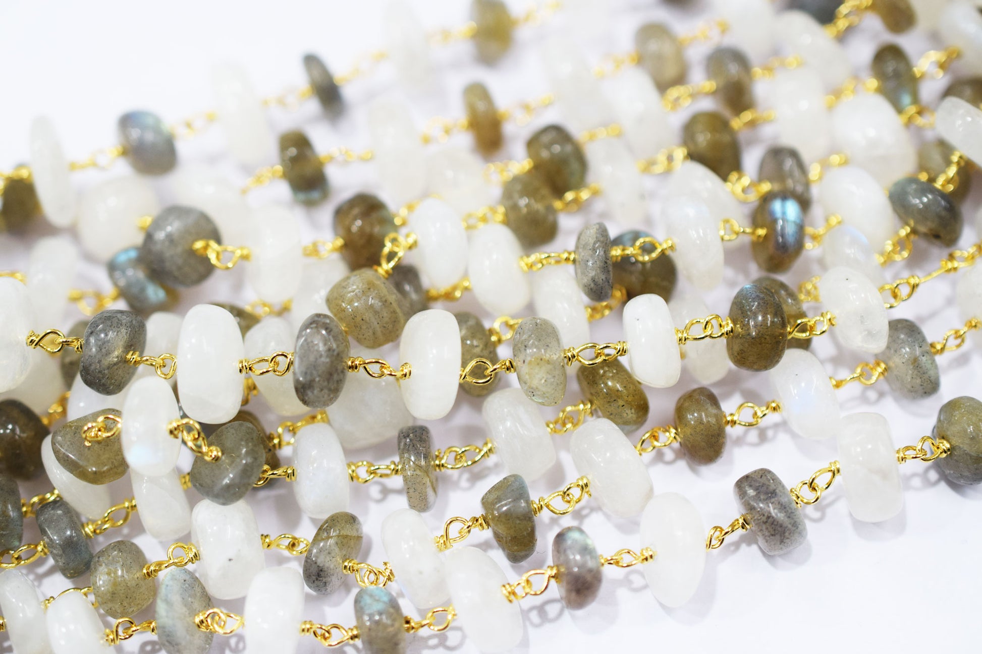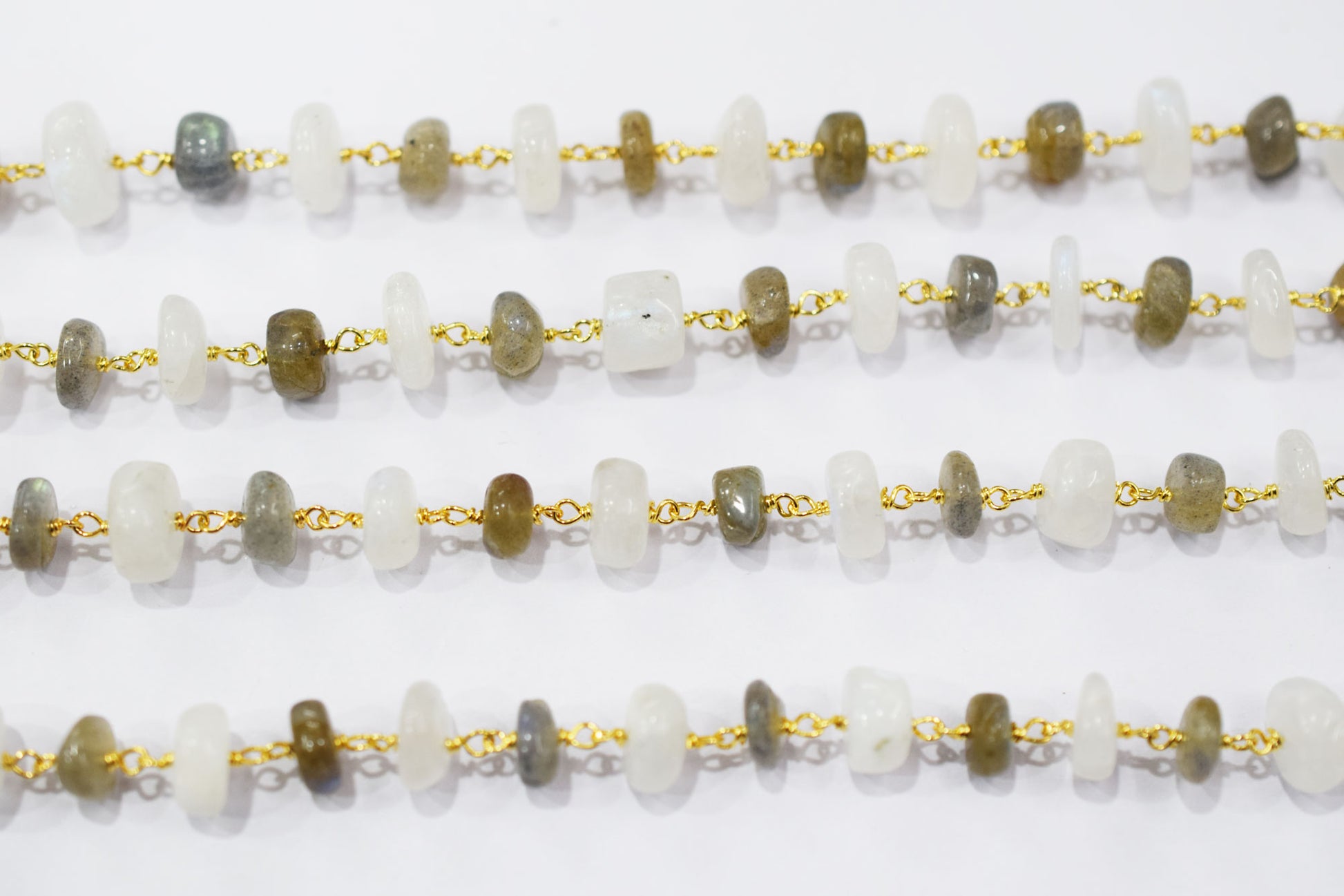 Rainbow Moonstone Irregular Rondelle Shape Rosary Beaded Chain , Labradorite Smooth Wire Wrapped Chain , Sold By Foot , 3x8 - 5x10 mm , RB-6474