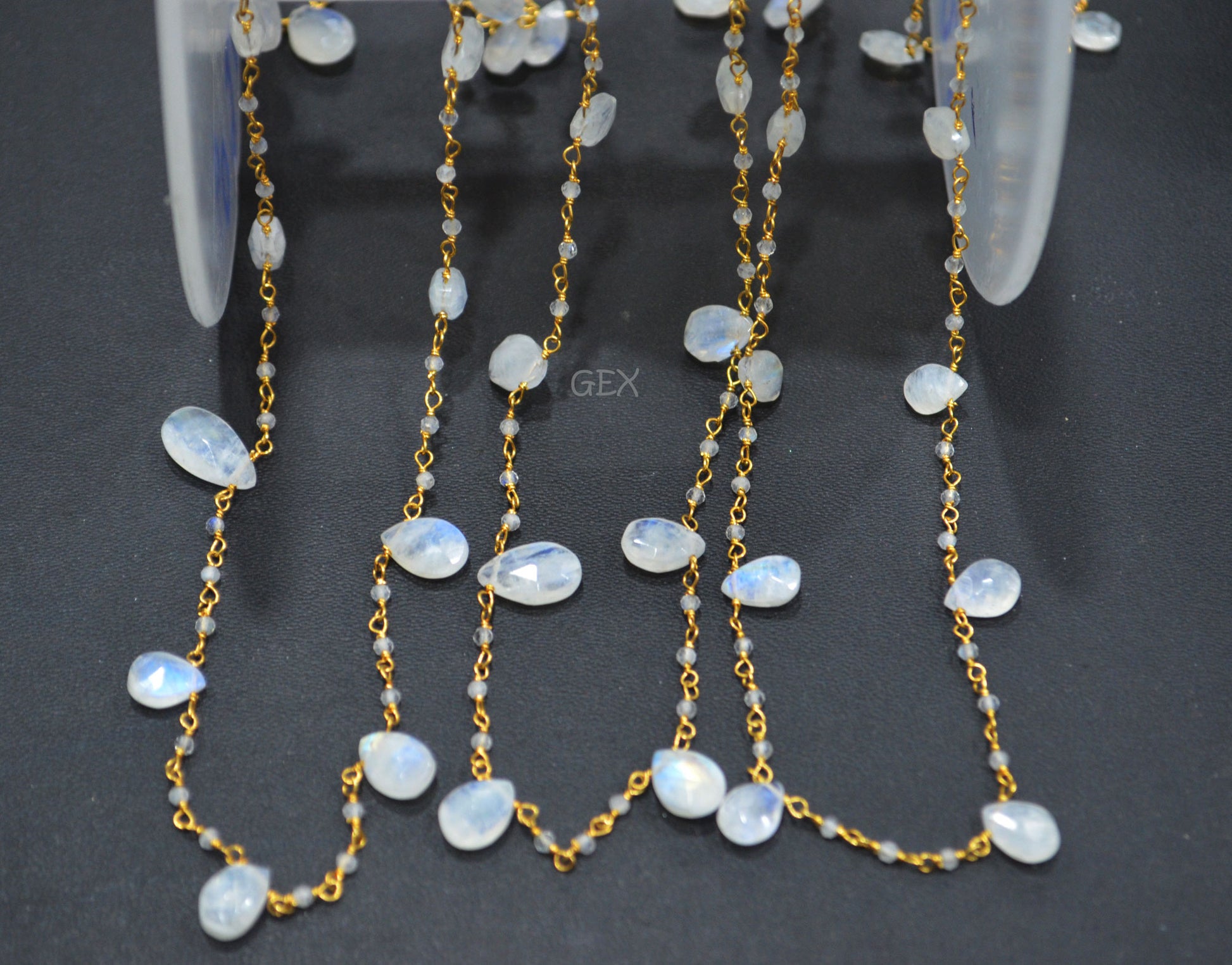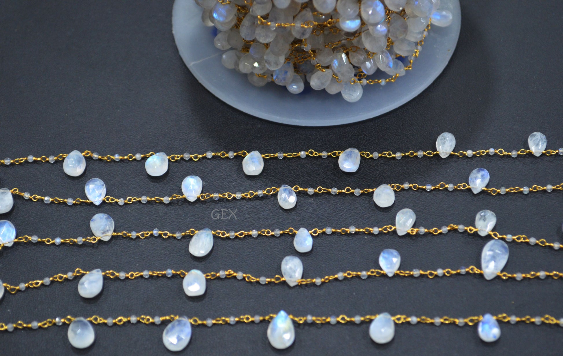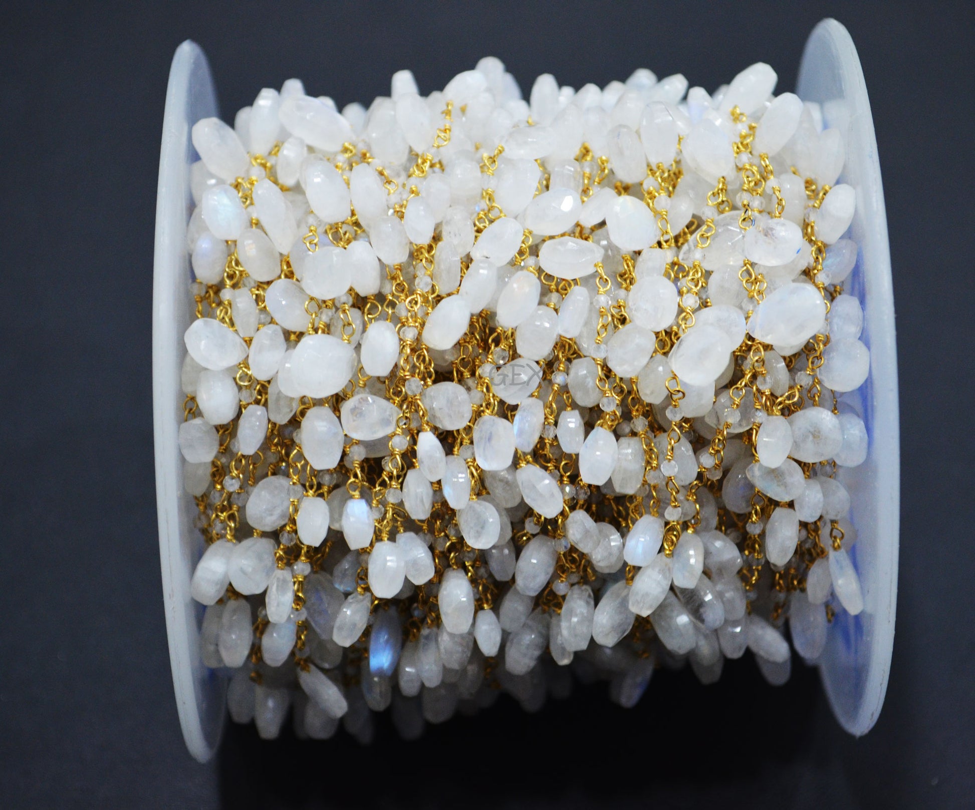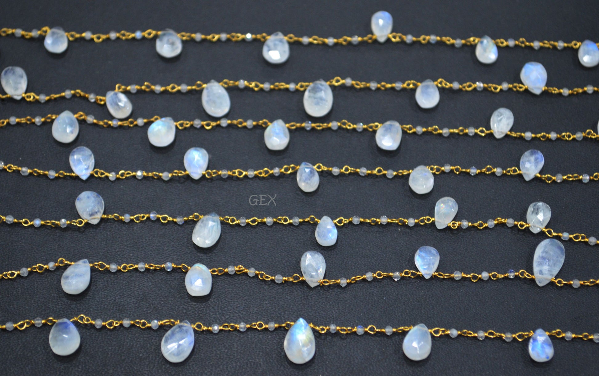 Rainbow Moonstone Round Shape Rosary Beaded Chain , Rainbow Moonstone Faceted Pear Shape Chain , 5x7 - 7x10 mm , RB-6734