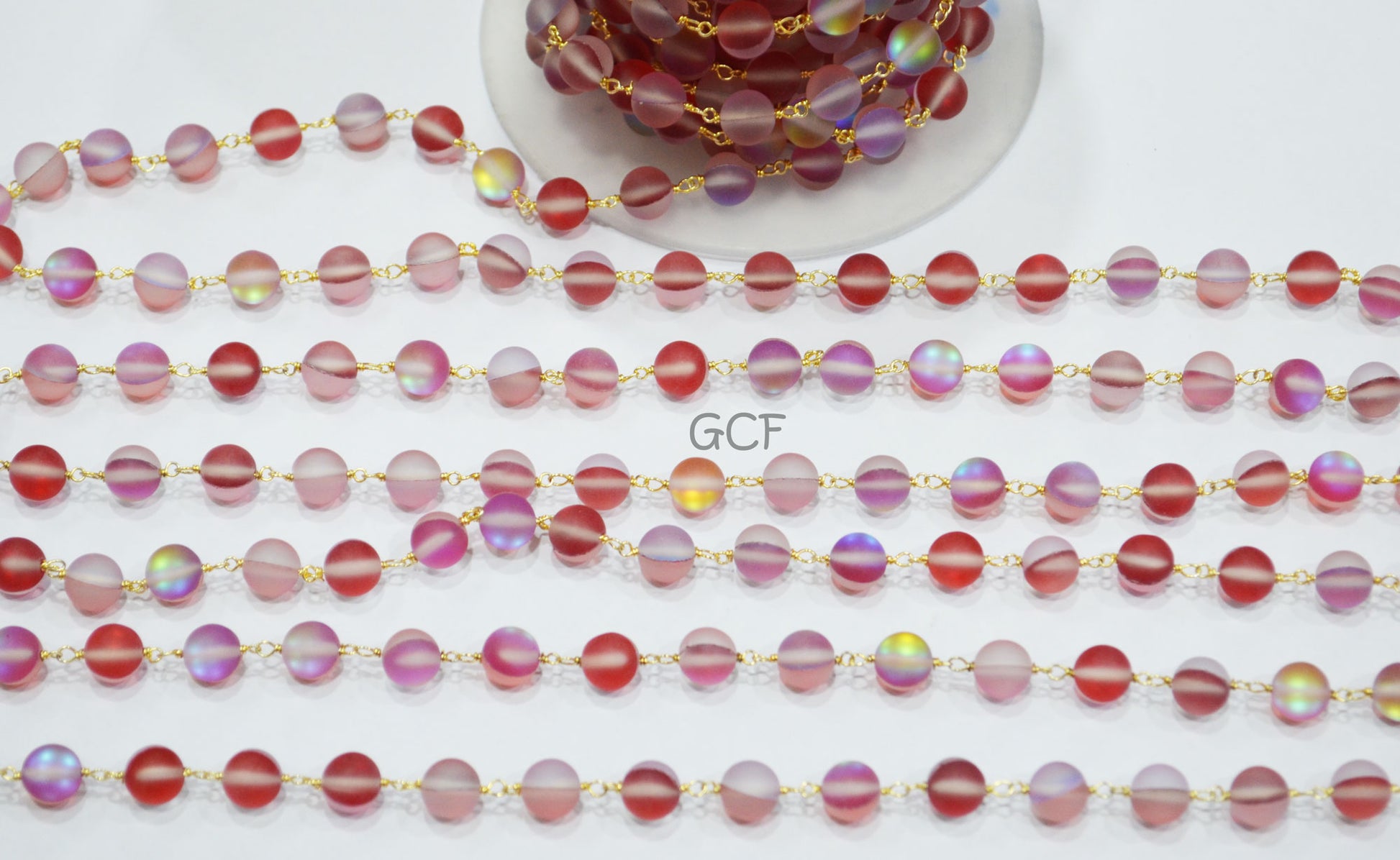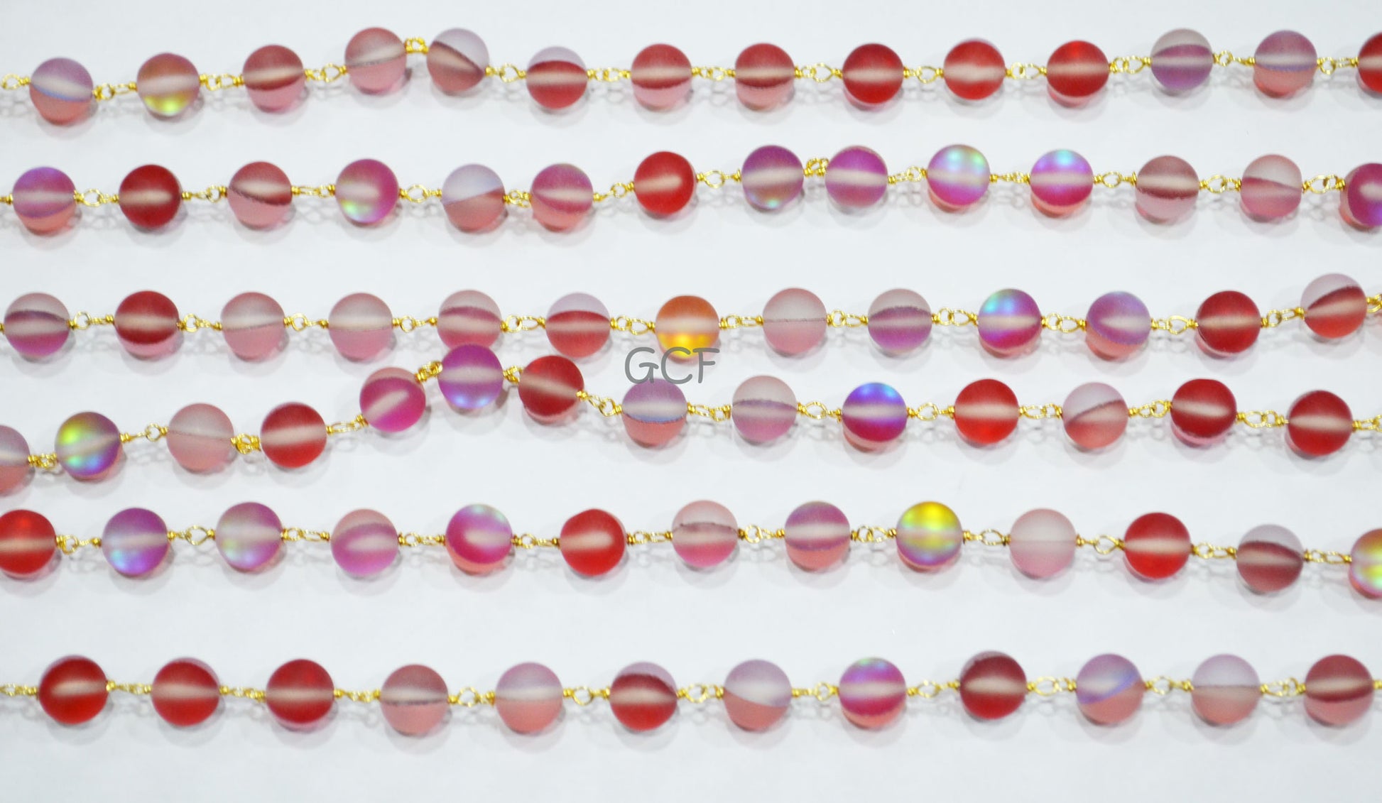 Red Rainbow Moonstone Doublet Hydro Glass Smooth Rosary Chain , Red Rainbow Moonstone Round Shape Wire Wrapped Chain , 8 mm , RB-7116