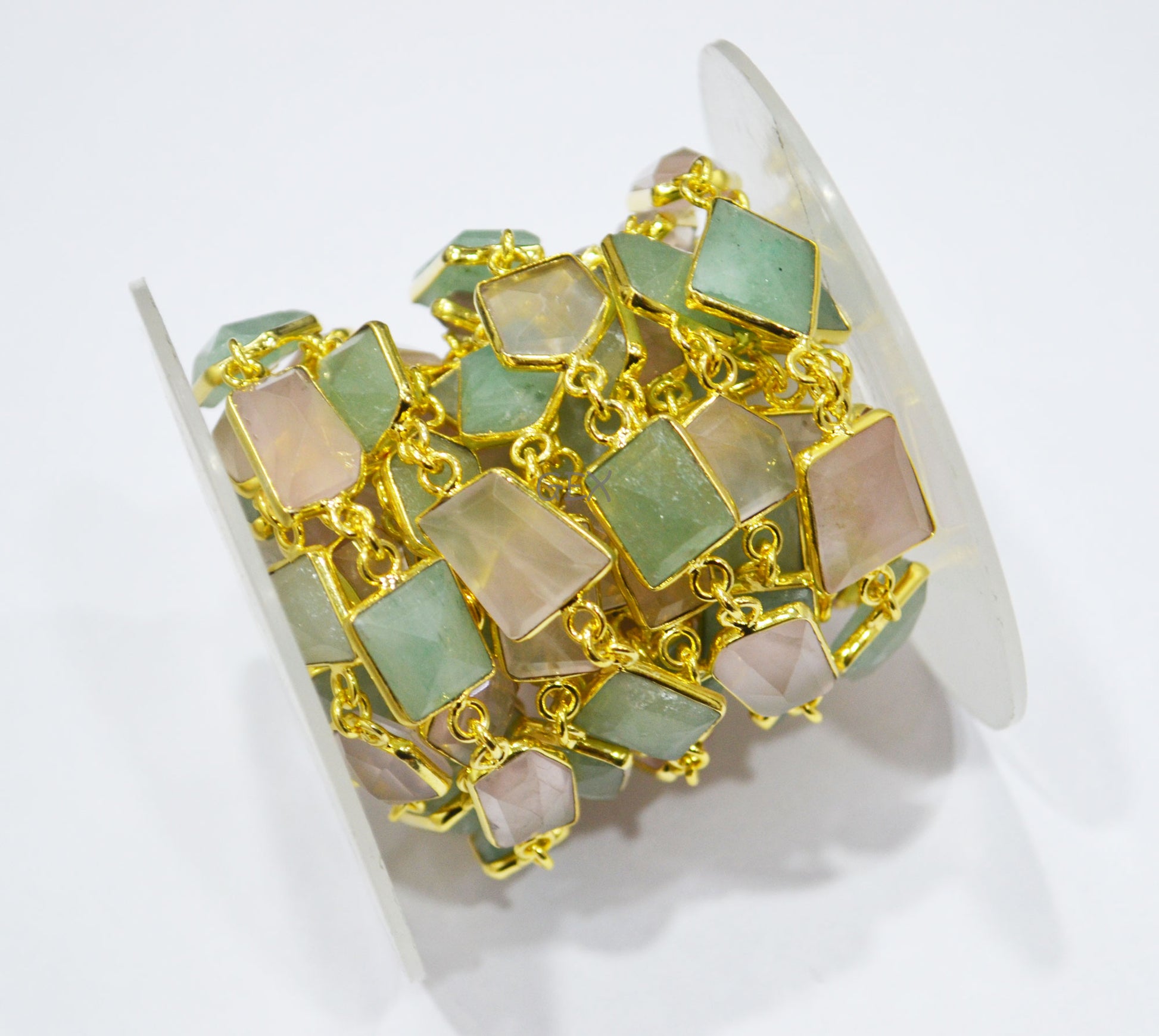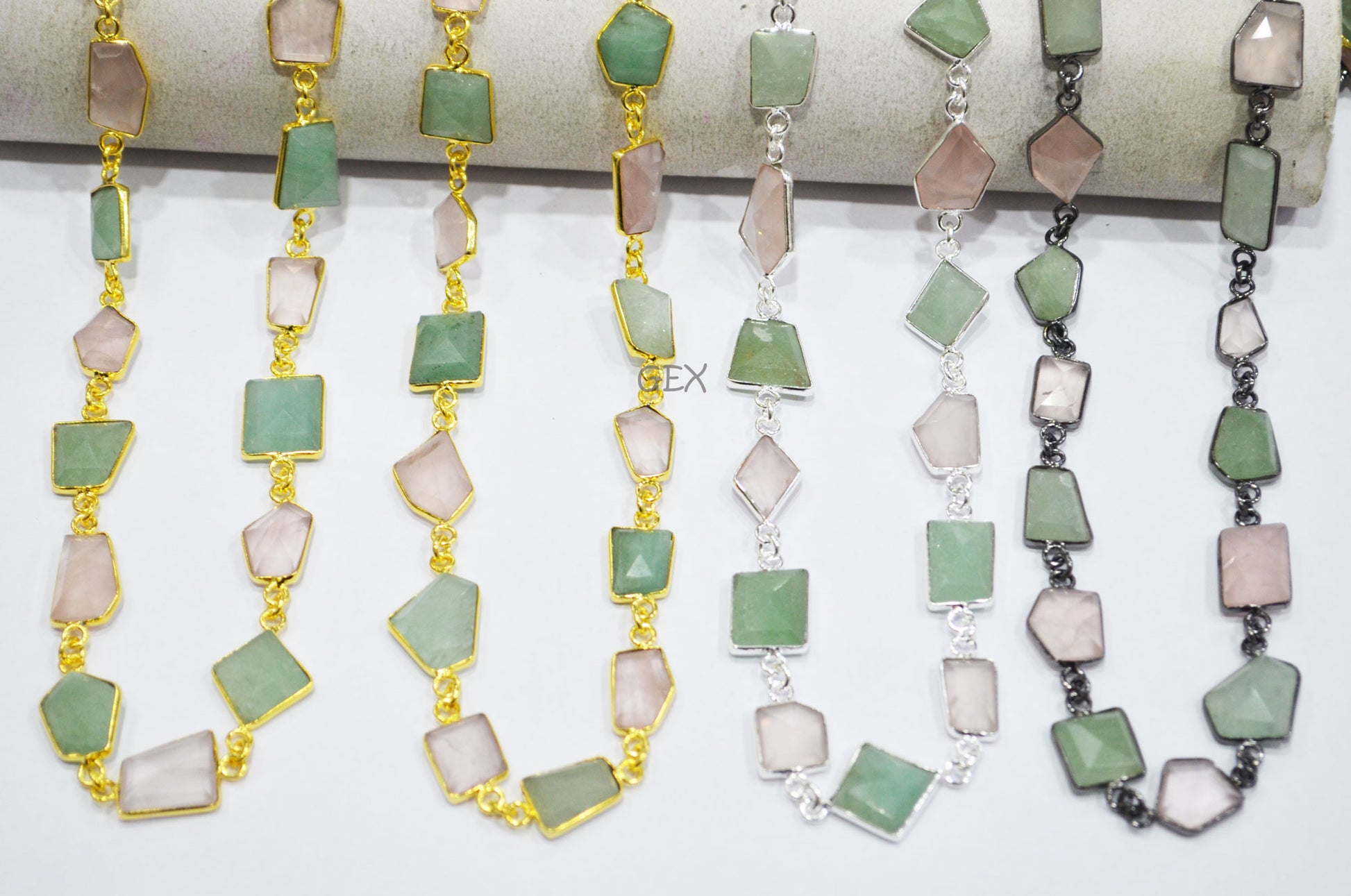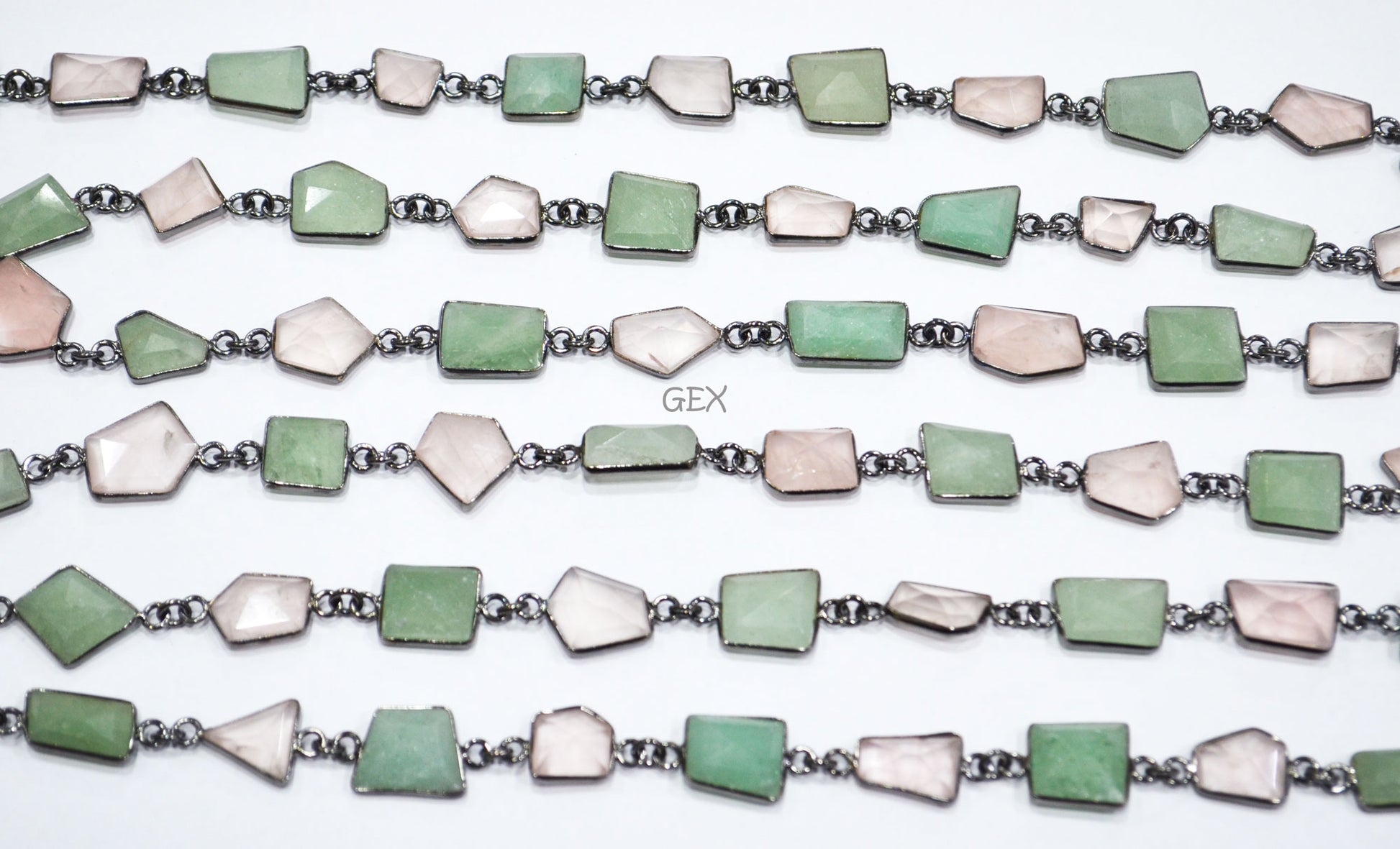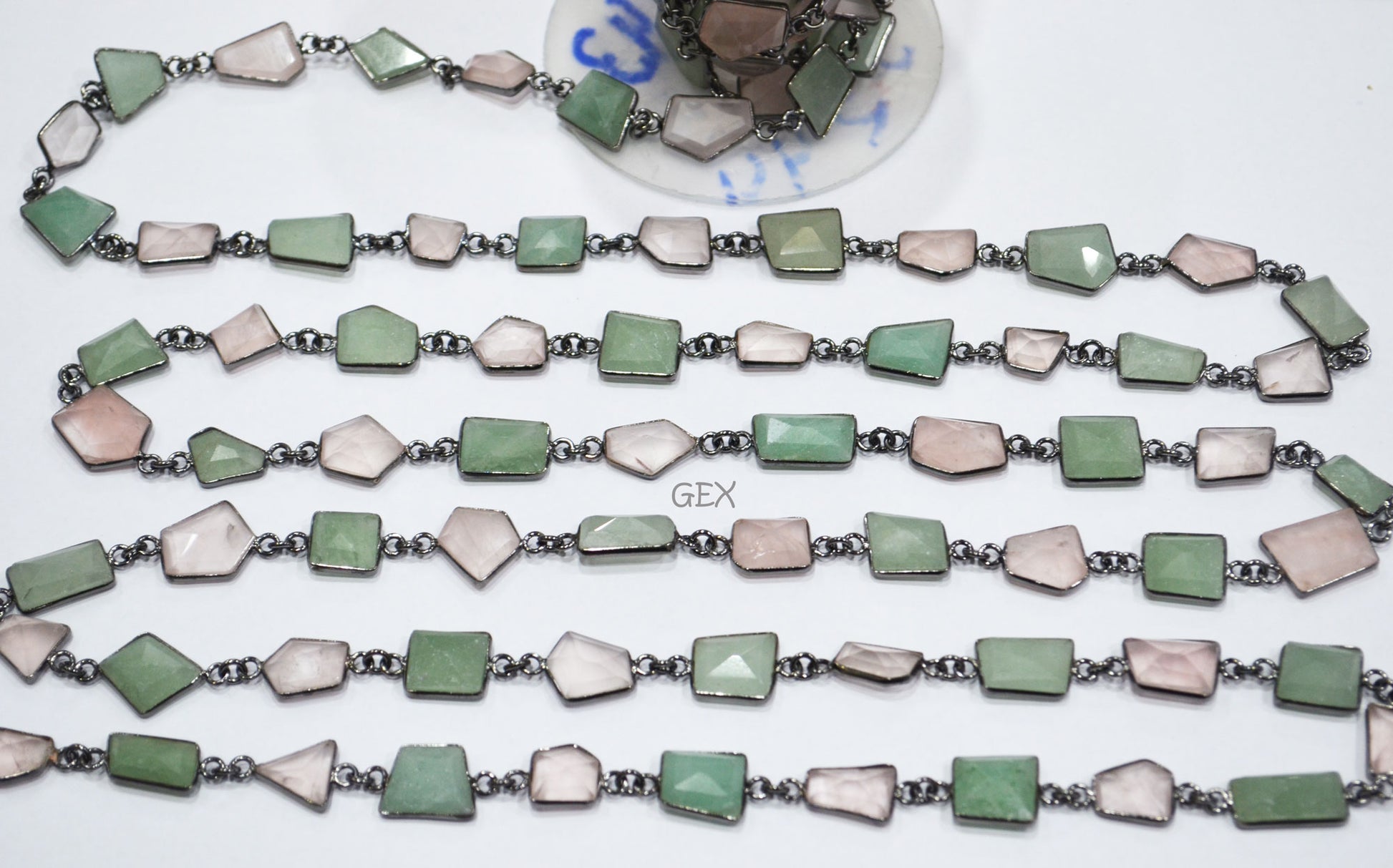 Rose Quartz And Grape Aventurine Faceted Fancy Cut Shape Connector Chain , 9x12 - 17x20 mm , RB-7161