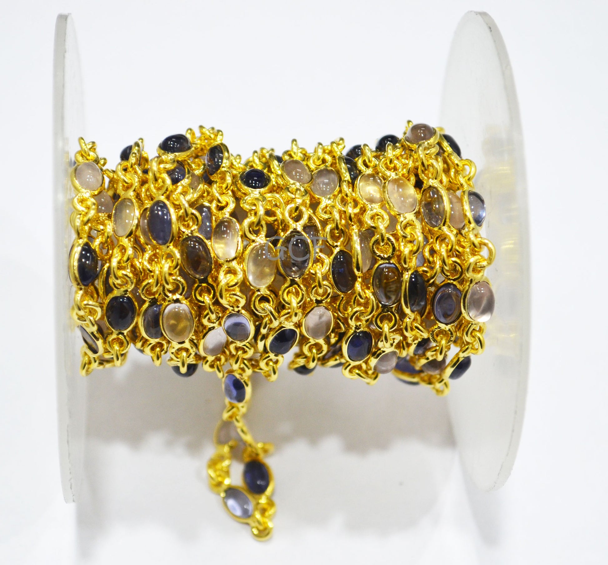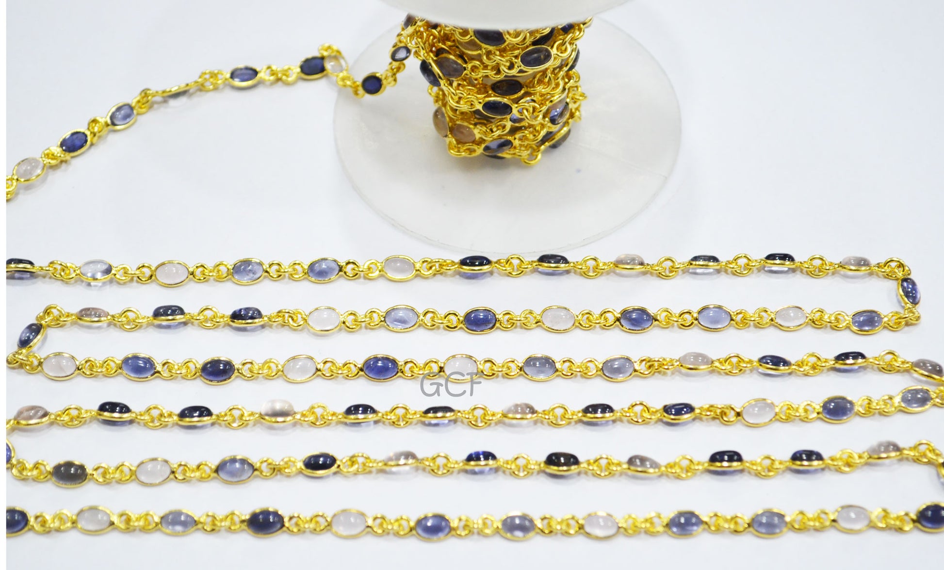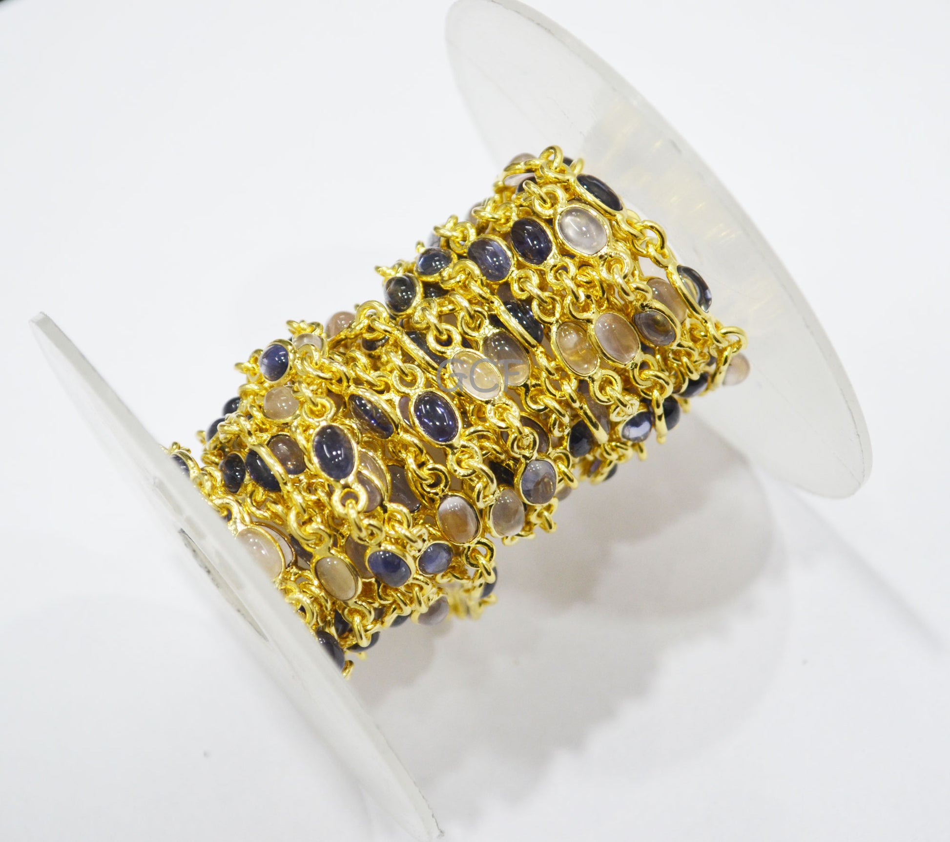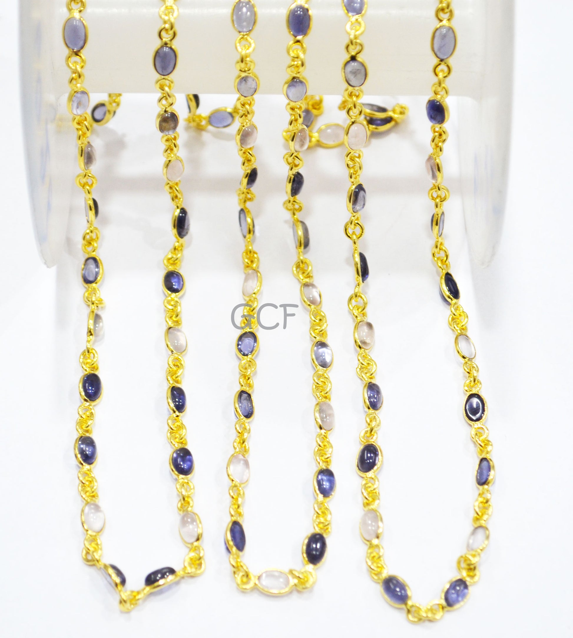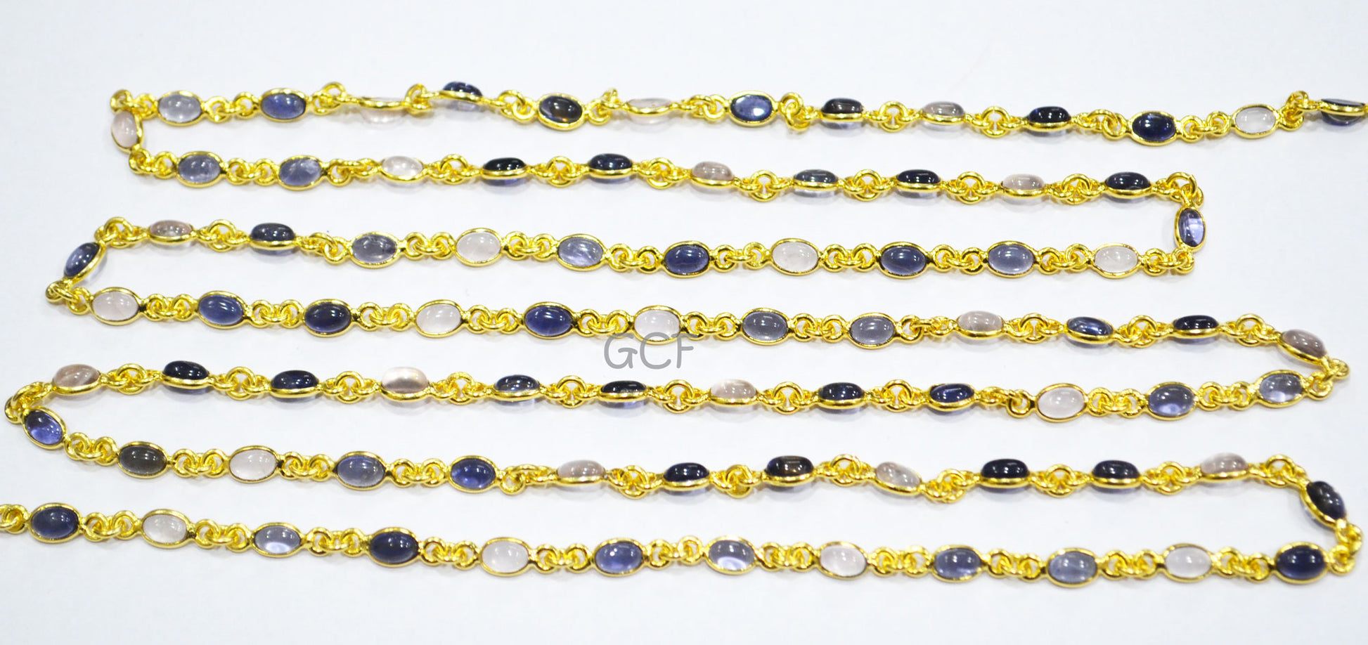 Rose Quartz And Iolite Smooth Connector Chain , Rose Quartz And Iolite Oval Shape Bezel Link ChainΒ , 5x6 mm , RB-6986