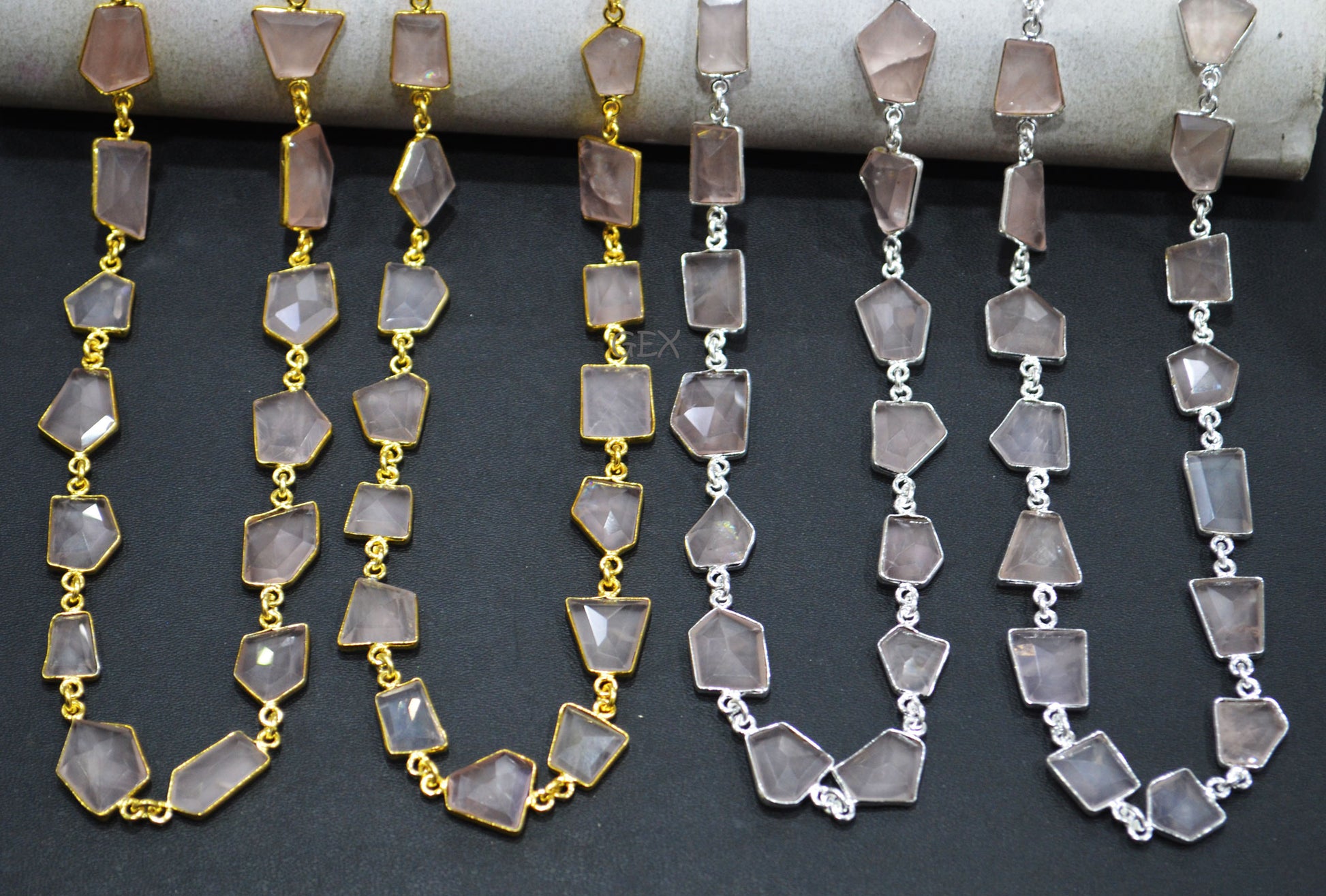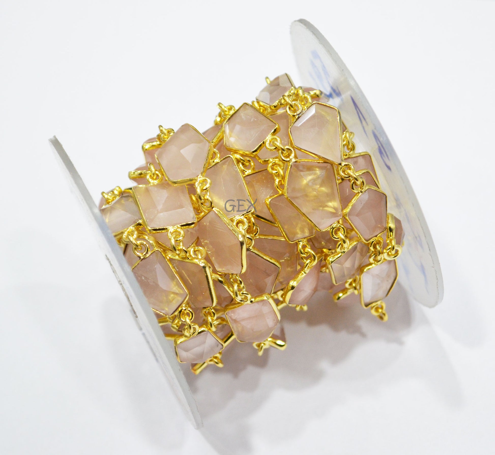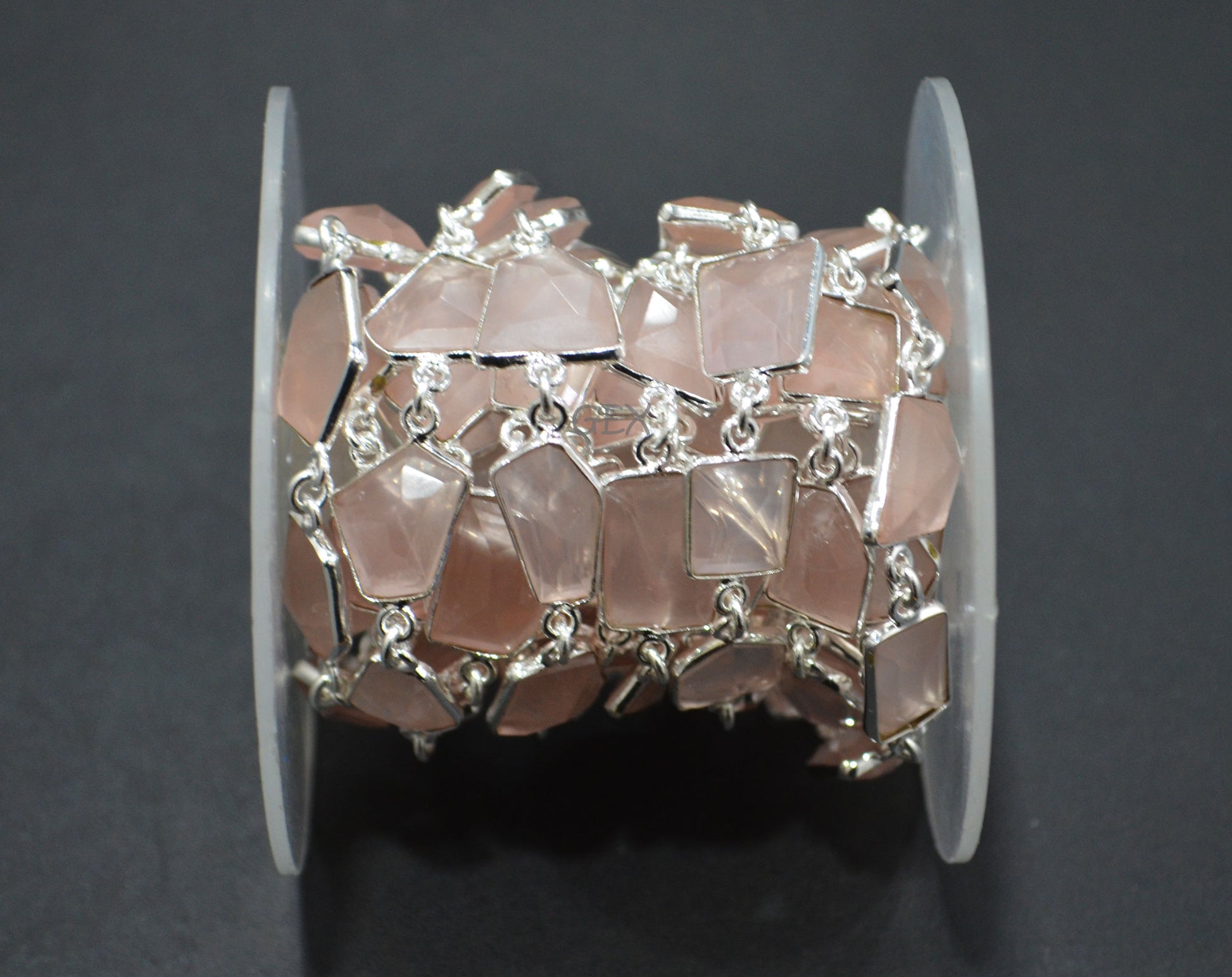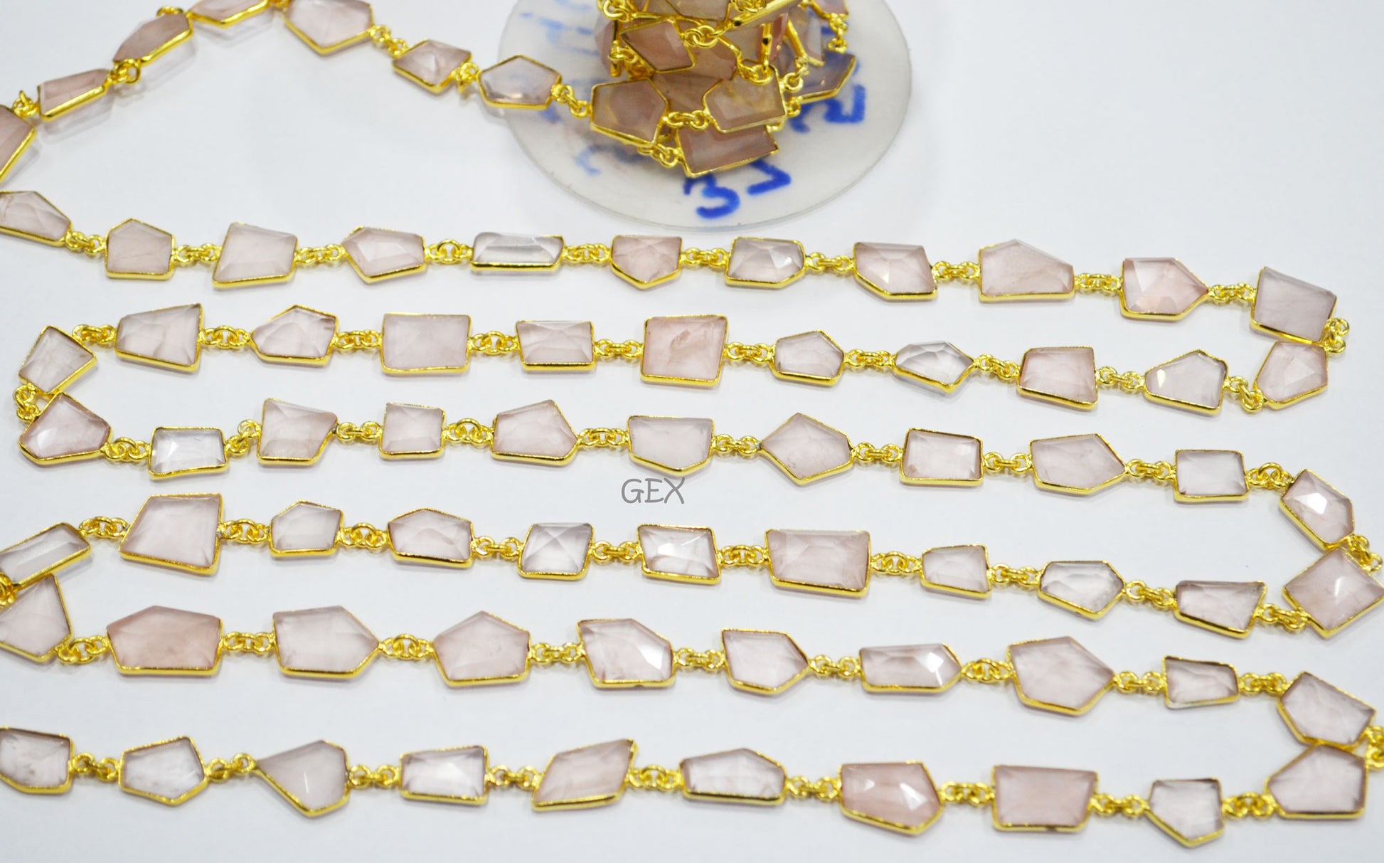 Rose Quartz Faceted Fancy Cut Shape Connector Chain , Rose Quartz Bezel Link Chain , 10x12 - 13x15 mm , RB-7158