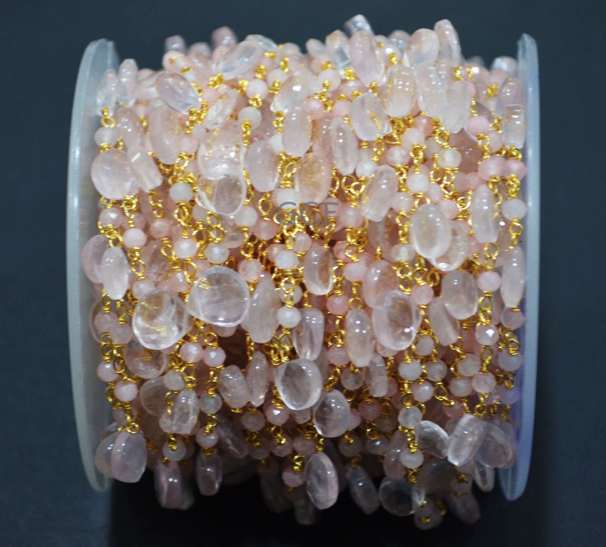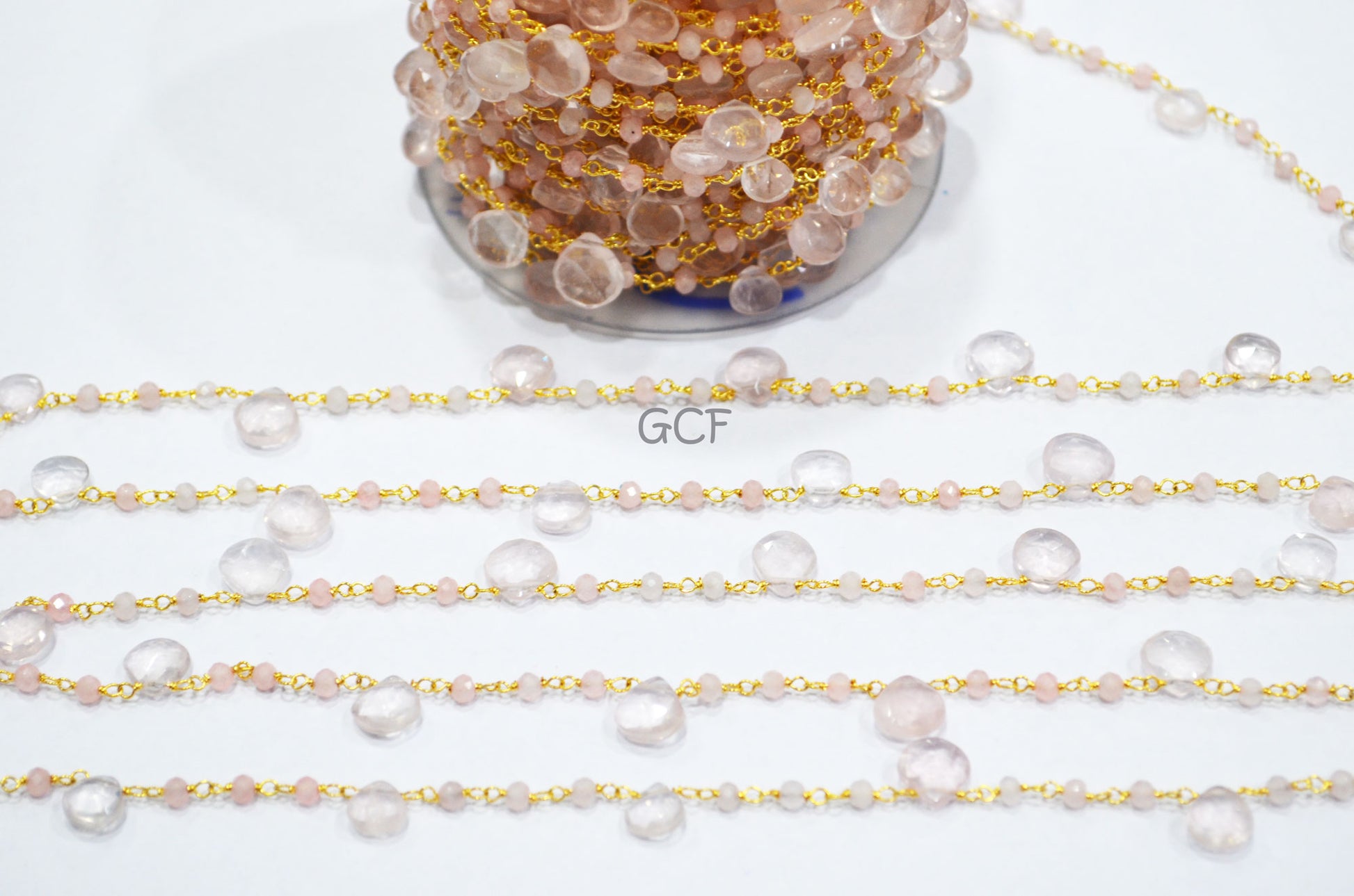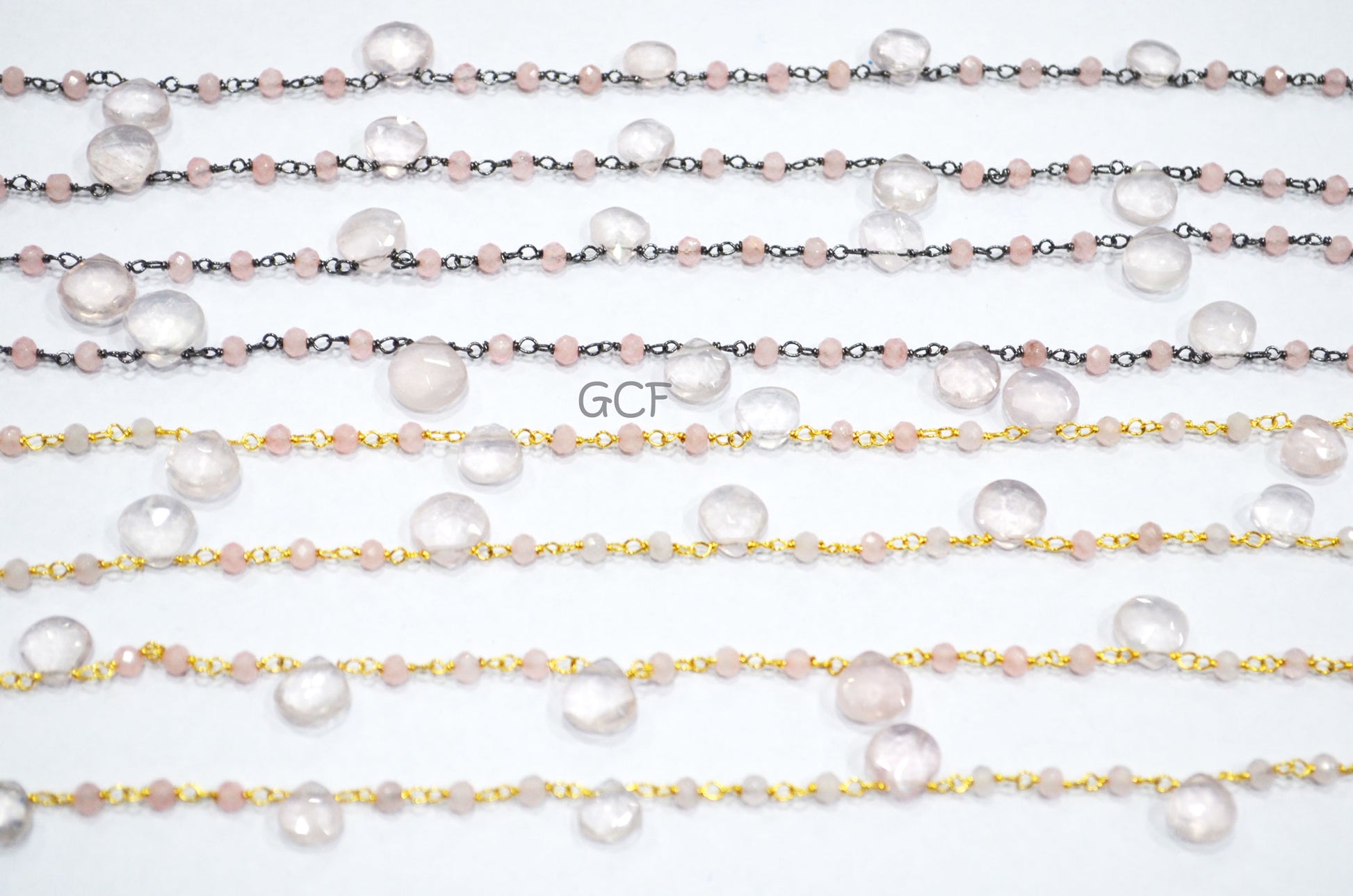 Rose Quartz Faceted Rondelle Rosary Beaded Chain , Rose Quartz Faceted Heart Shape Wire Wrapped Chain , 3 - 8 mm , 6763