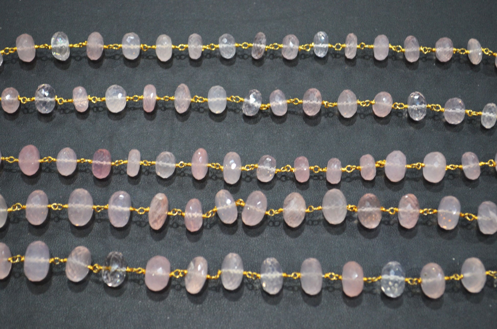 Rose Quartz Rondelle Shape Rosary Beaded Chain , Rose Quartz Faceted Wire Wrapped Chain , 9 - 10 mm , RB-5795