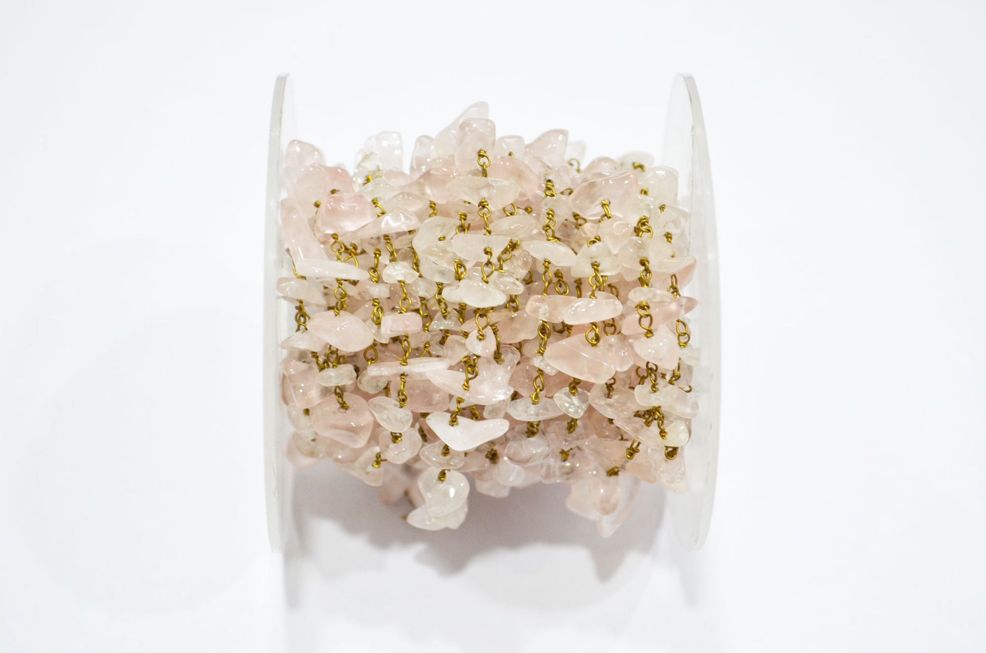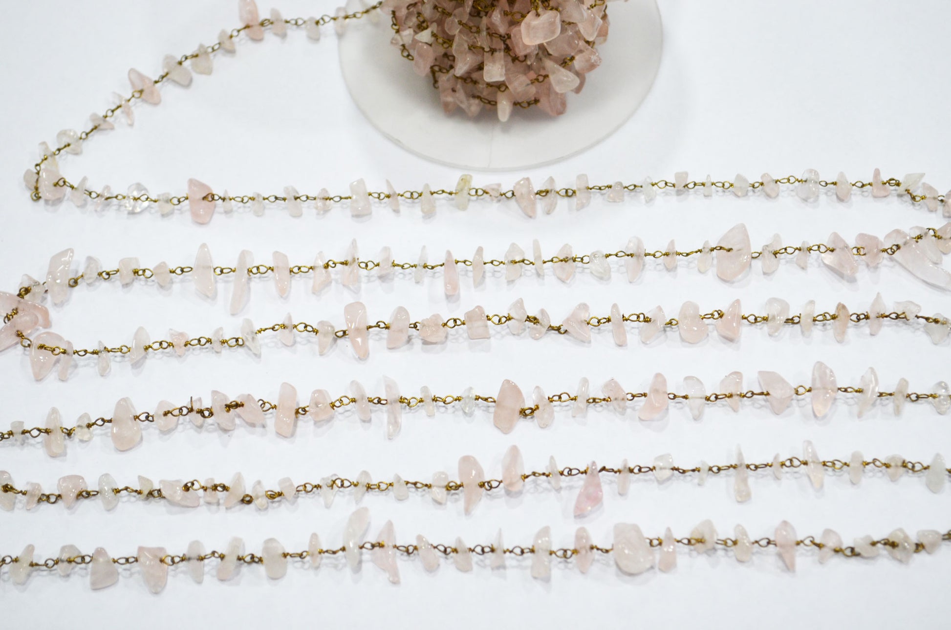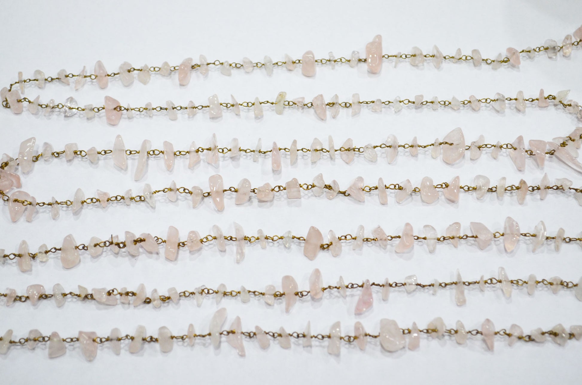 Rose Quartz Smooth Irregular Flat Chips Shape Rosary Beaded Chain , Rose Quartz Rough Nuggets Chips Shape Wire Wrapped Chain , 2 - 9 mm , RB-5876