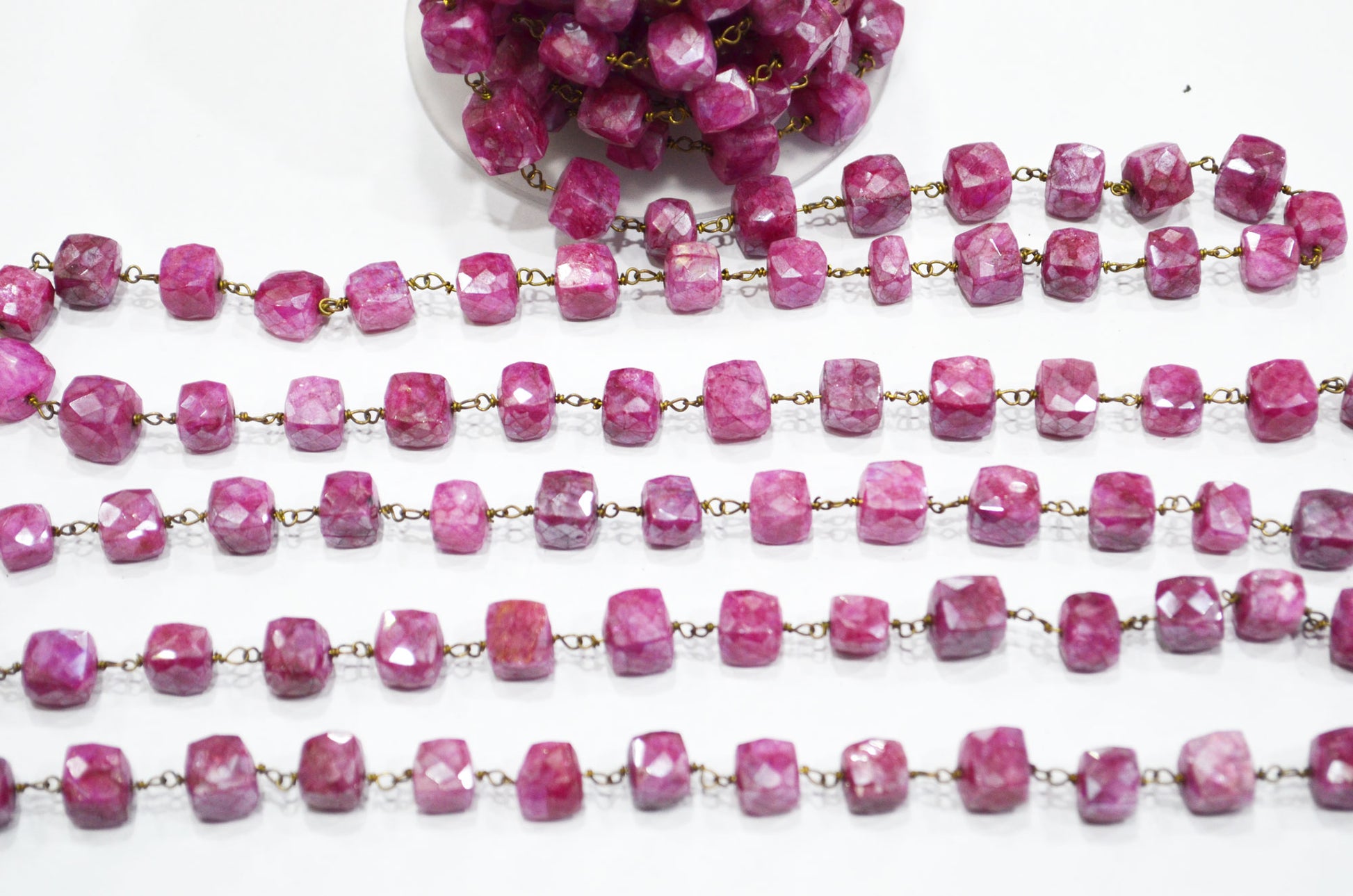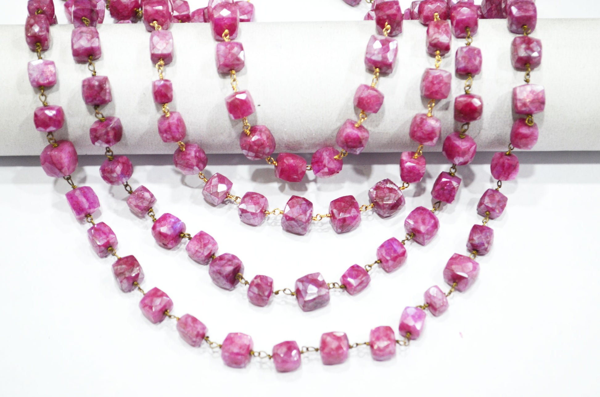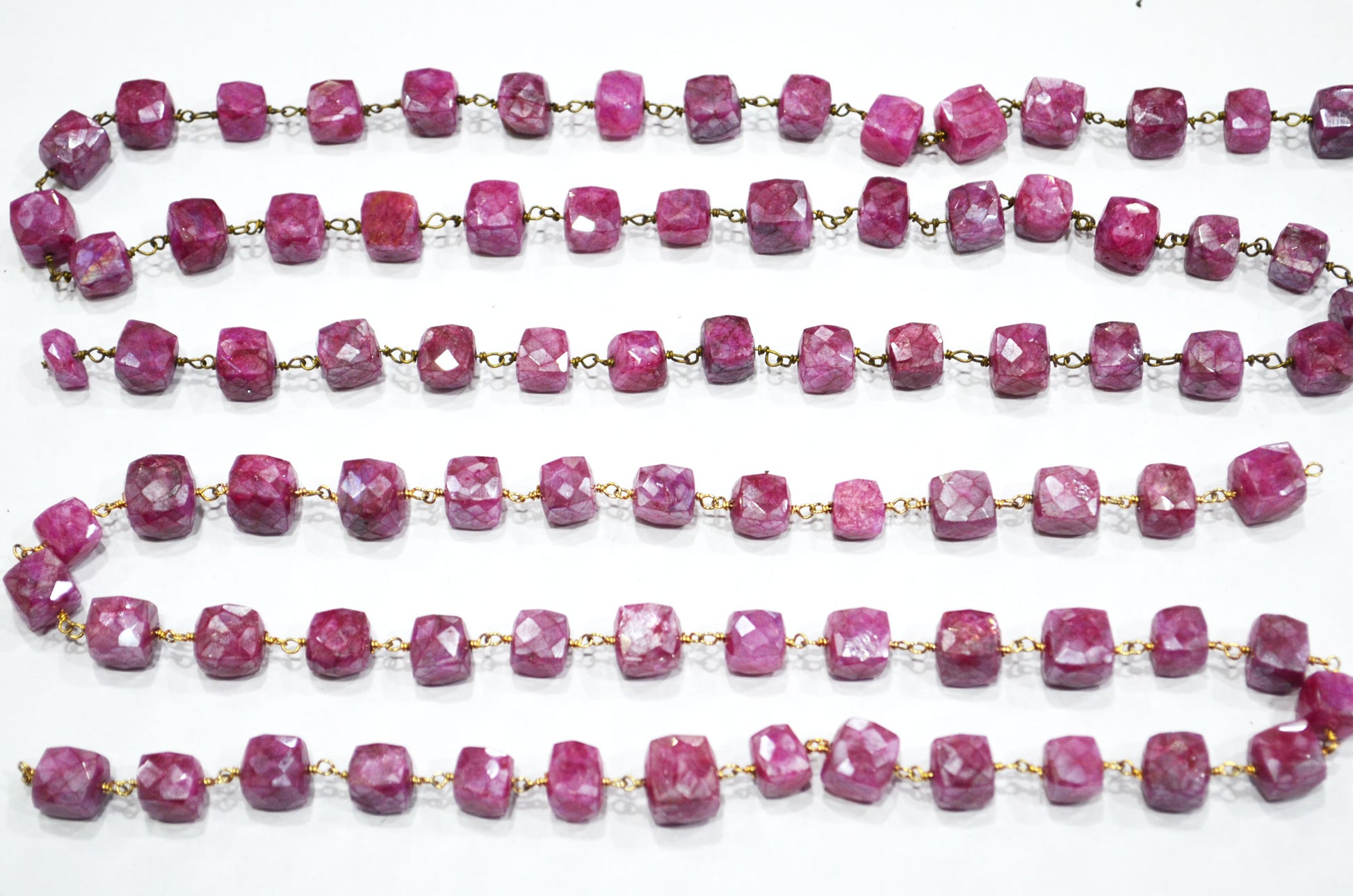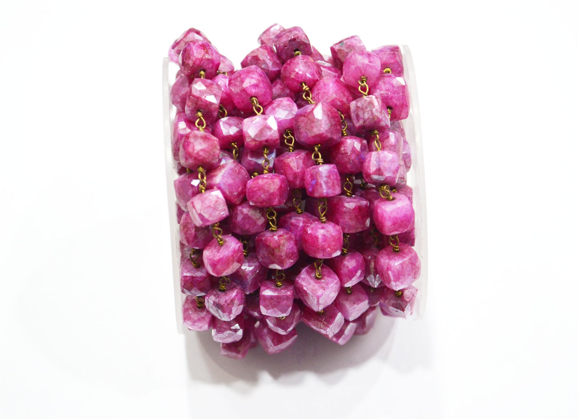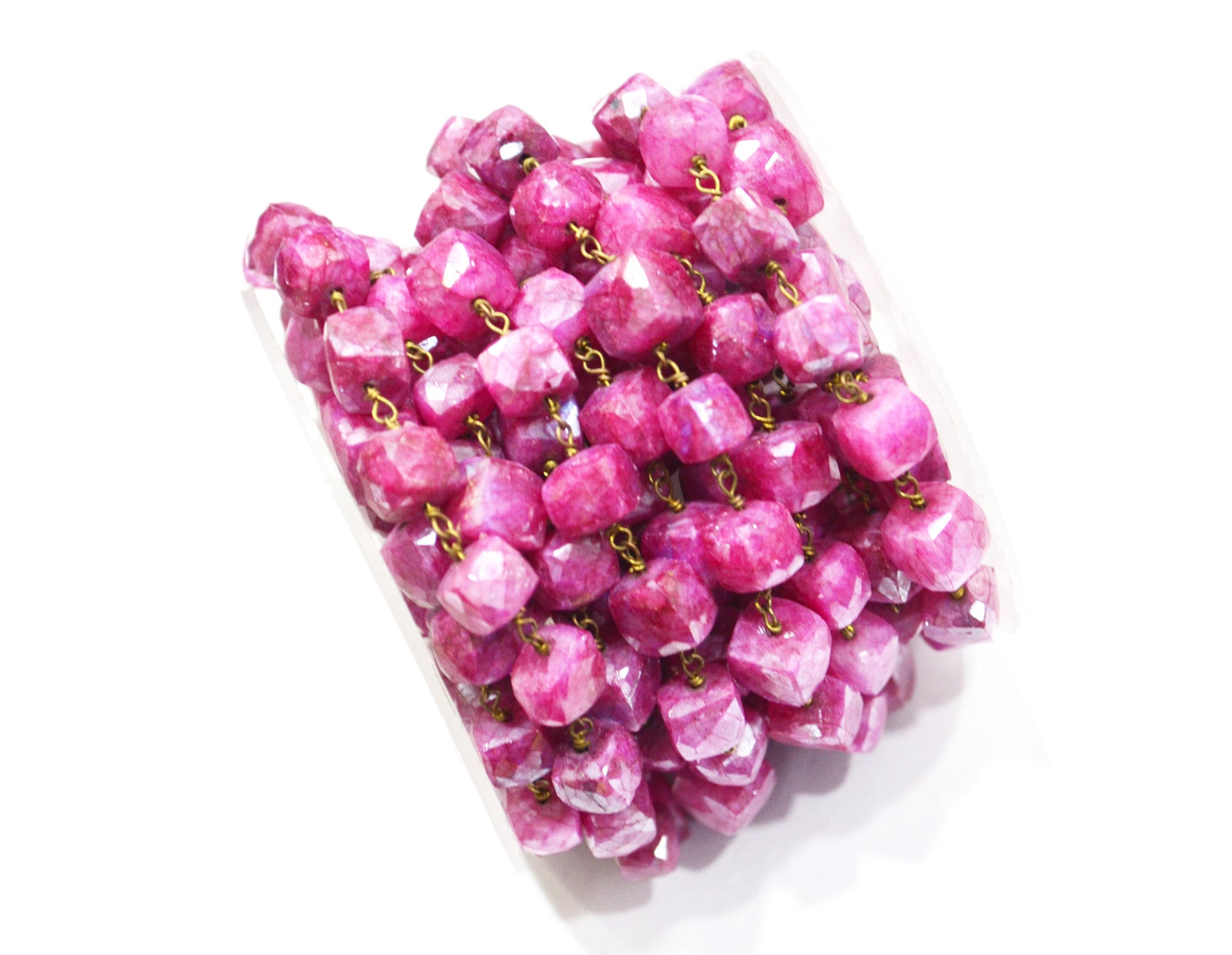 Ruby Colored Moonstone 3D Box Cube Shape Rosary Chain , Ruby Colored Moonstone Wire Wrapped Chain , 7 - 8 mm , RB-6035