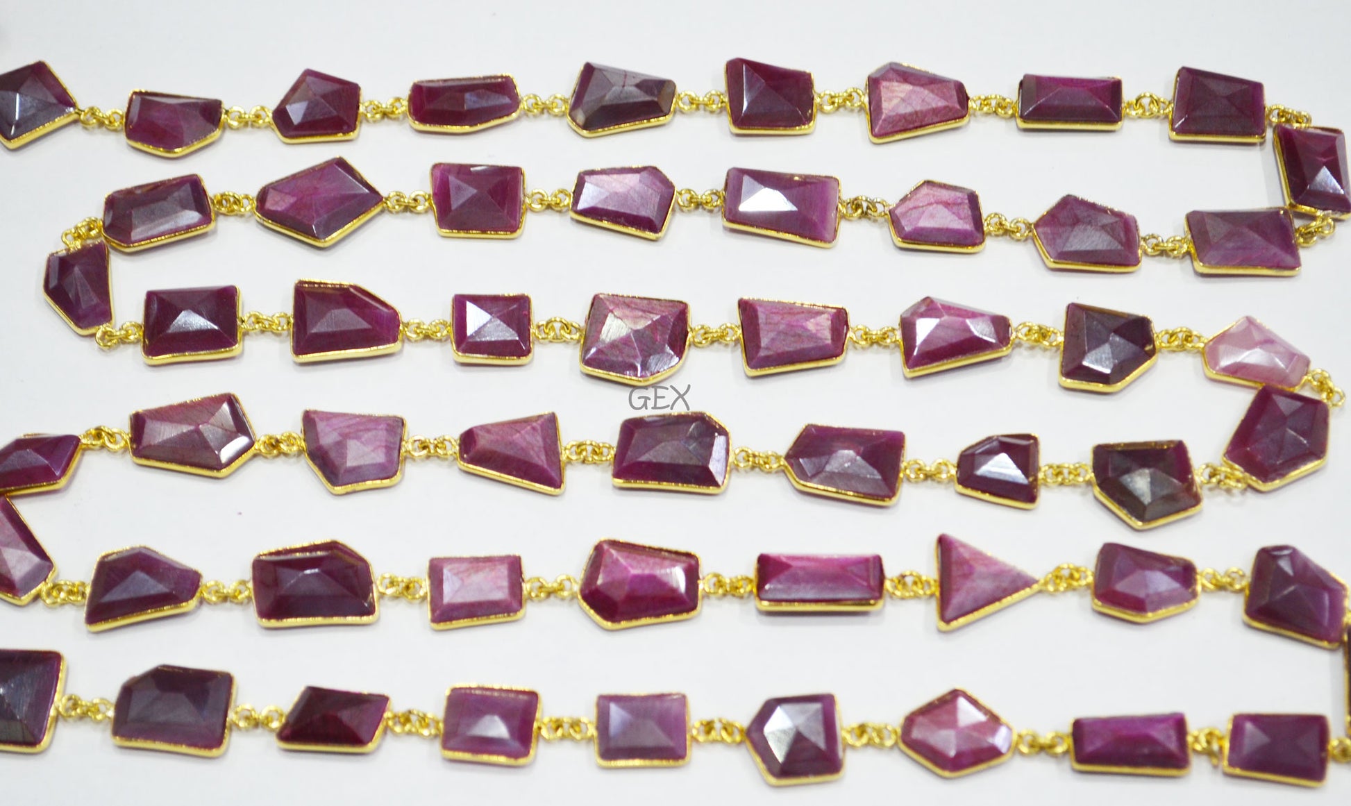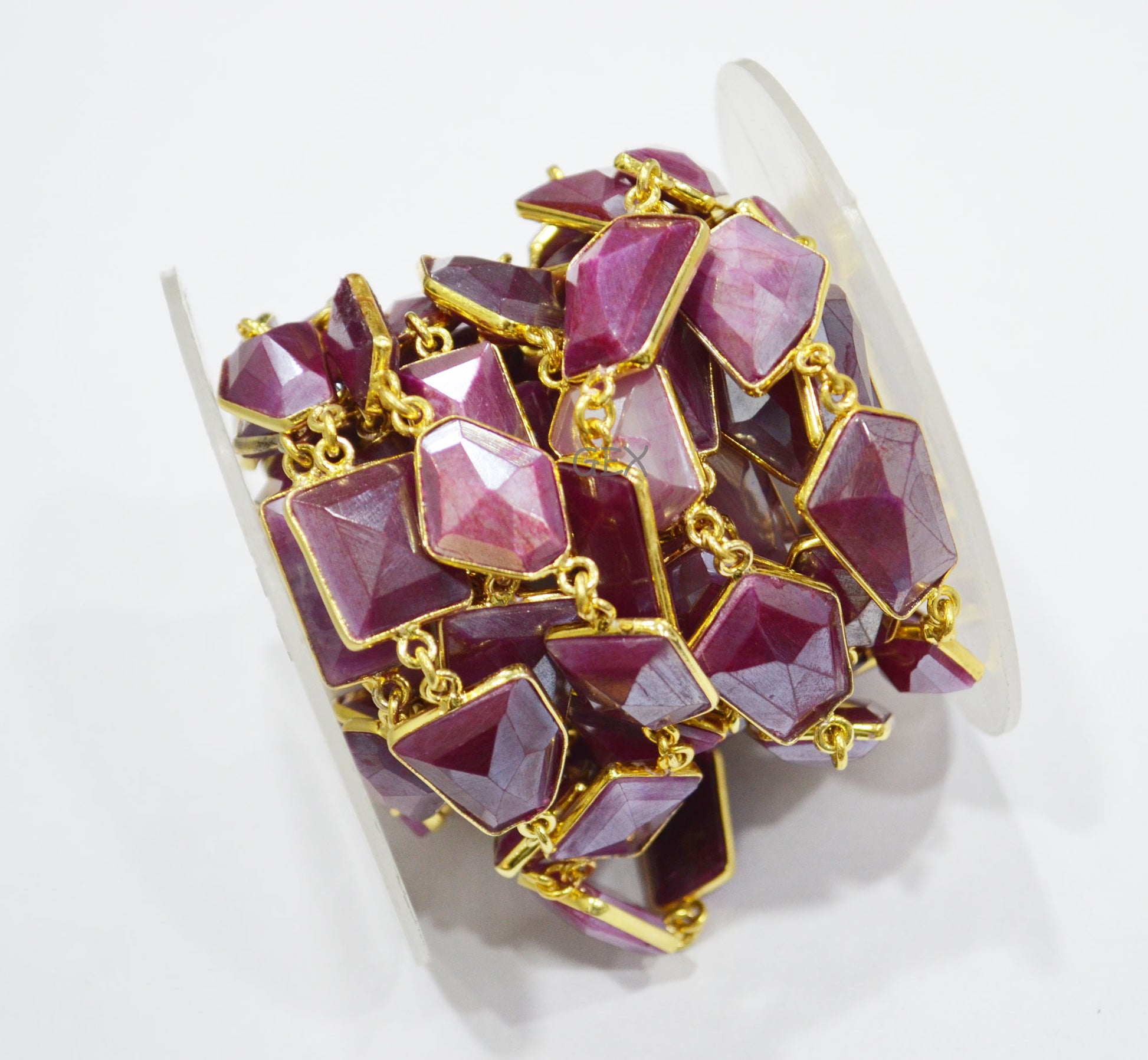 Ruby Colored Moonstone Faceted Fancy Cut Shape Connector Chain , Ruby Colored Moonstone Bezel Link Chain , 11x14 - 16x20 mm , RB-7157