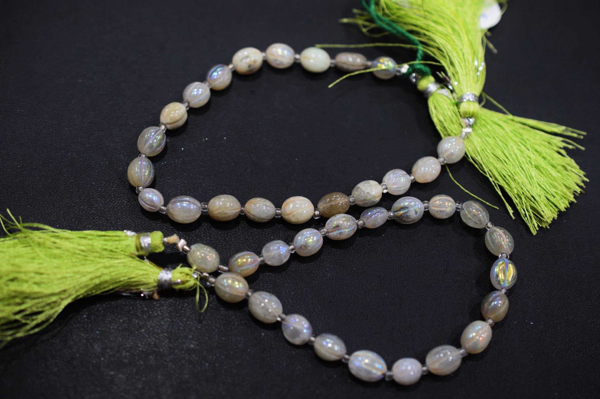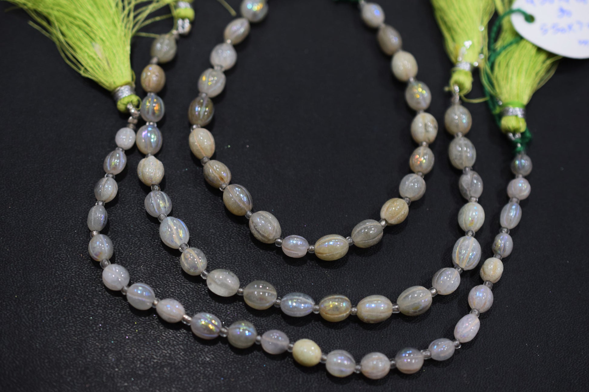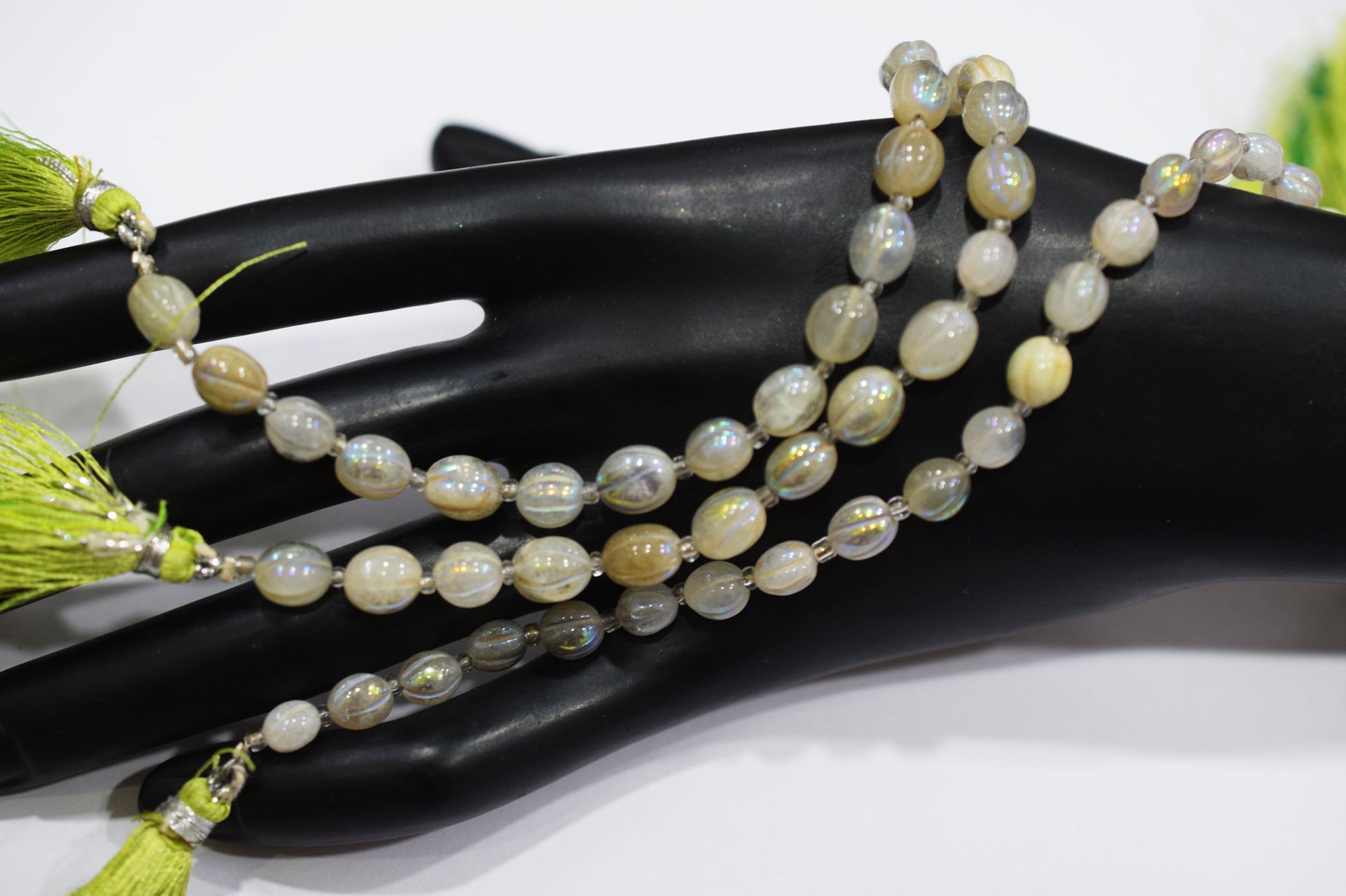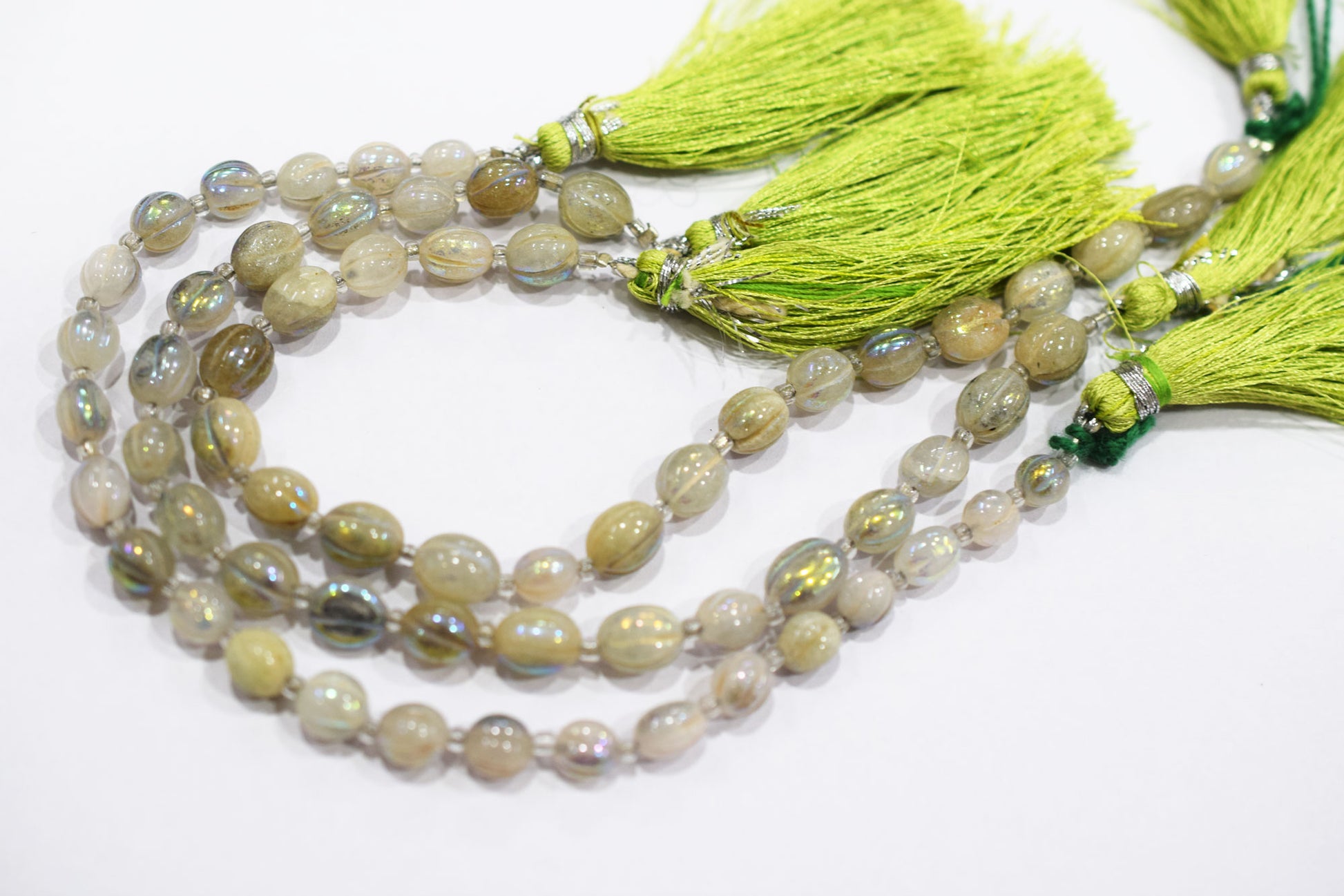 Rustic Metallic Coated Olive Green Coloured Quartz Oval Carved Melon Shape Beads , Olive Green Coloured Quartz Beads , Sold By Strand , 4.5x6 - 5.5x7 mm , 7 Inches , 20418