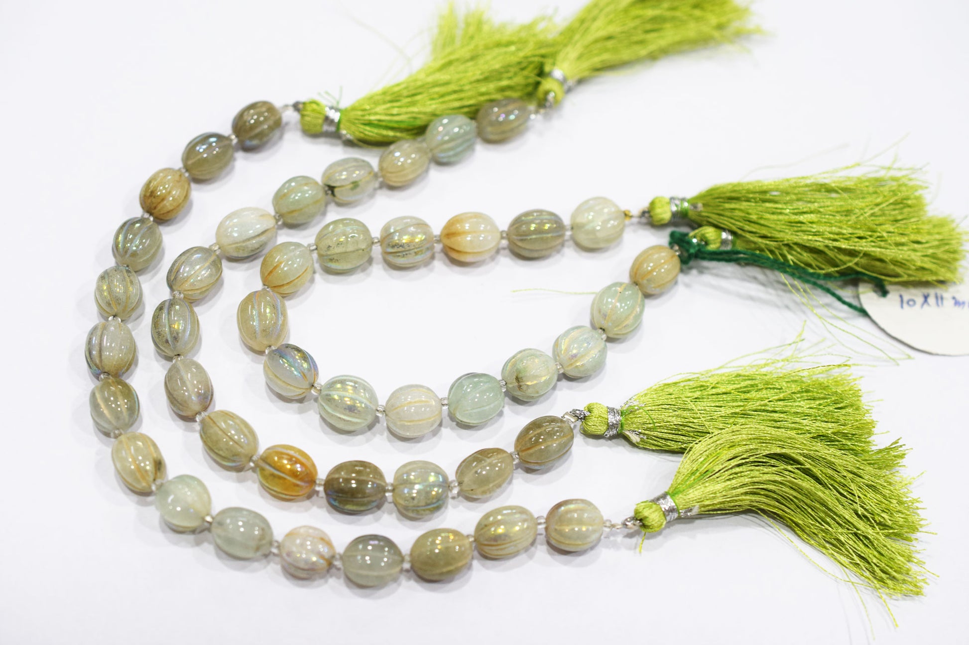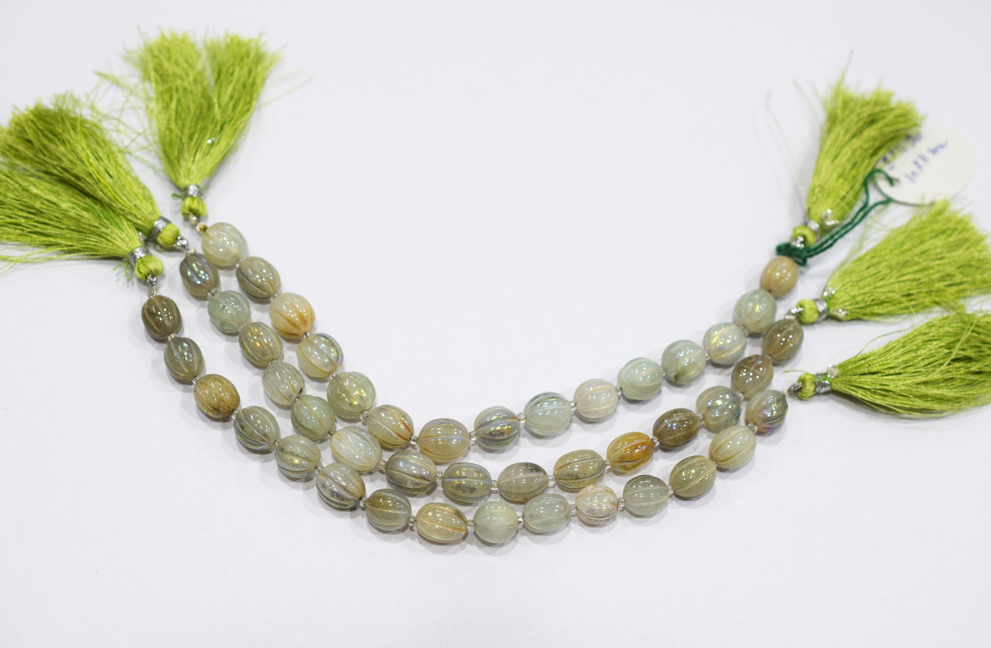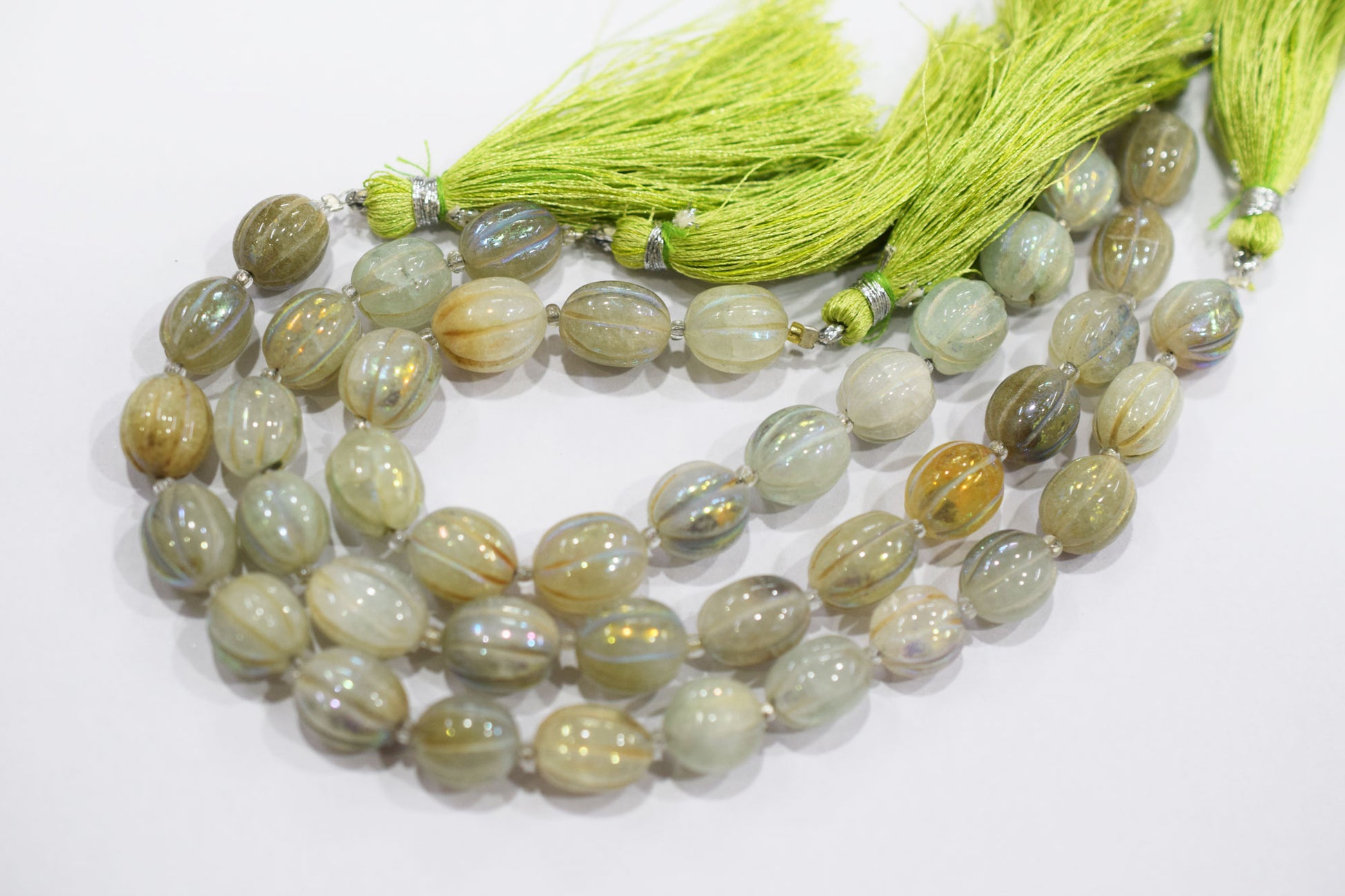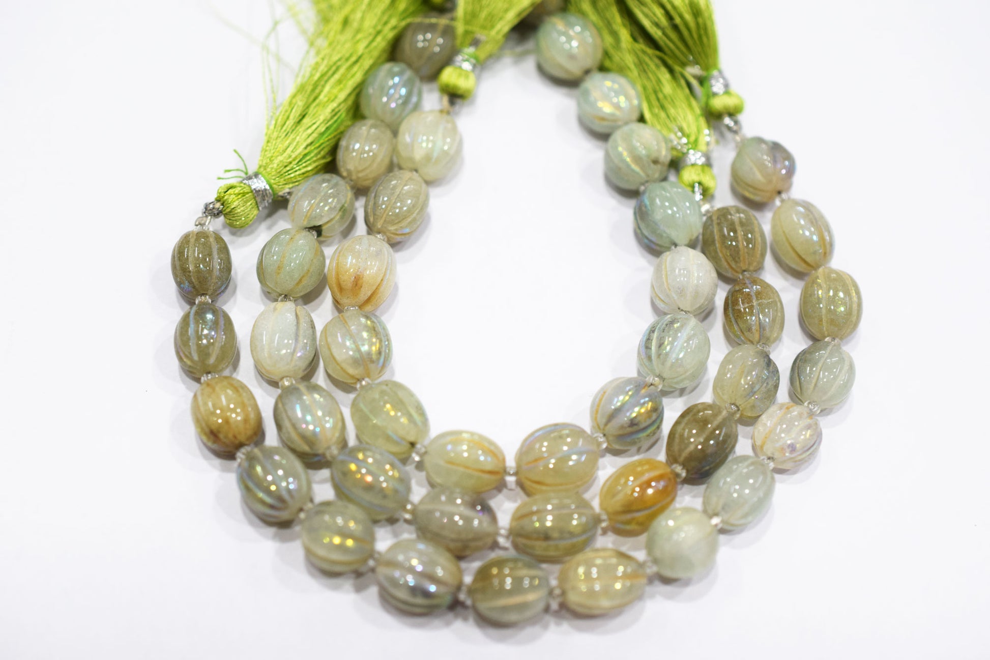 Rustic Metallic Coated Olive Green Coloured Quartz Oval Carved Melon Shape Beads , Olive Green Coloured Quartz Beads , Sold By Strand , 9x11 - 10x11 mm , 7 Inches , 20419