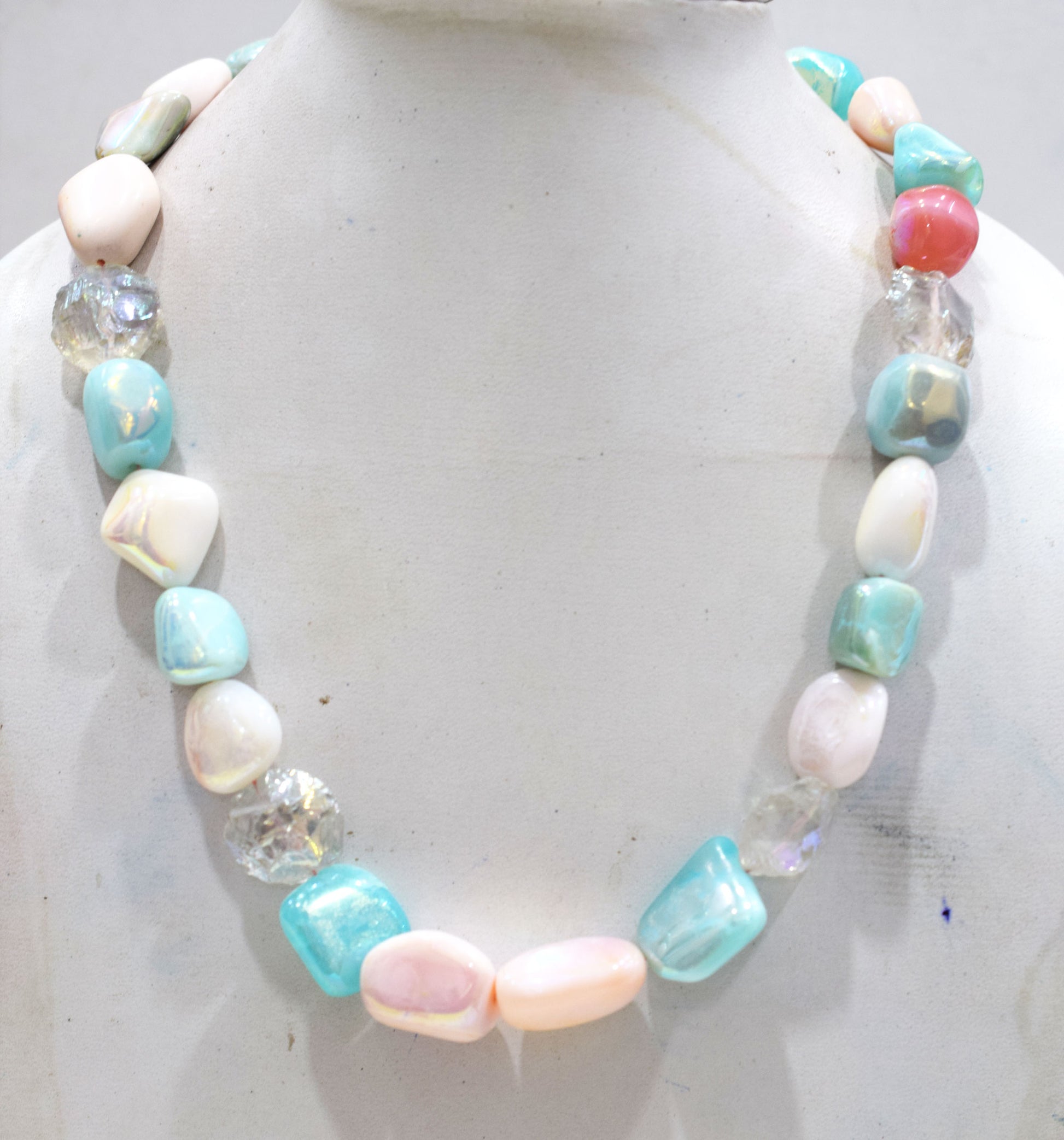 Rustic Metallic Coated Pink Opal With Blue Opal And Herkimer Diamond Necklace , 13x16 - 22x24 mm , 18" , 20506