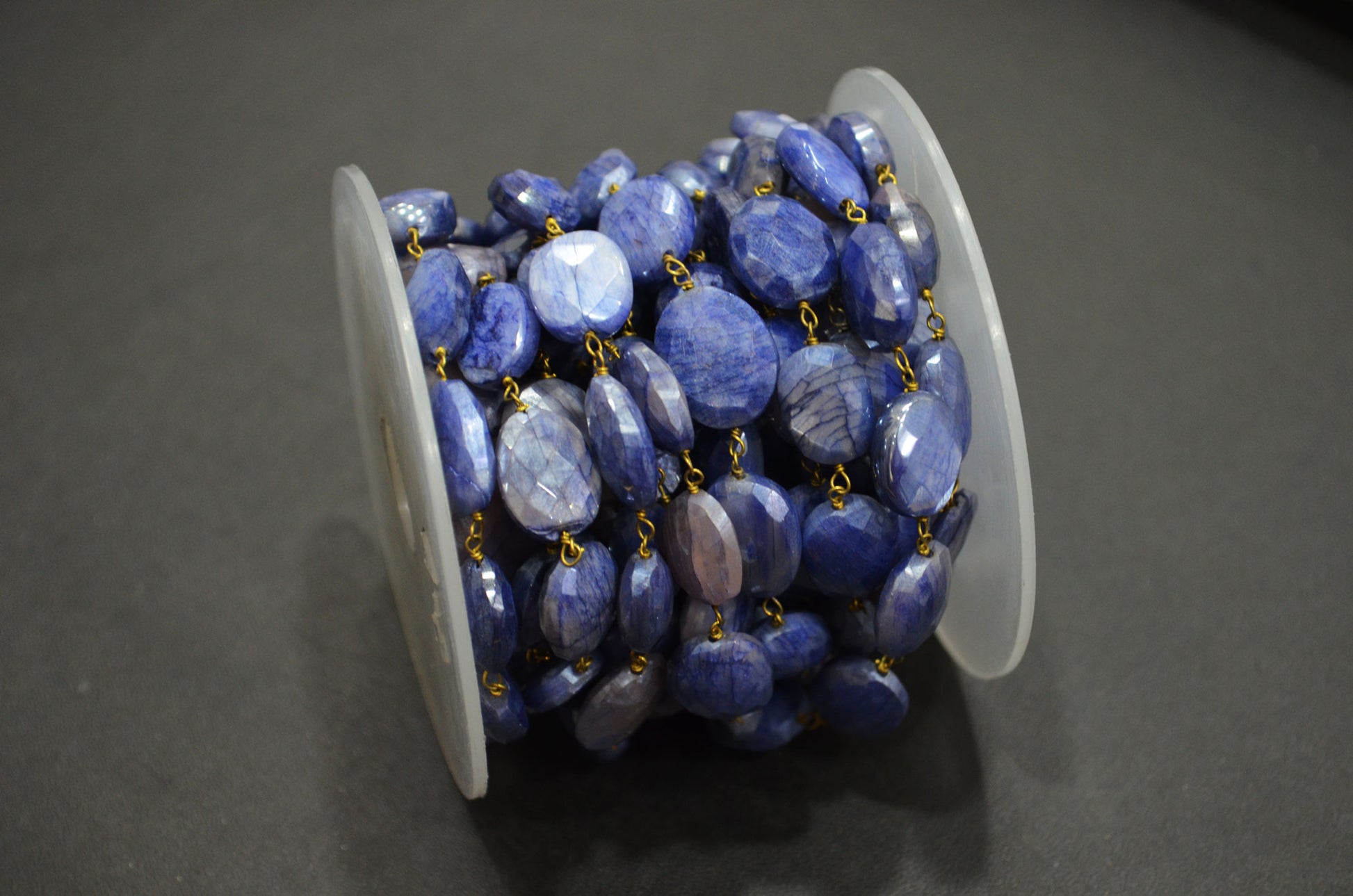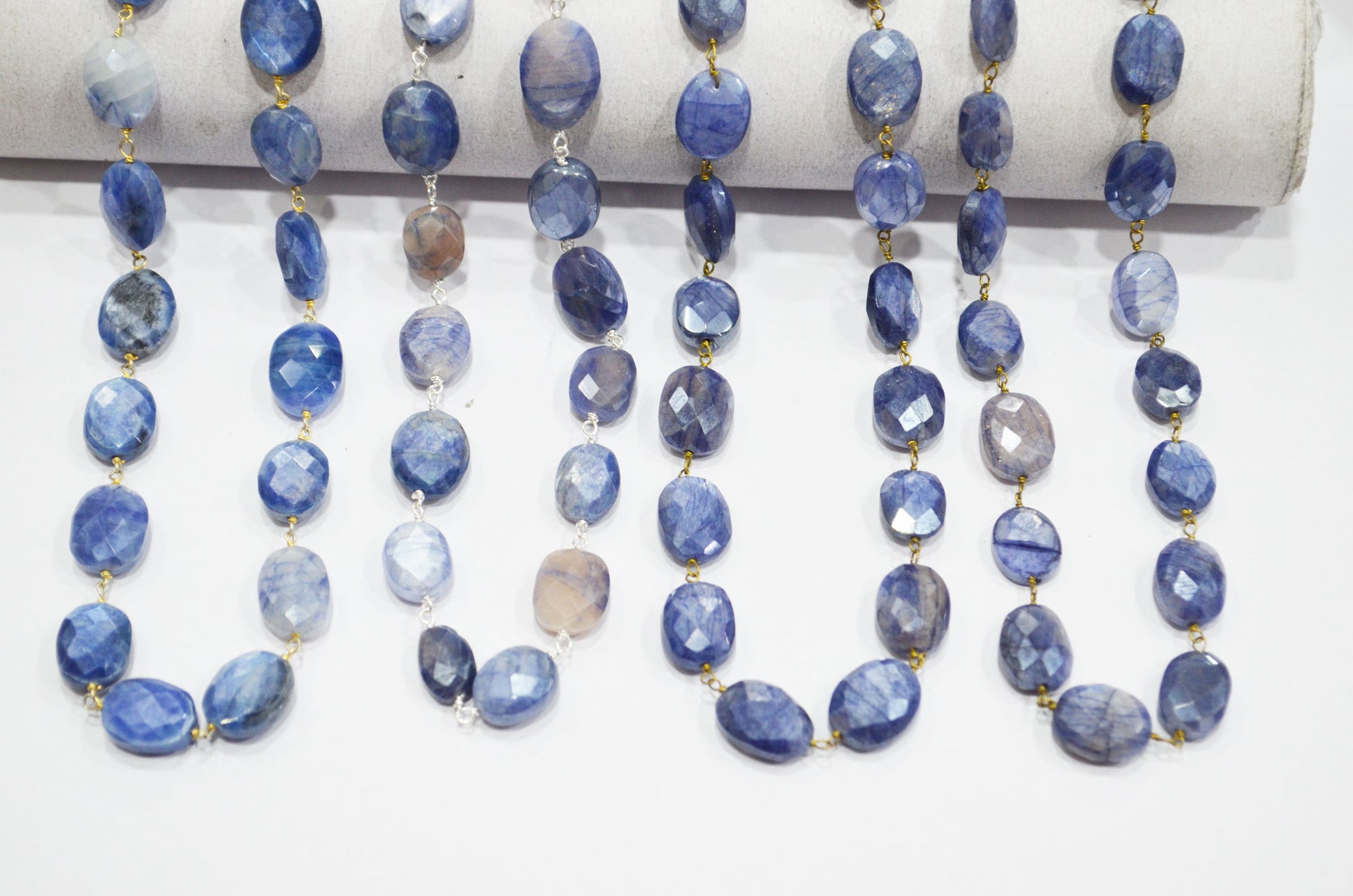 Sapphire Colored Moonstone Faceted Oval Shape Rosary Beaded Chain , Coated Sapphire Colored Moonstone Wire Wrapped Chain , 9 - 13 mm , RB-5871