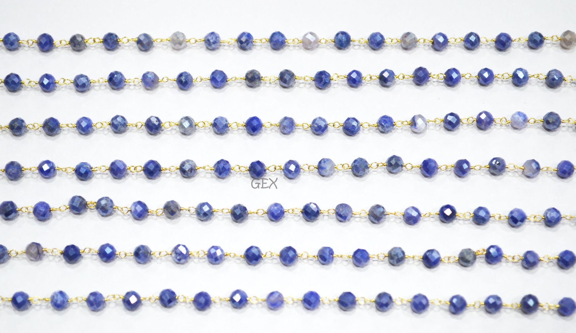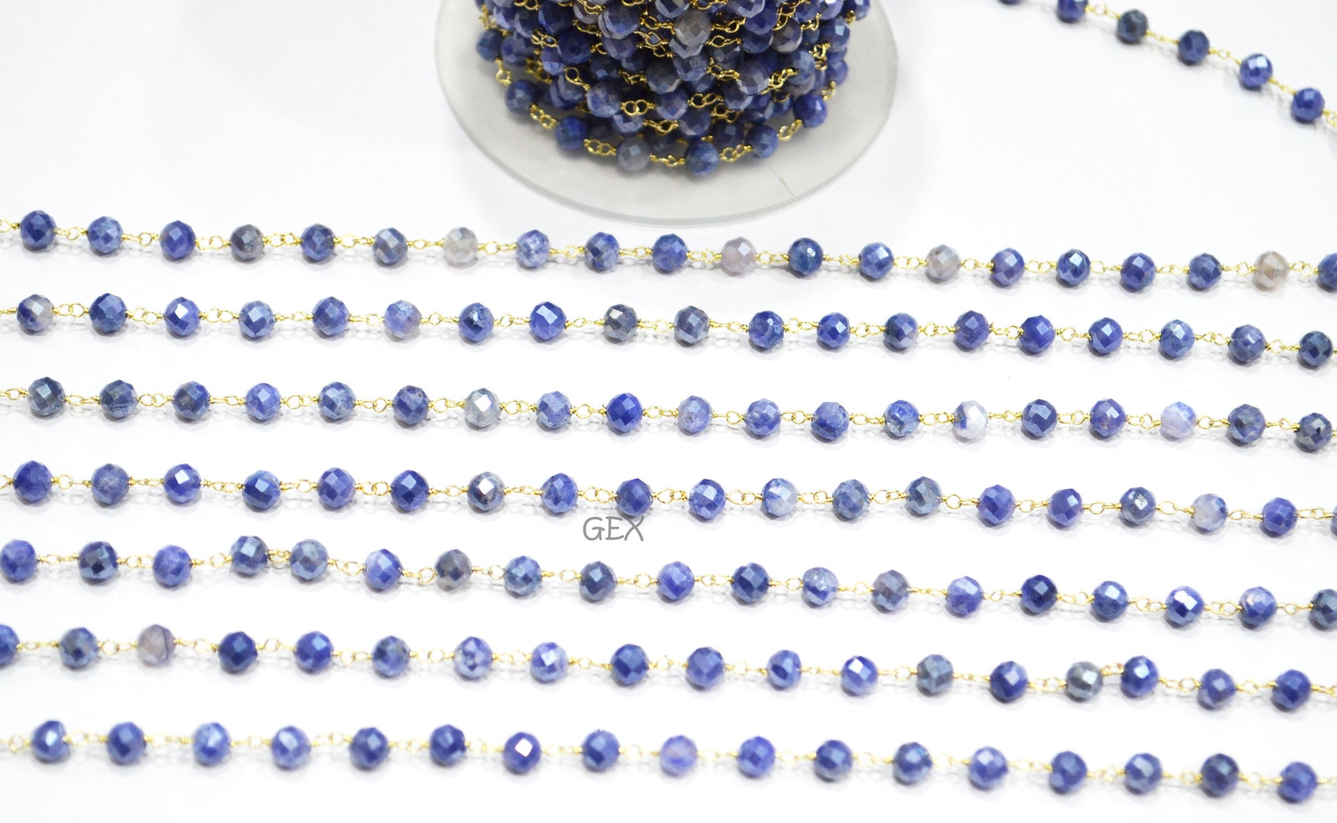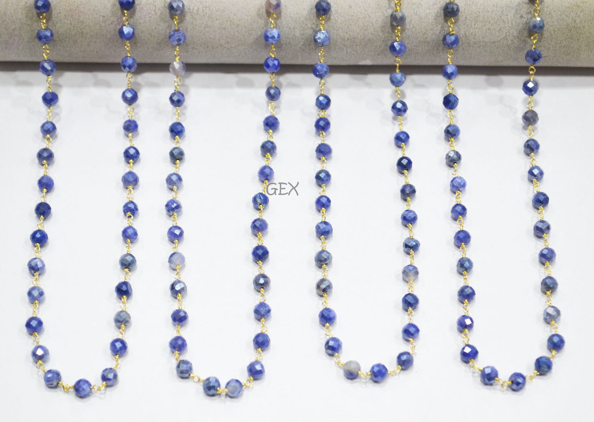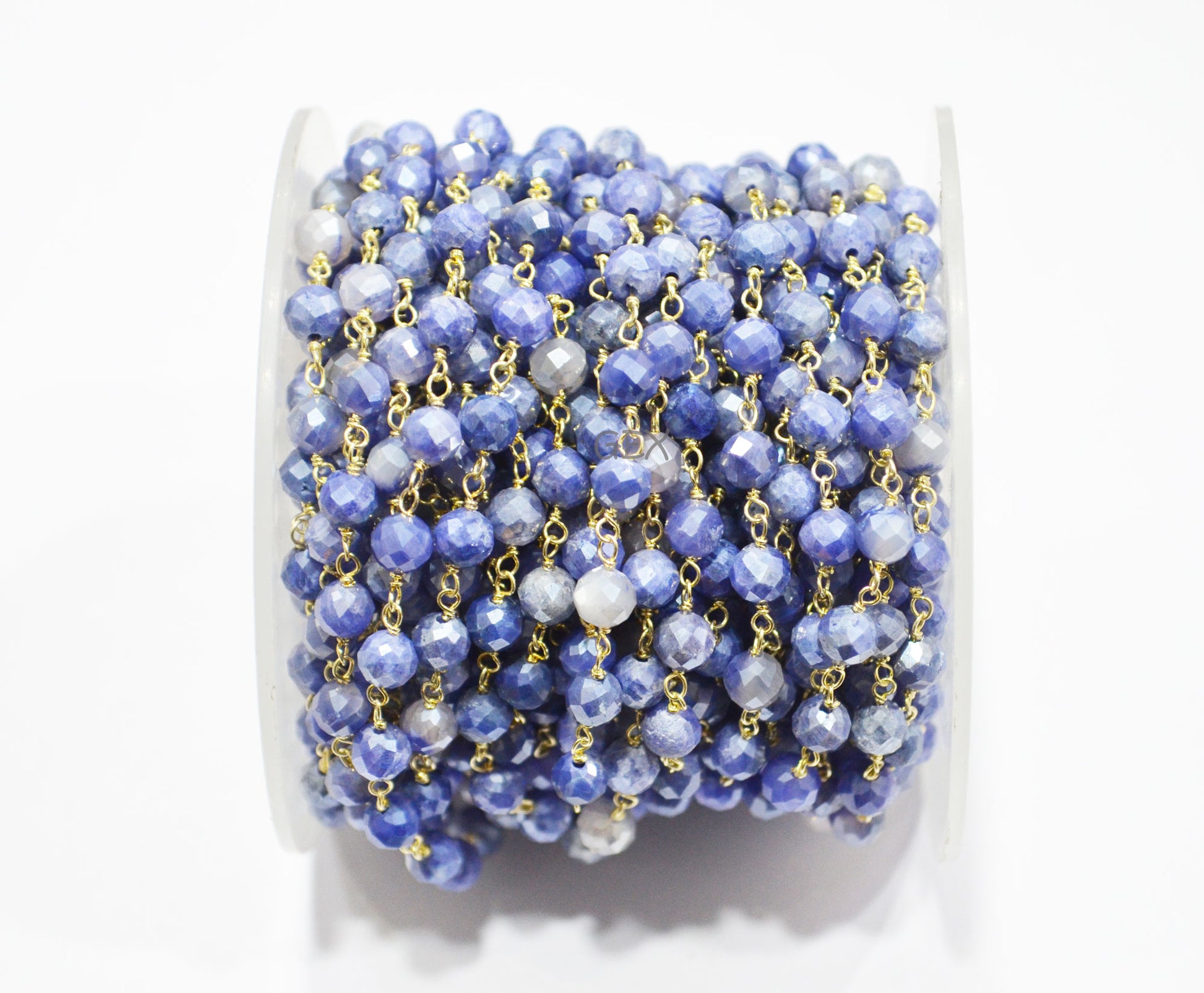 Sapphire Colored Moonstone Faceted Round Shape Rosary Beaded Chain , Sapphire Colored Moonstone Wire Wrapped Chain , 5 mm , RB-7185