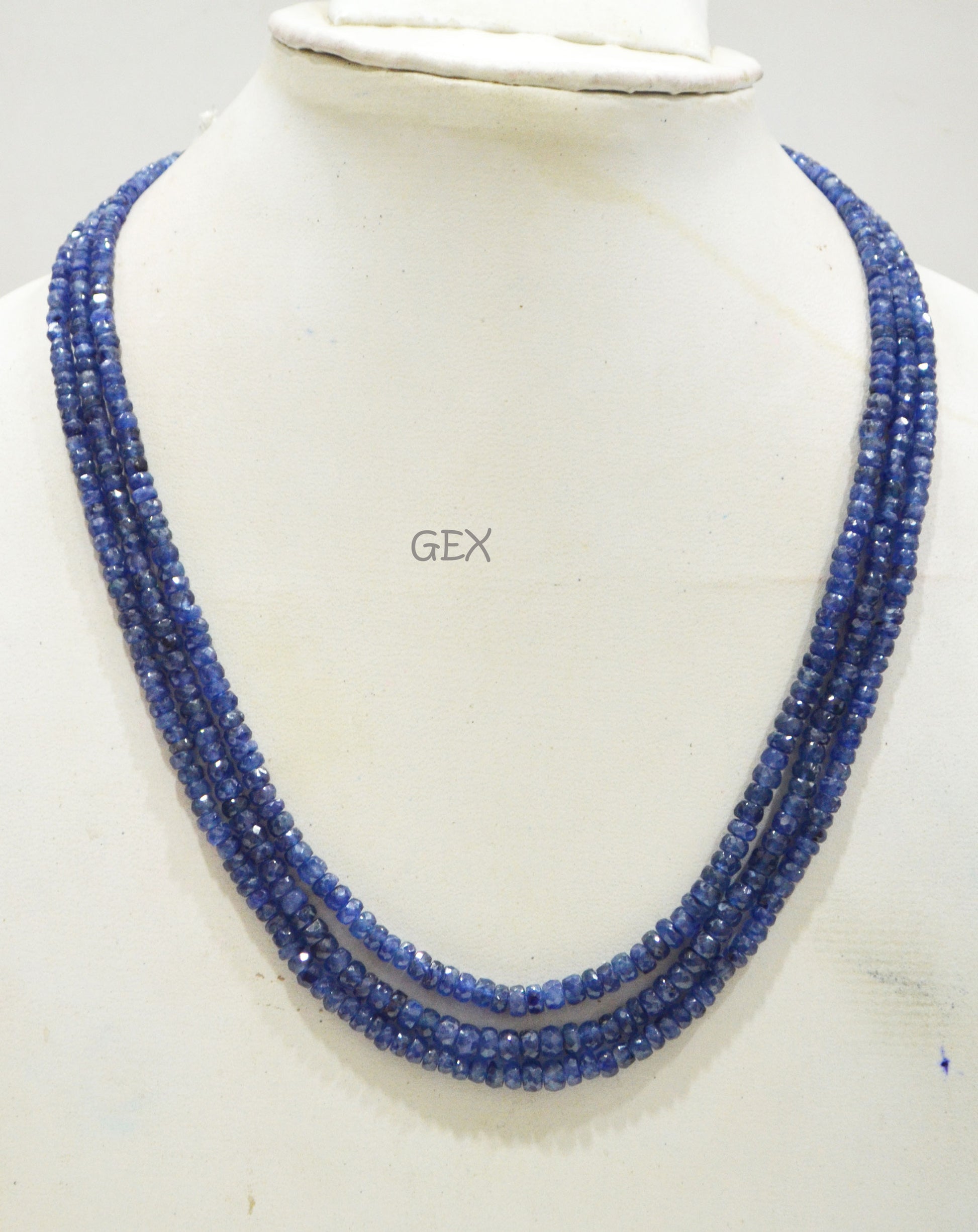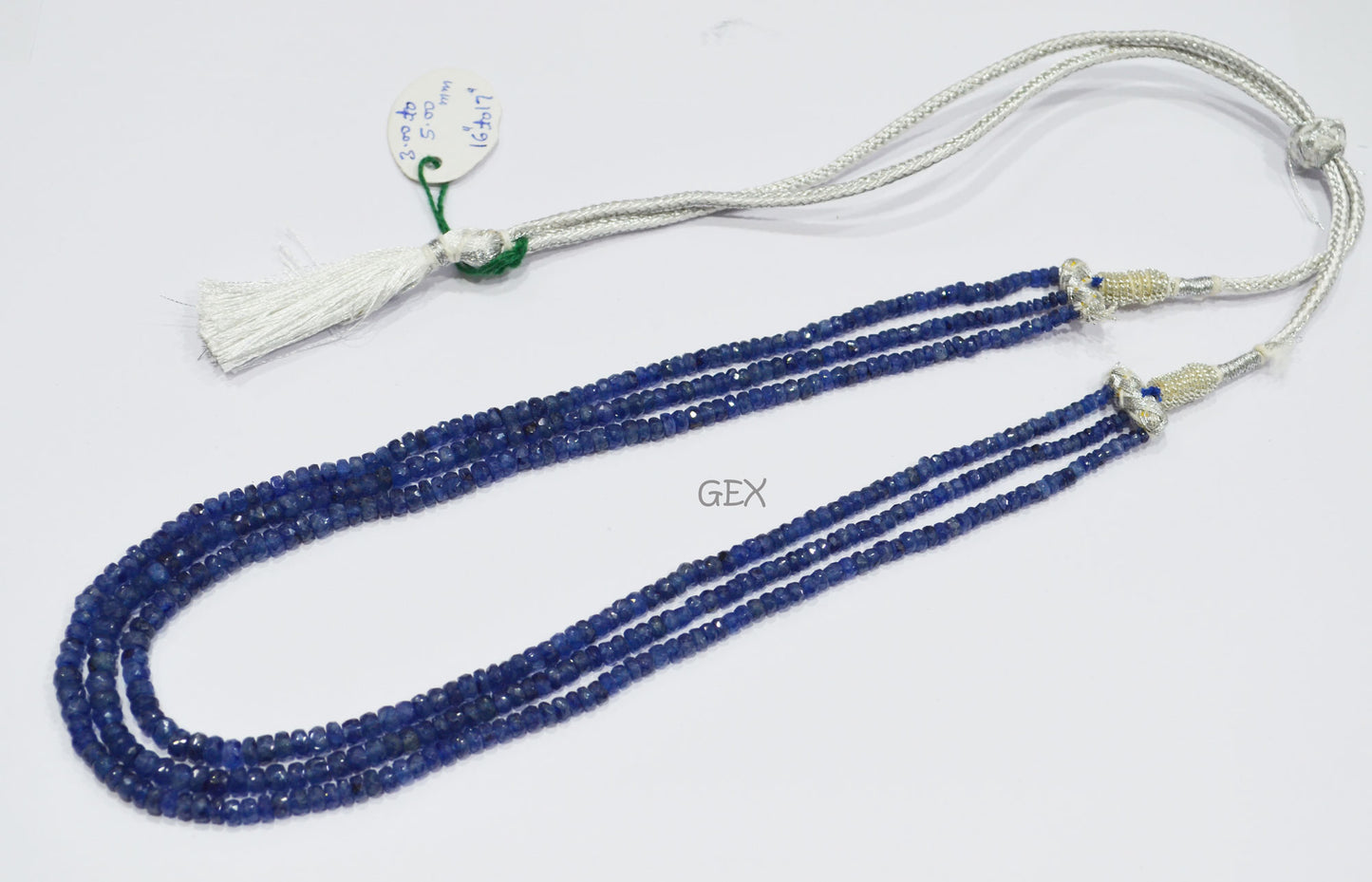 Sapphire Glass Filled Faceted Rondelle Shape Necklace , Sapphire Glass Filled 3 Line Necklace 16 - 17 Inches Long With Adjustable Tussle , 3 - 5 mm , 32038
