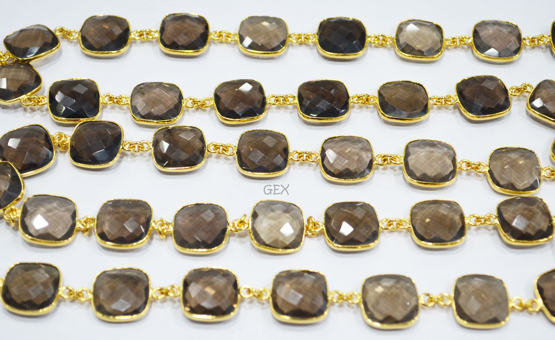 Smoky Faceted Cushion Shape Connector Chain , Smoky Cushion Shape Bezel Link Chain , 15 - 16 mm , RB-6739
