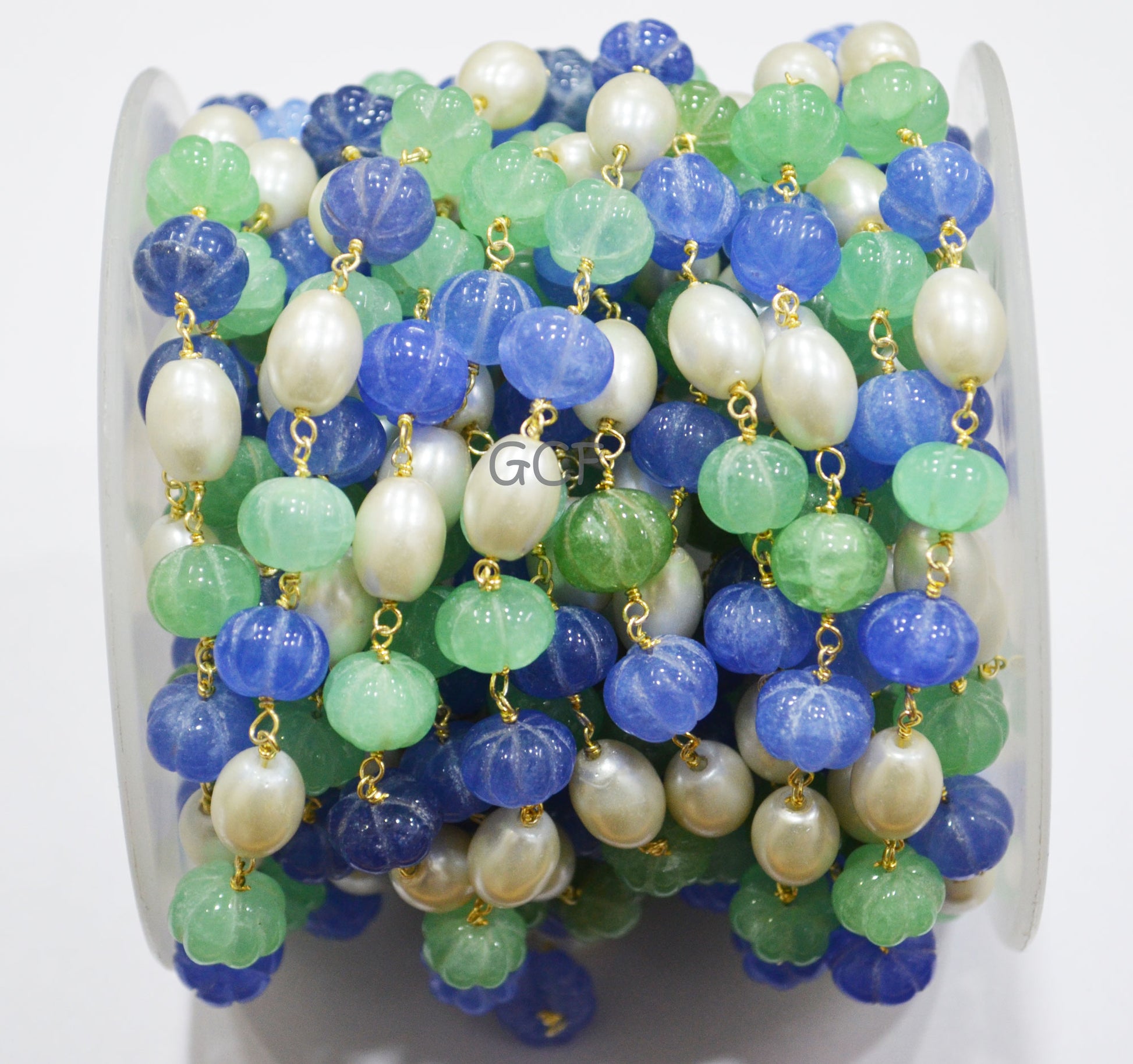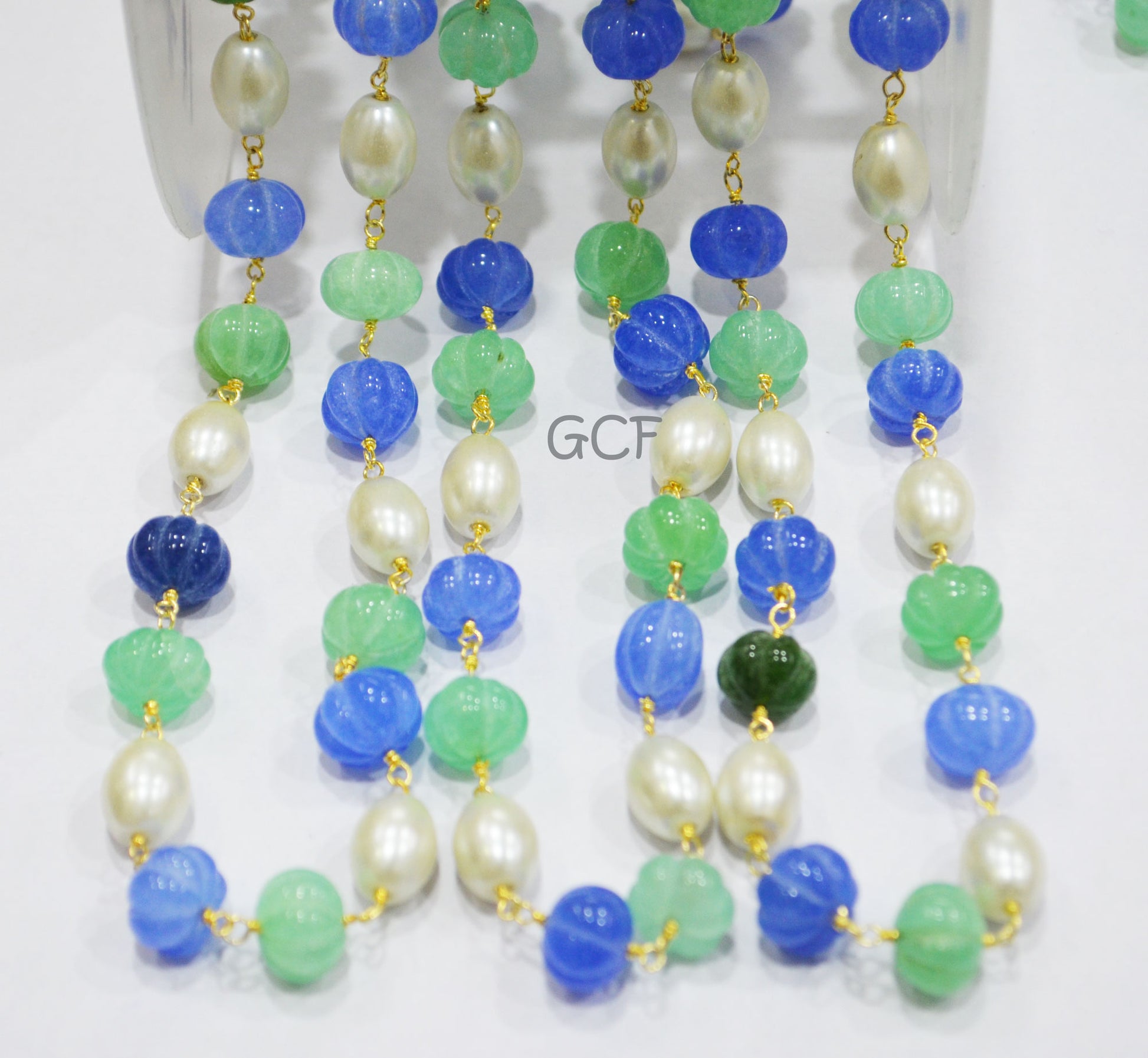 Tanzanite Dyed Quartz And Natural Emerald Carved Melons With Hydro Pearl Smooth Capsule Rosary Beaded Chain , 9 - 10 mm ,6888