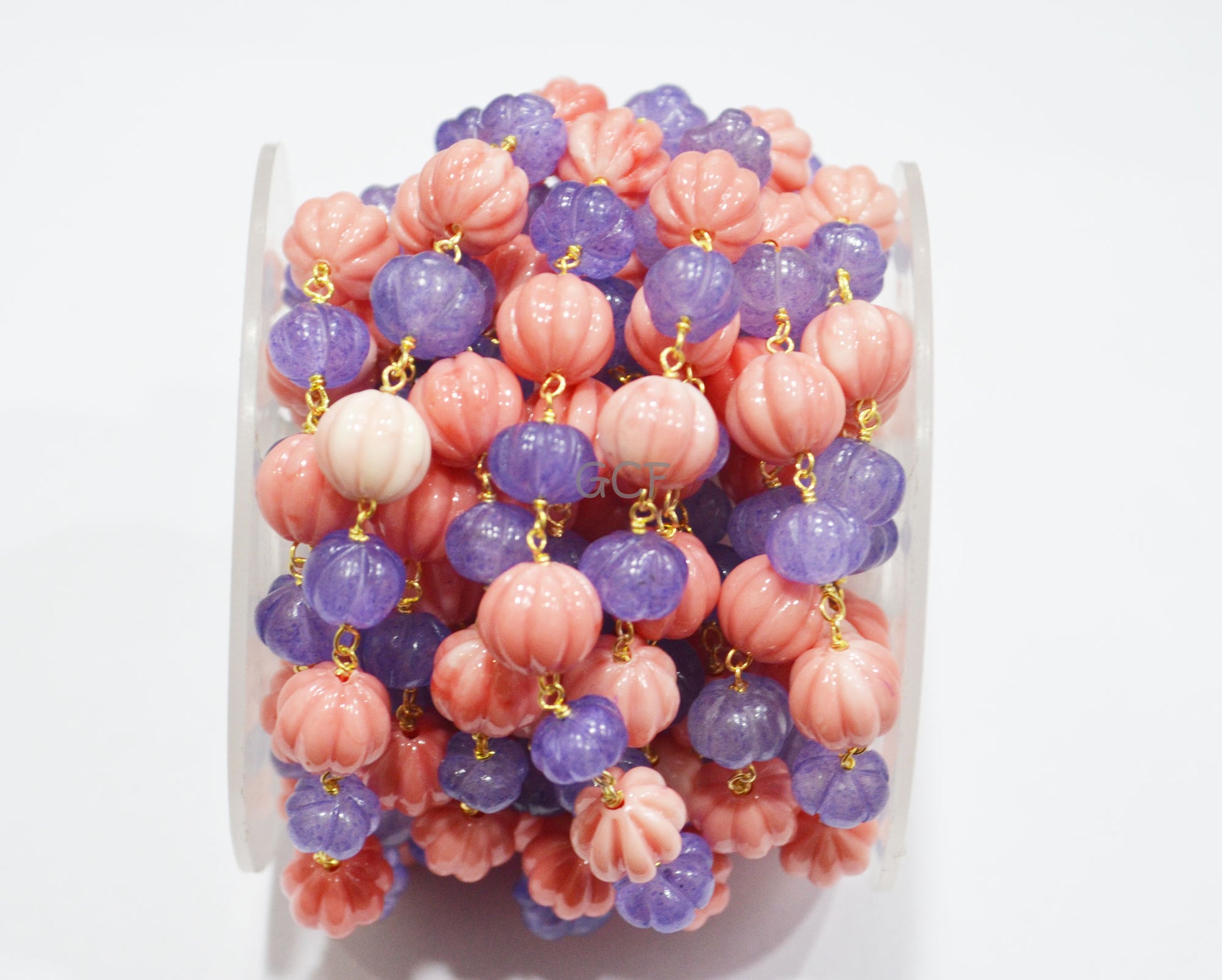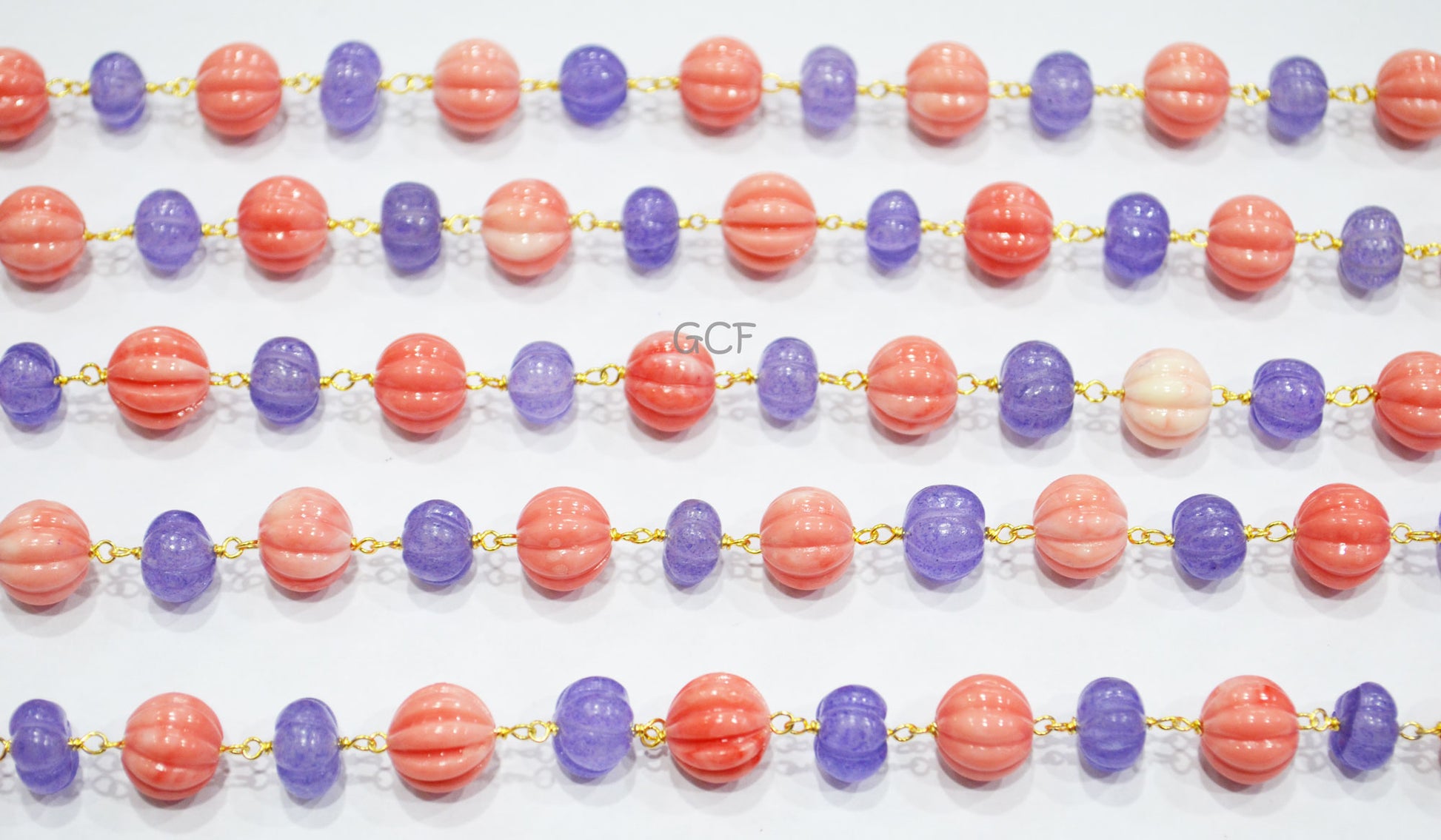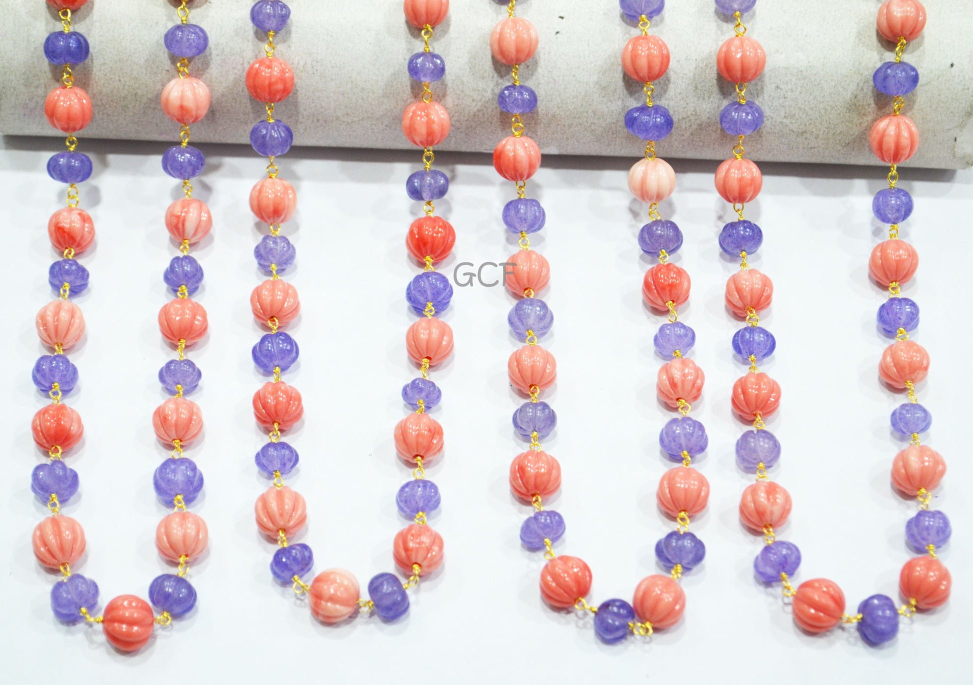 Tanzanite Quartz Carved Melon Shape Rosary Beaded Chain , Ceramic Coral Carved Melon Wire Wrapped Chain , 8 - 10 mm , RB-7134
