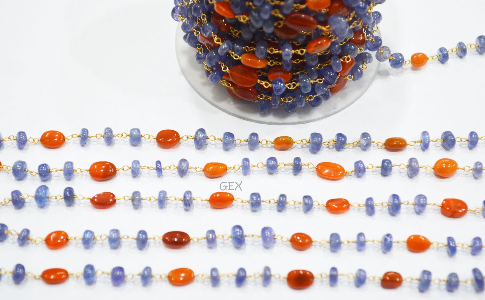 Tanzanite Uneven Rondelle Smooth Rosary Beaded Chain , Orange Ethiopian Opal Oval Nuggets Wire Wrapped Chain , 5 - 9 mm ,6736