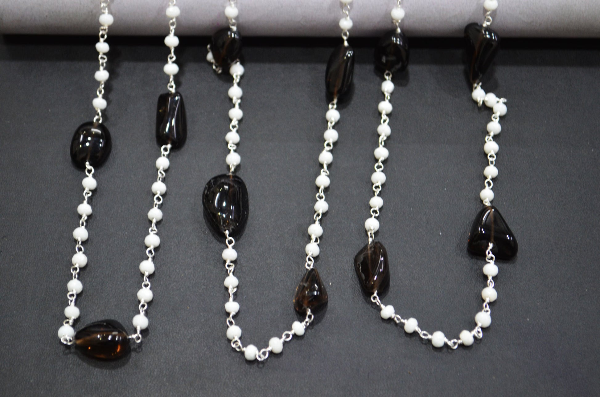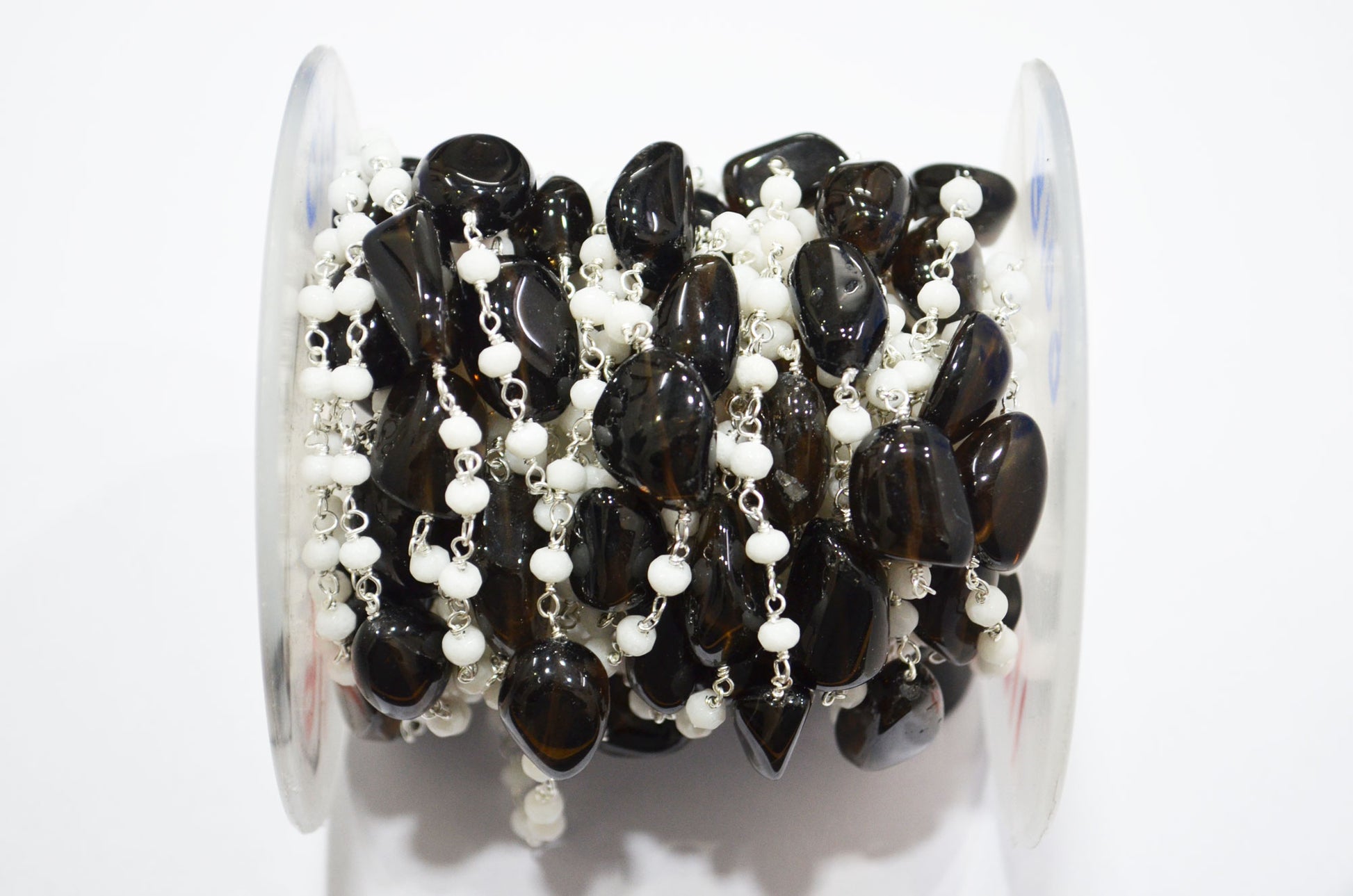 White Jade Faceted Rondelle Shape Rosary Beaded Chain , Black Smoky Quartz Smooth Nuggets Wire Wrapped Chain , 4 mm , RB-6018