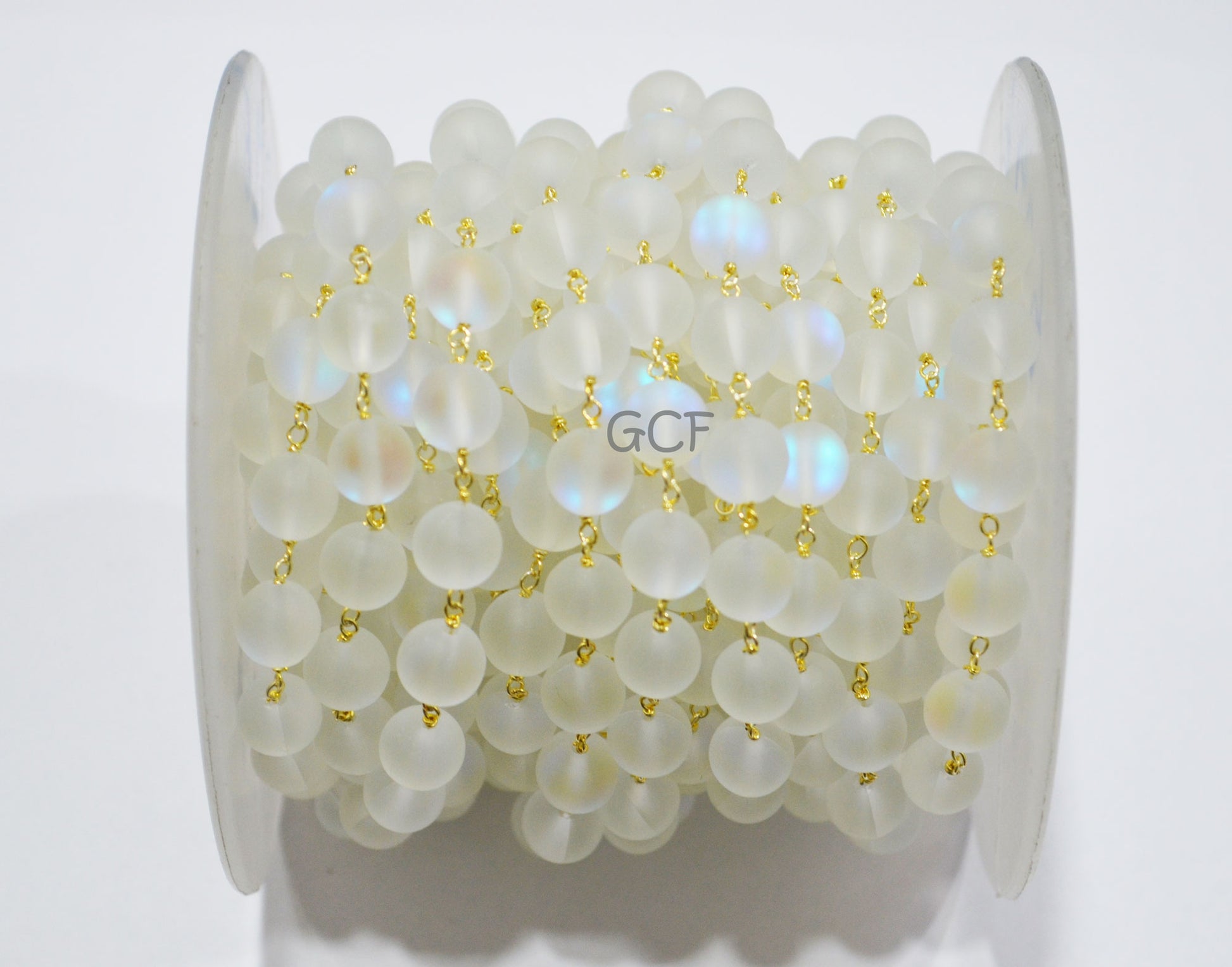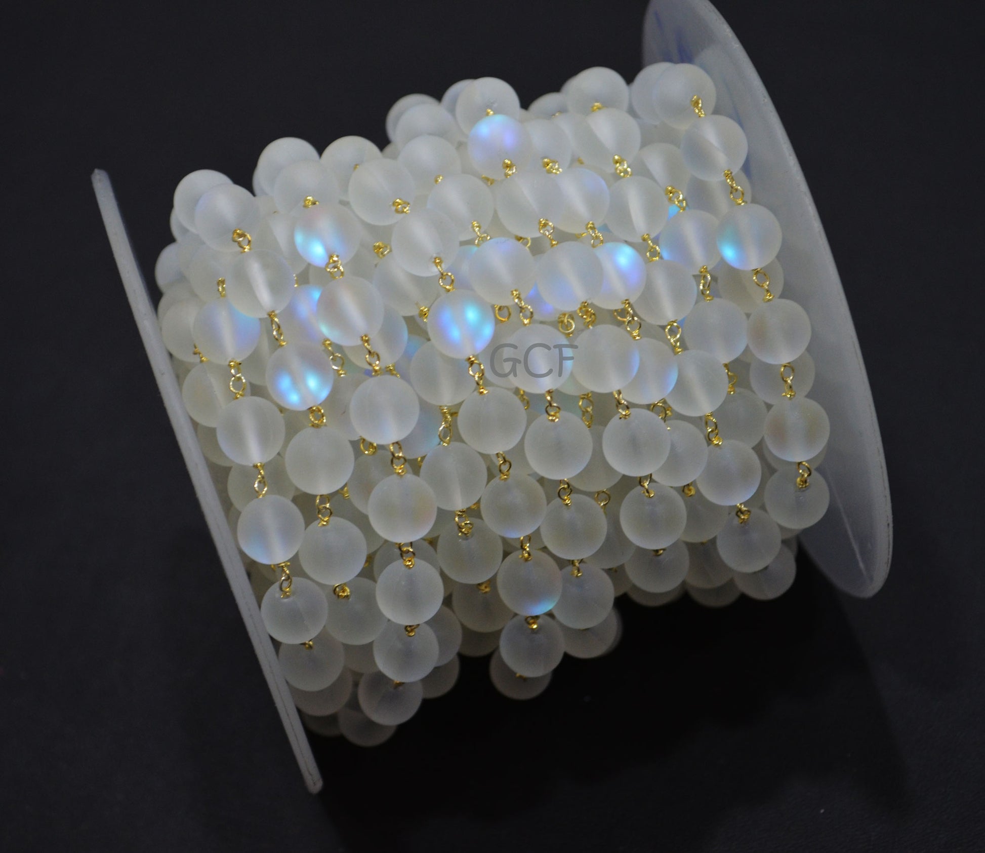 White Moonstone Doublet Hydro Glass Smooth Rosary Beaded Chain , White Doublet Hydro Glass Round Shape Wire Wrapped Chain , 8 mm , RB-7113